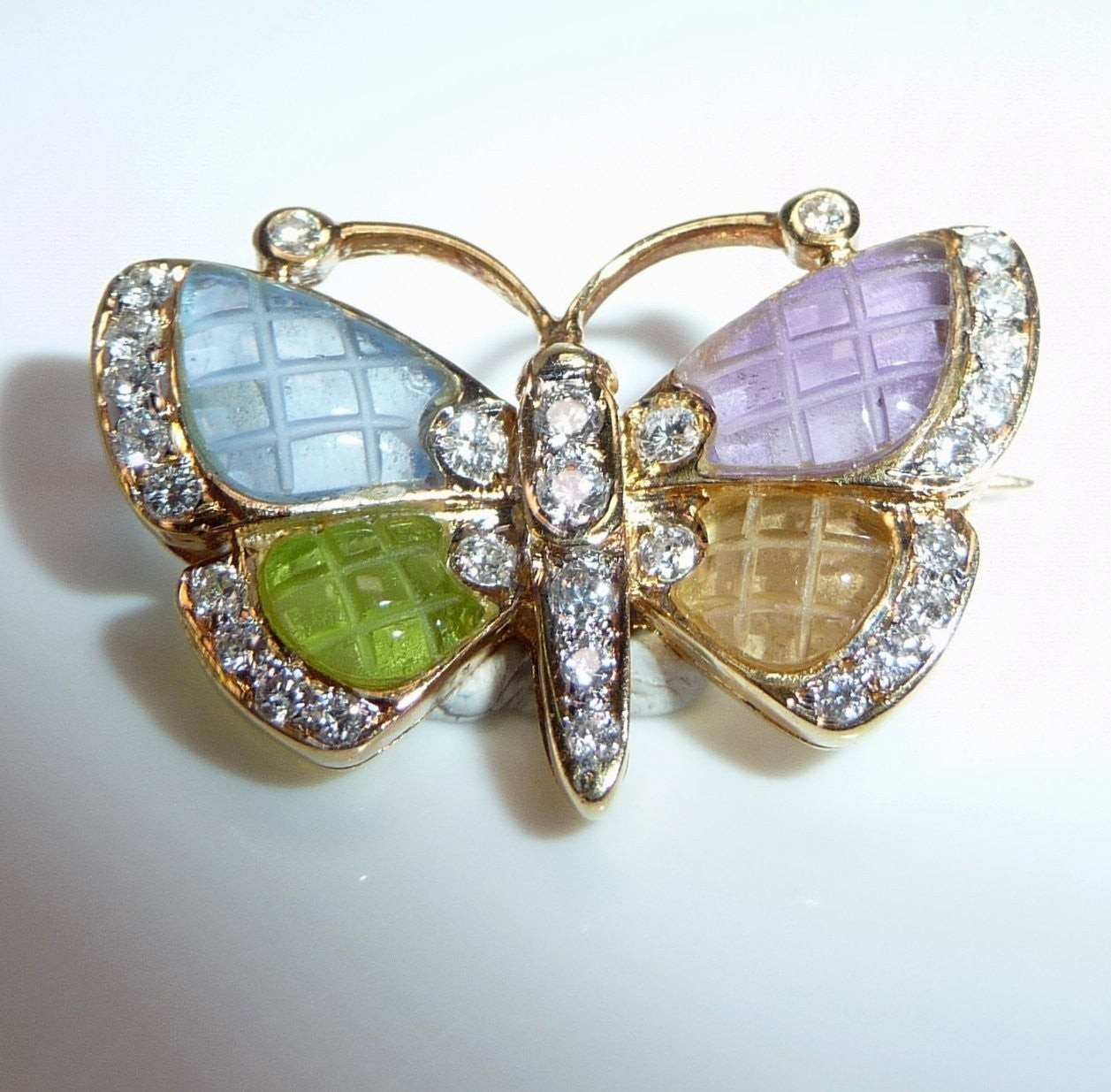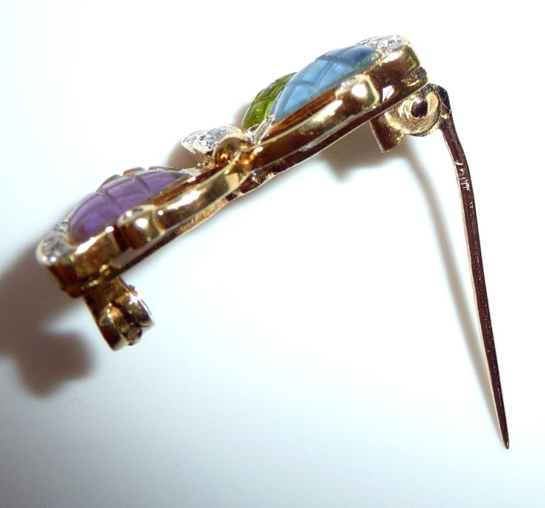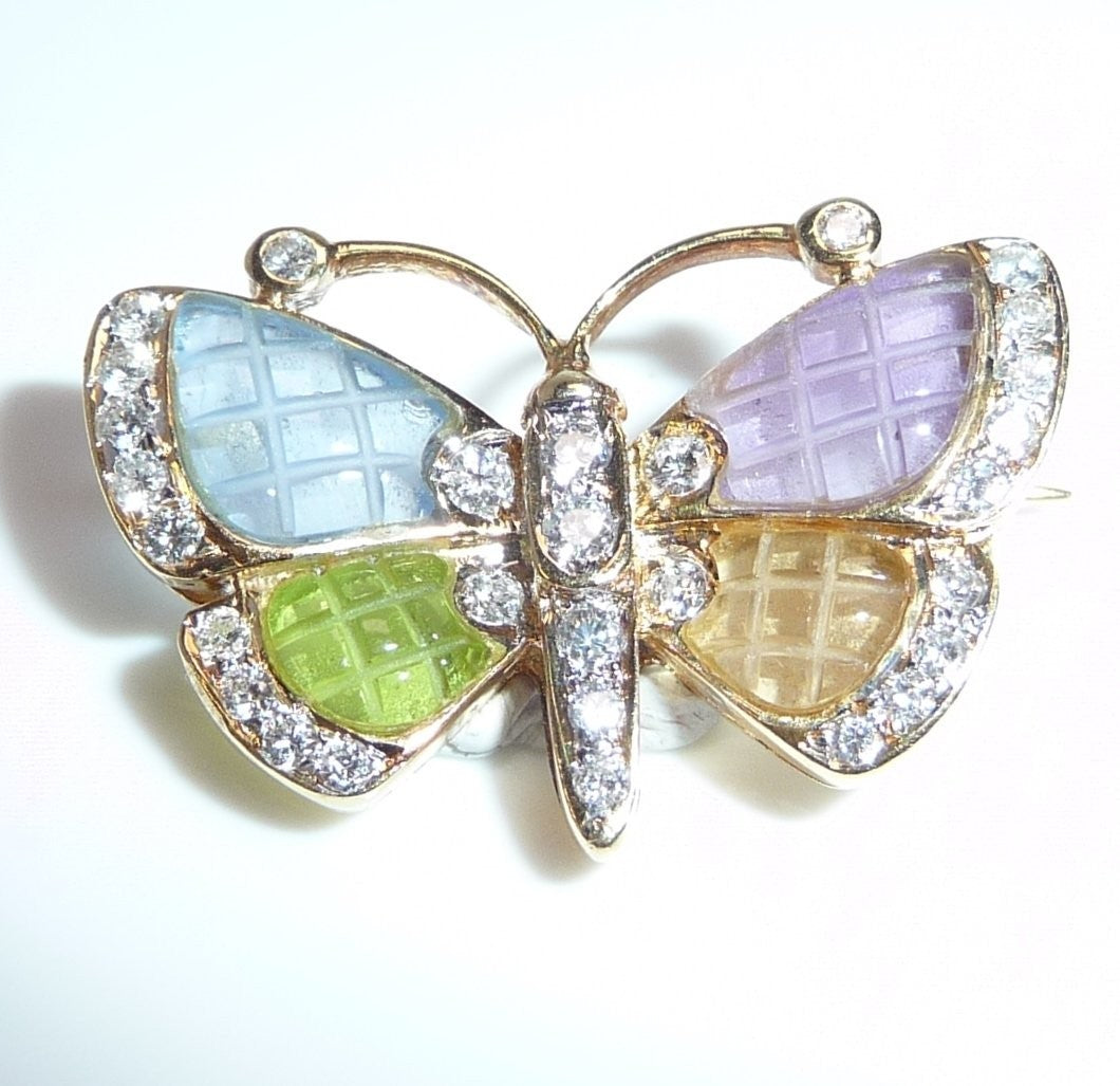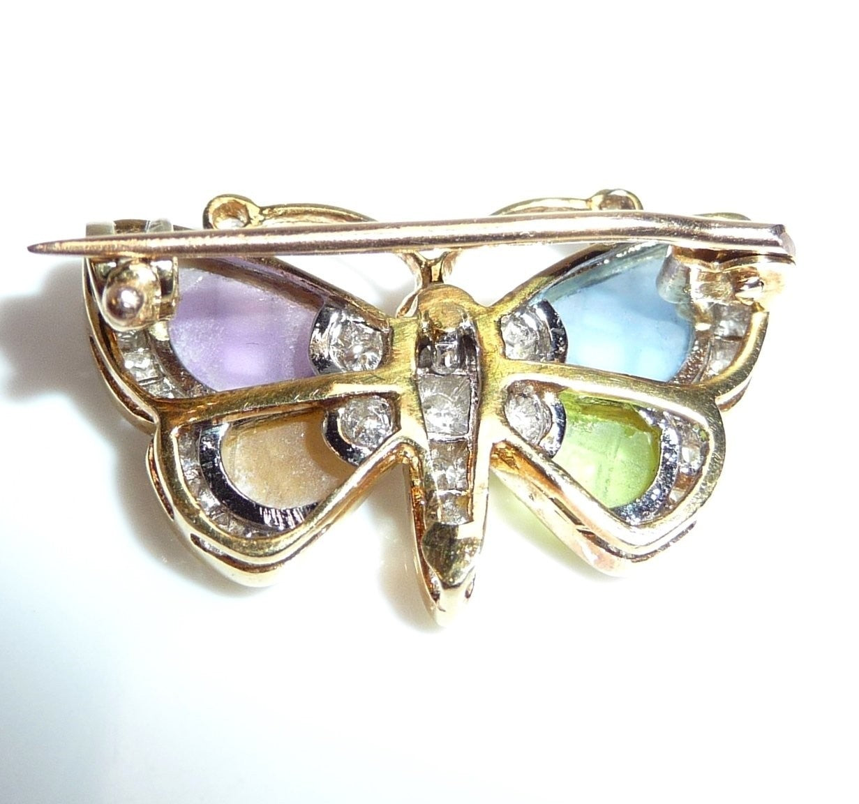 Der Schmetterling wird durch unterschiedliche Edelsteine dargestellt, die zusammen etwa 1.20 ct. haben. Dabei sind: Peridot, Citrin, Blauer Topas, Amethyst. Die Edelsteine sind mit einem Muster graviert und leicht gewölbt.