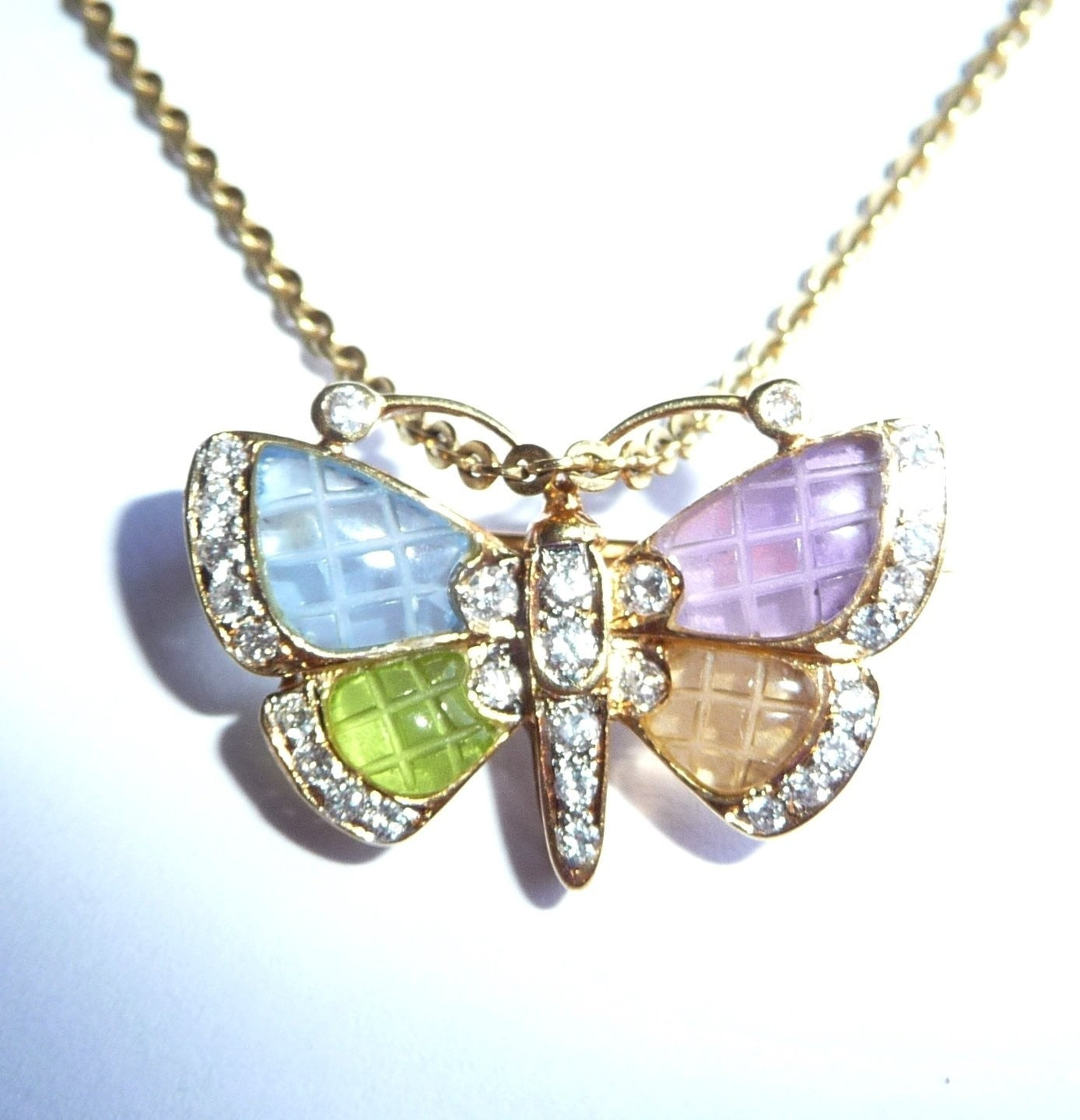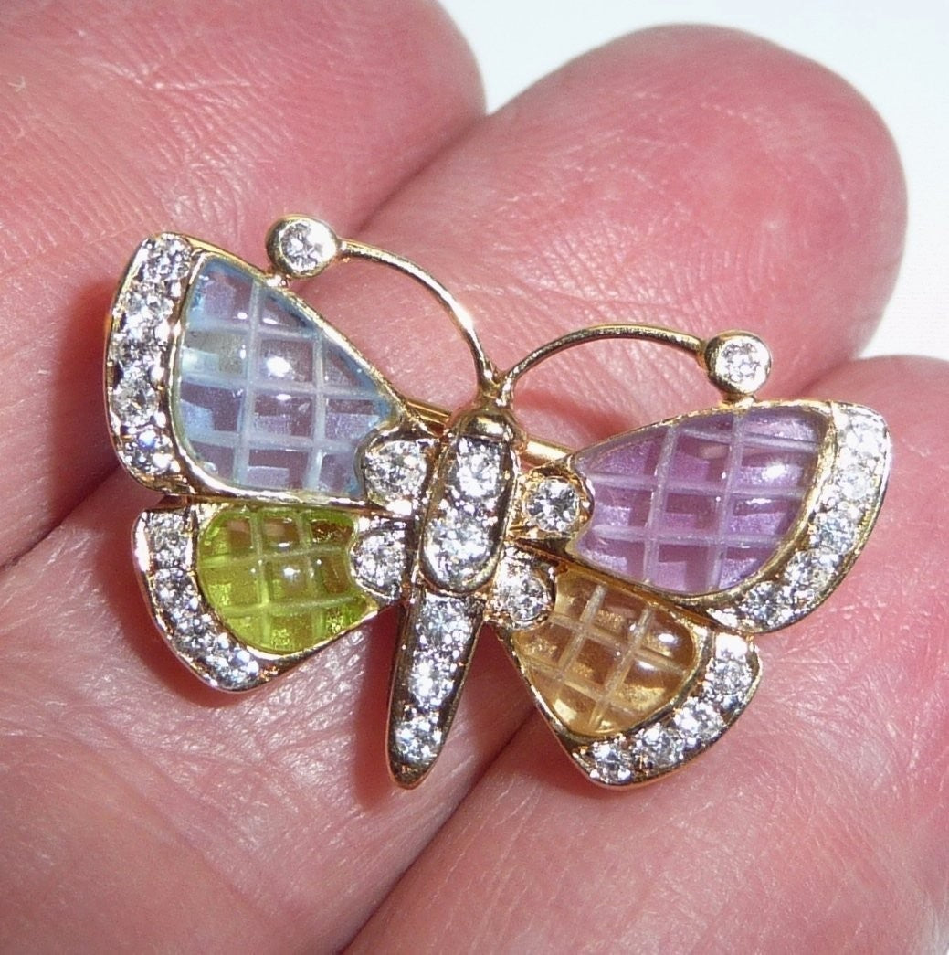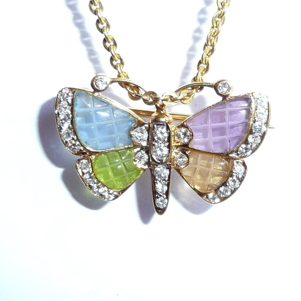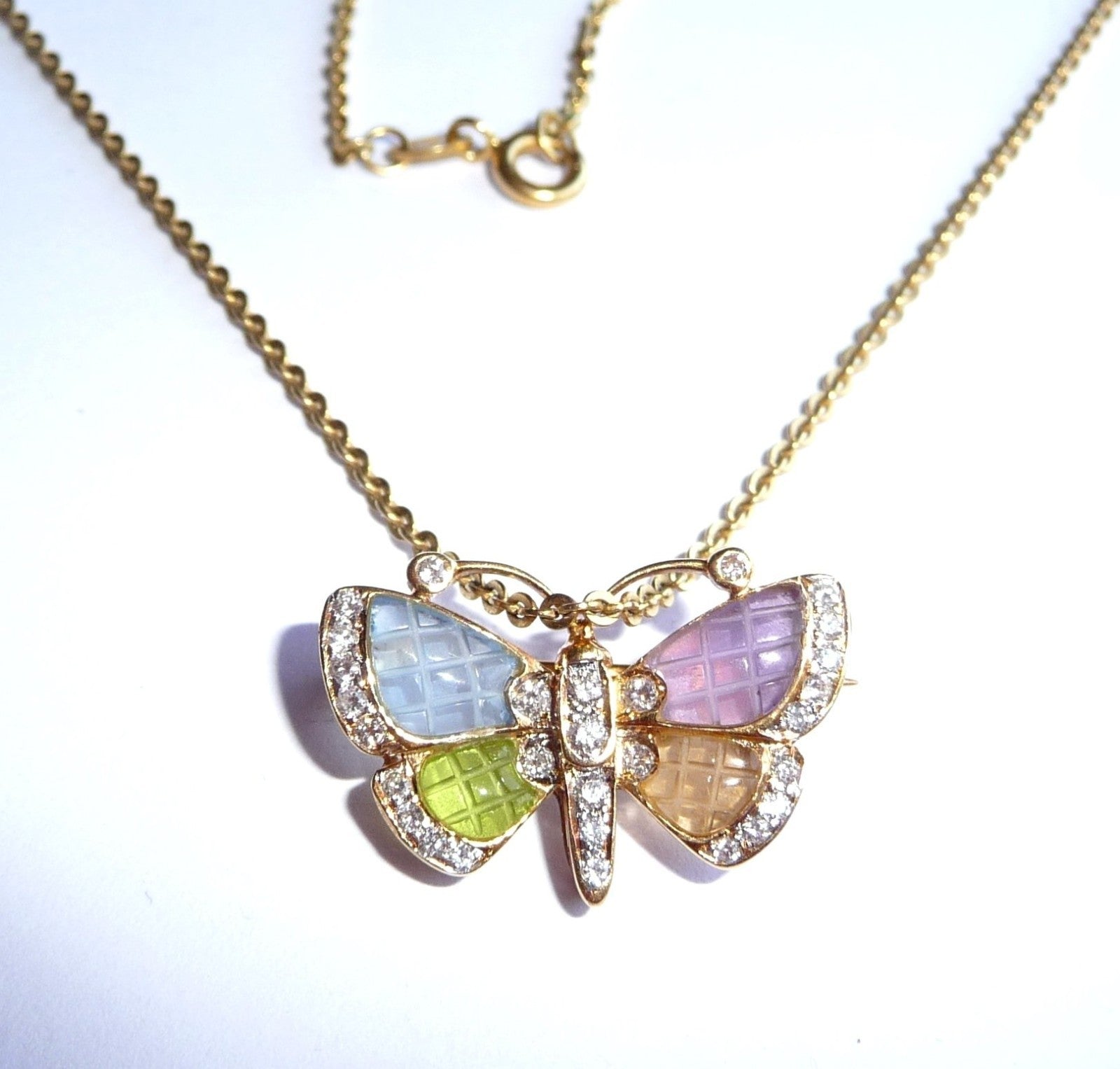 Brosche und Anhänger in einem, gefertigt in 18 K / 750 Gelbgold. Die Brosche ist in Form eines niedlichen bunten Schmetterlings / Butterfly gearbeitet.