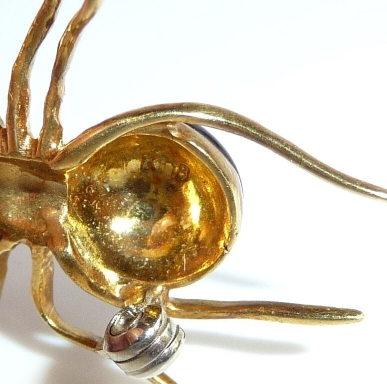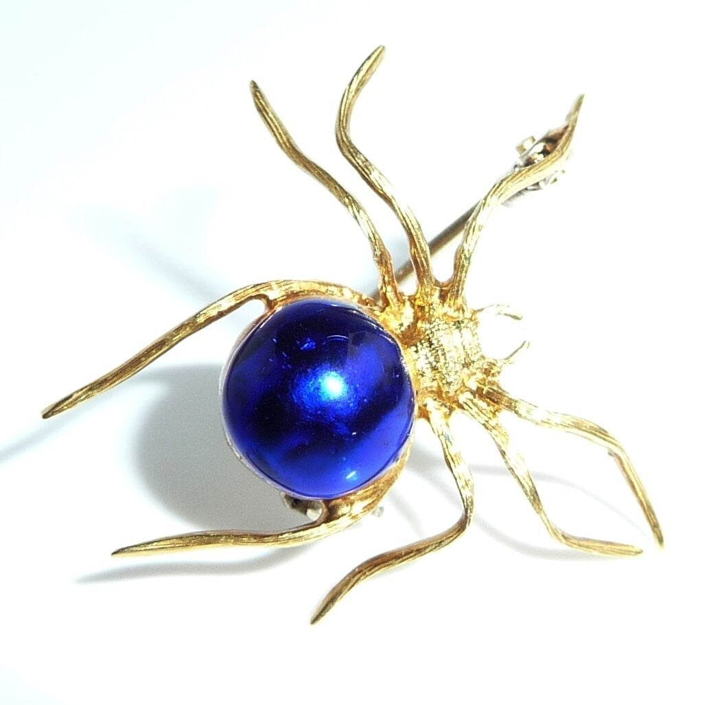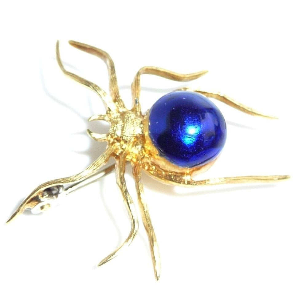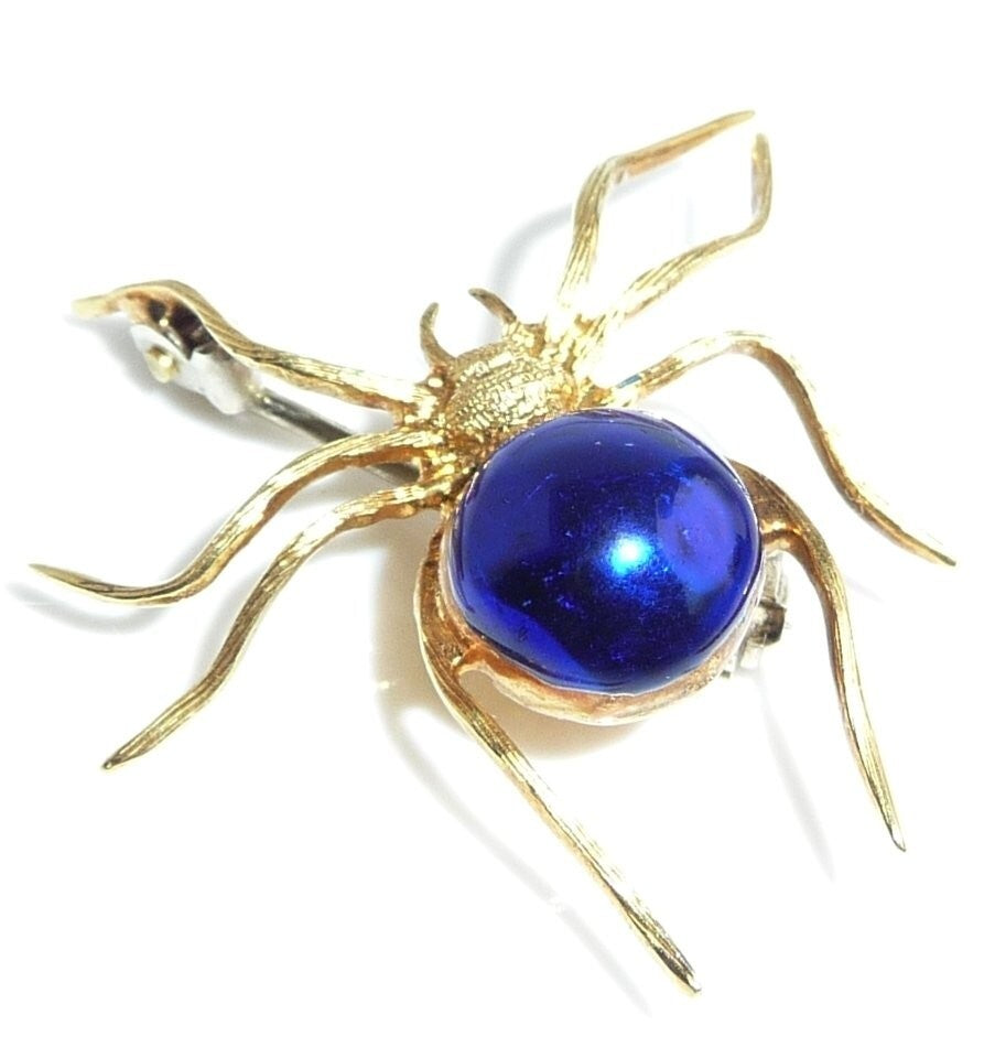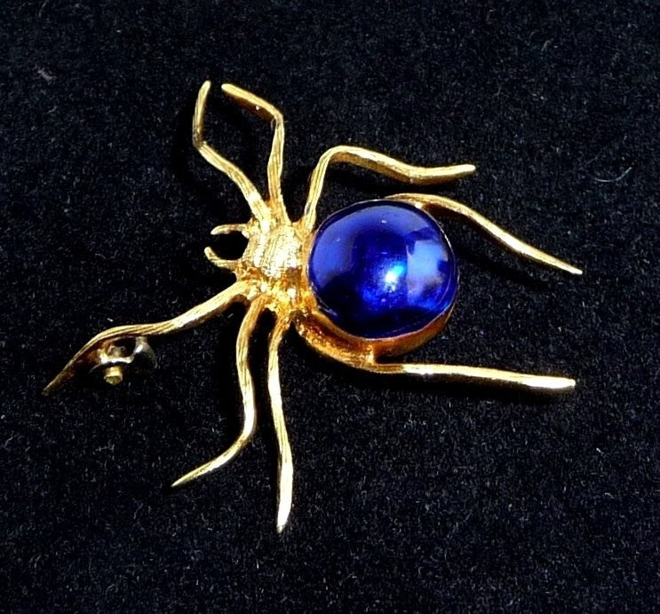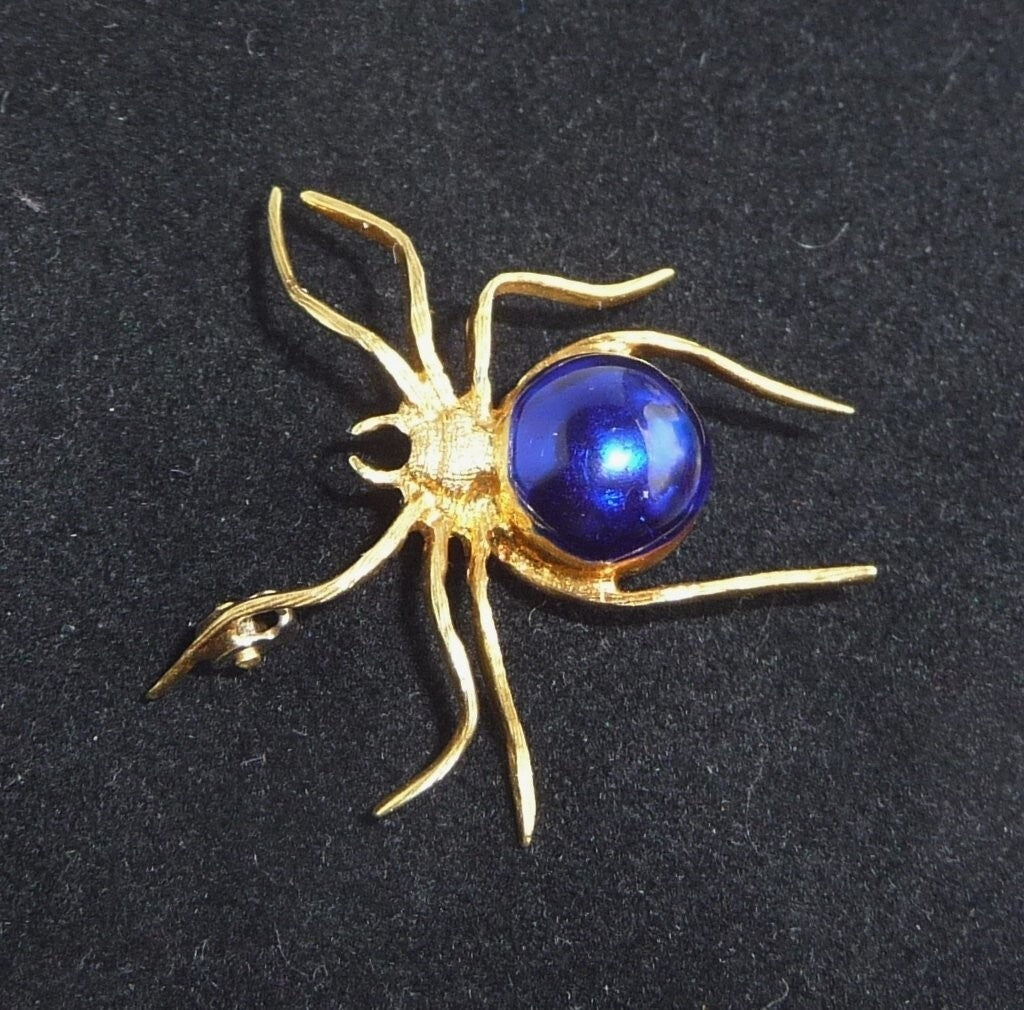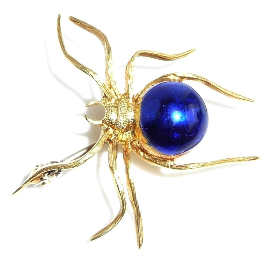 Brosche, gefertigt in 18 K / 750 Gelbgold. Die Brosche ist in Form einer Spinne gestaltet. Die Spinne ist sehr naturalistisch geformt und zeigt ihre sehr typische Bewegungsart. Der kugelige dicke Körper ist mit einer dunkelblauen Emaille veredelt. Der gesamte Körperbau erinnert sehr an die Spinnen-Gattung "Schwarze Witwe" (Black Widow) oder auch Kugelspinne.