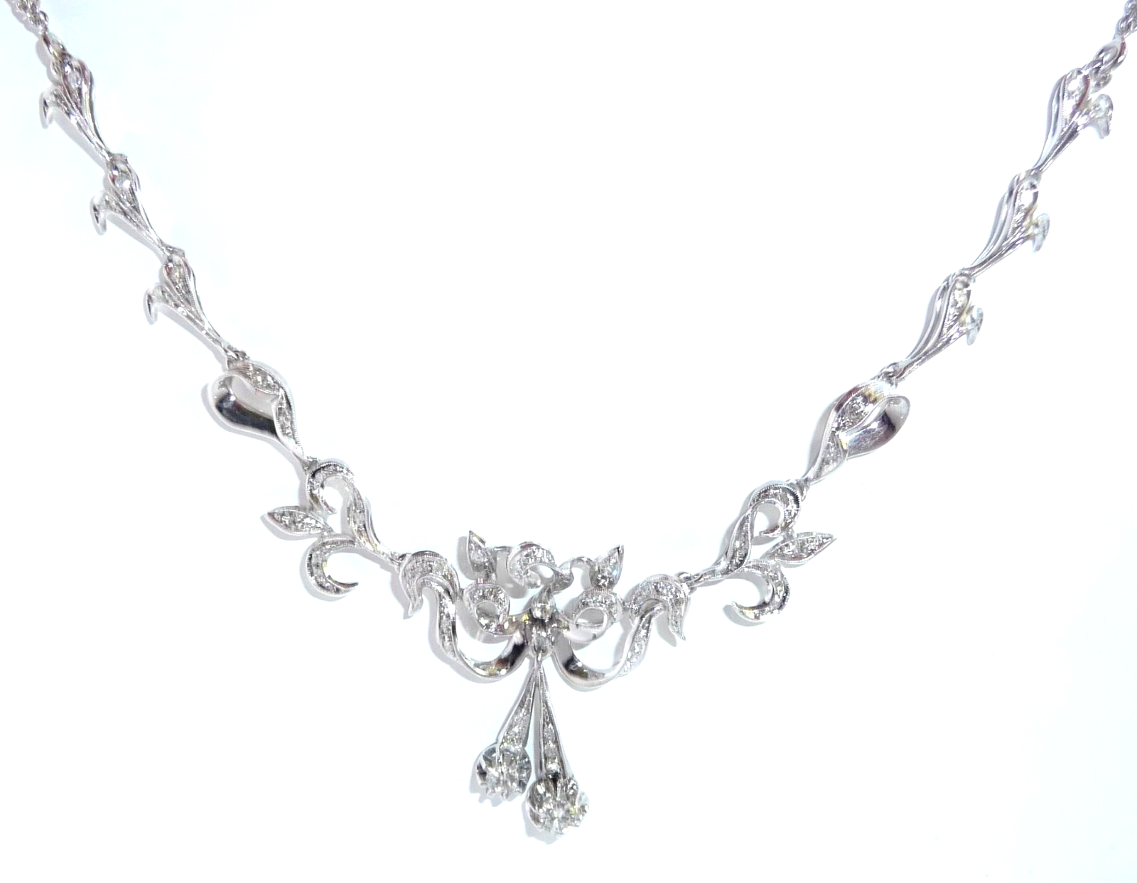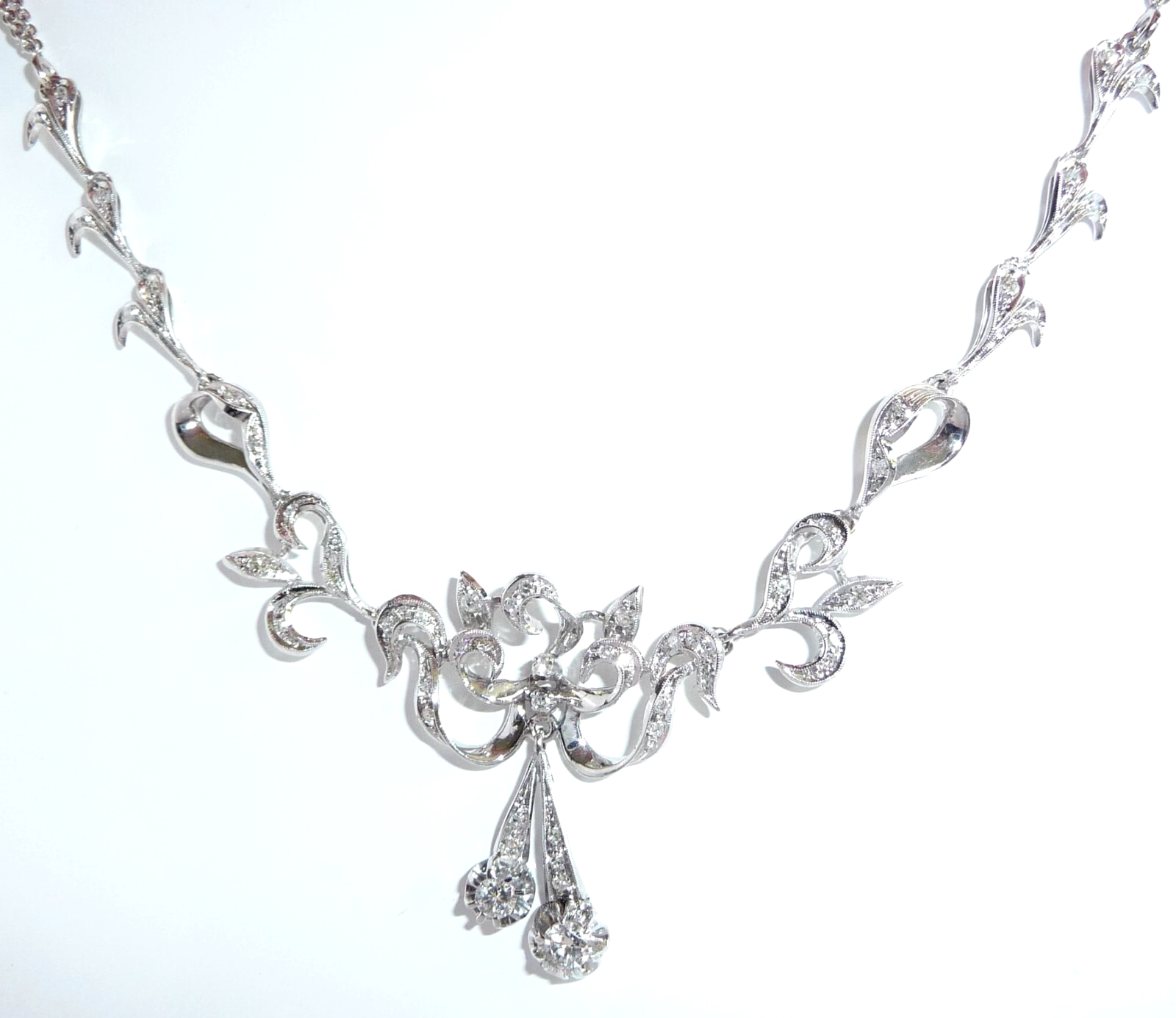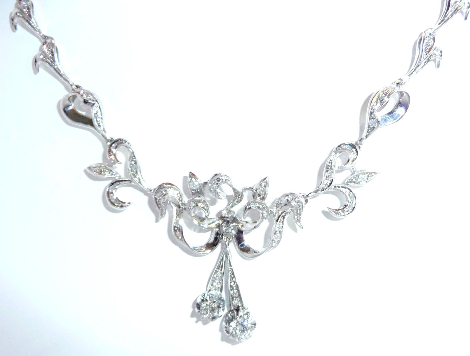 Elegantes Collier in 750 / 18 K Weißgold. Die Collier-Kette hat einen romantisch gestalteten Mitteilteil mit Bögen und Schleifen. Die beweglichen Elemente sind besetzt mit insgesamt 57 Diamanten. Den Abschluss und Eye-Catcher bilden zwei große klare Diamanten, die wie ein Schleifenband im Zentrum herabreichen. Die 57 kleineren Diamanten sind im Achtkantschliff und haben zusammen ca. 0.65 ct. mit Farbe H-G und Reinheit VS-SI. Die beiden größeren Diamanten haben 1 x 0.25 ct. und 1 x 0.20 ct. mit Farbe F-G und Reinheit VVS-VS.