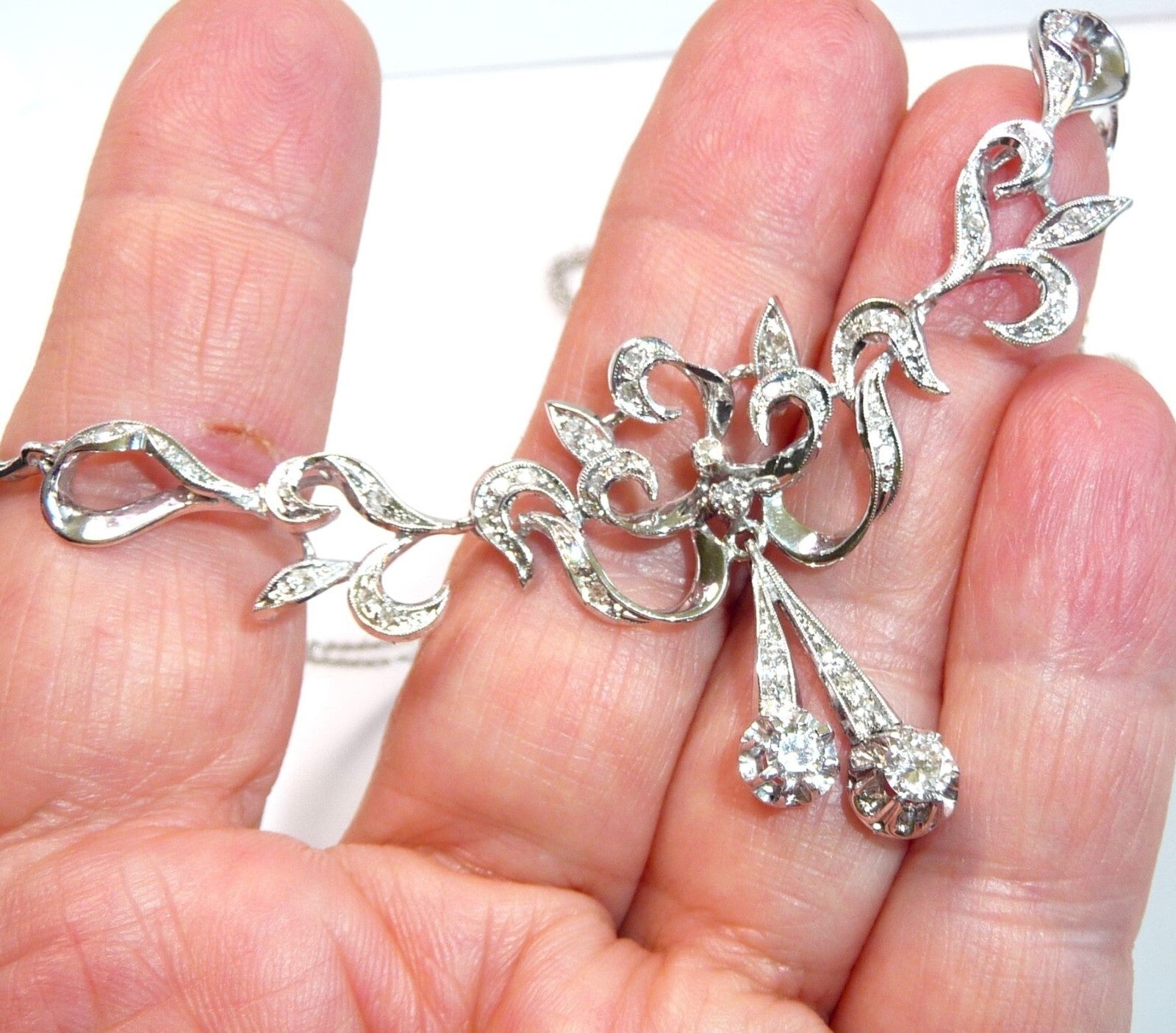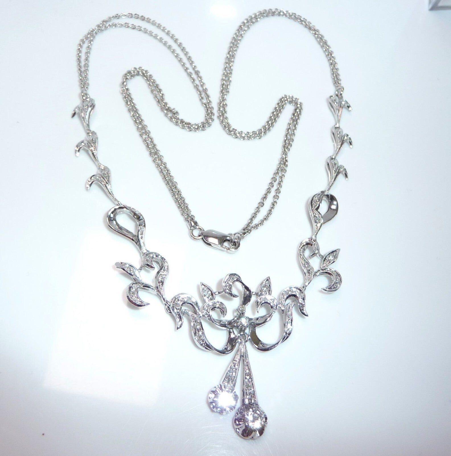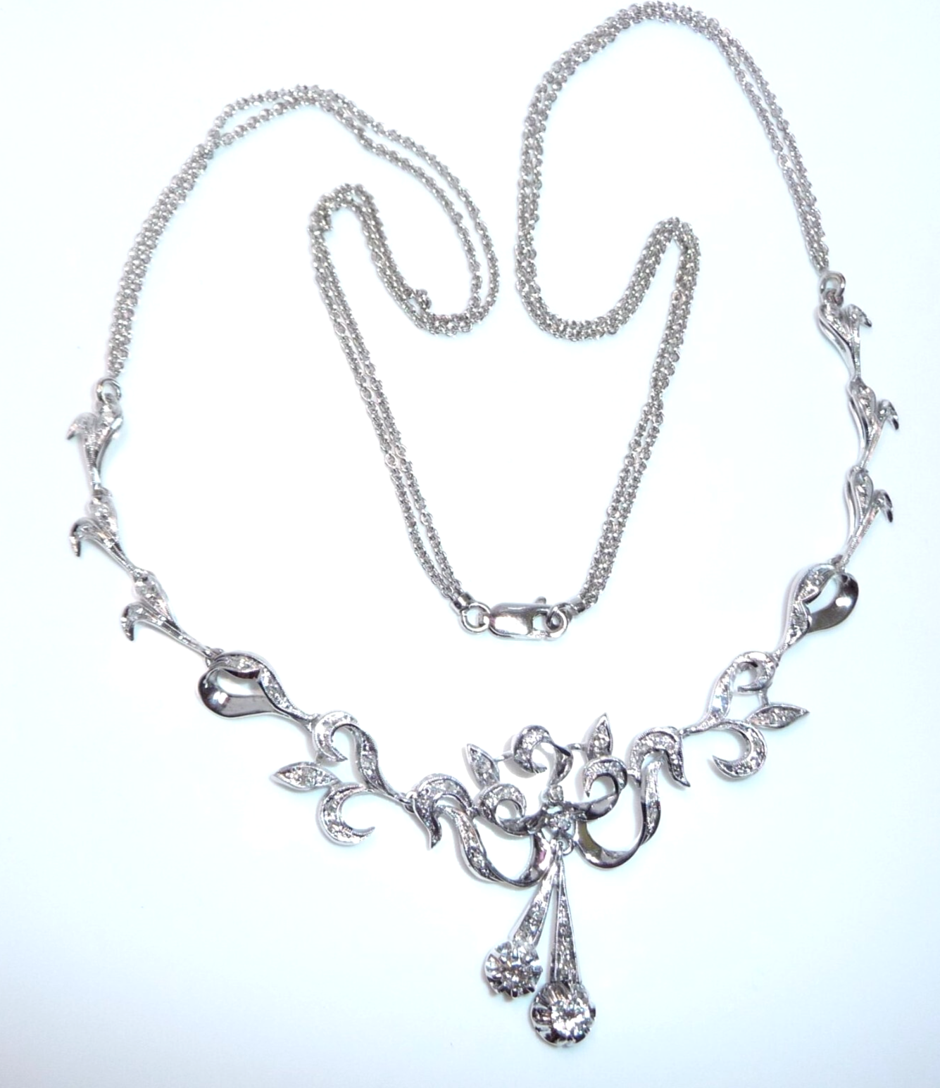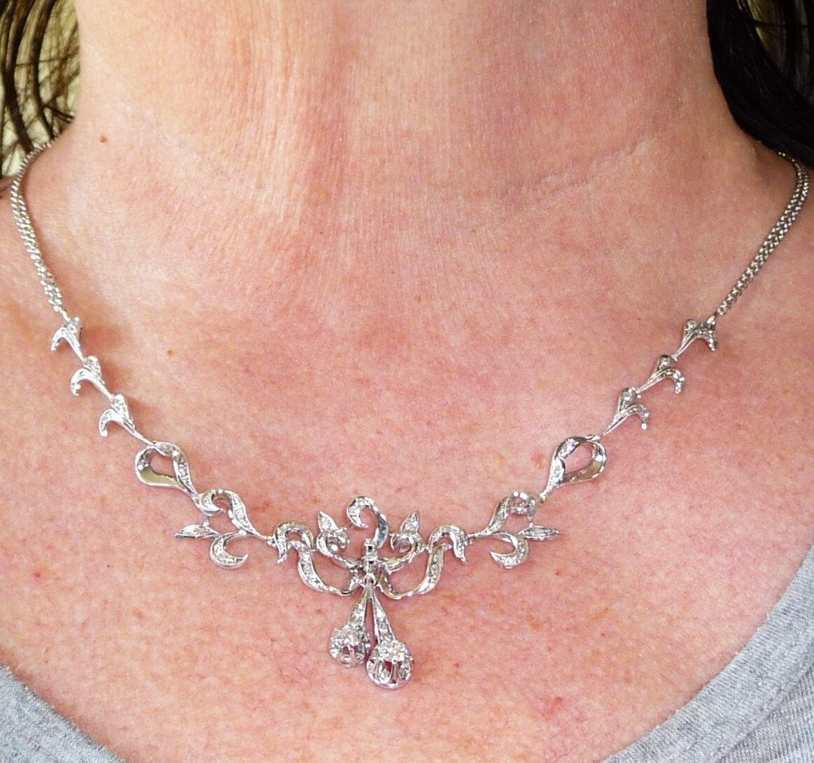 Elegantes Collier in 750 / 18 K Weißgold. Die Collier-Kette hat einen romantisch gestalteten Mitteilteil mit Bögen und Schleifen. Die beweglichen Elemente sind besetzt mit insgesamt 57 Diamanten. Den Abschluss und Eye-Catcher bilden zwei große klare Diamanten, die wie ein Schleifenband im Zentrum herabreichen. Die 57 kleineren Diamanten sind im Achtkantschliff und haben zusammen ca. 0.65 ct. mit Farbe H-G und Reinheit VS-SI. Die beiden größeren Diamanten haben 1 x 0.25 ct. und 1 x 0.20 ct. mit Farbe F-G und Reinheit VVS-VS.