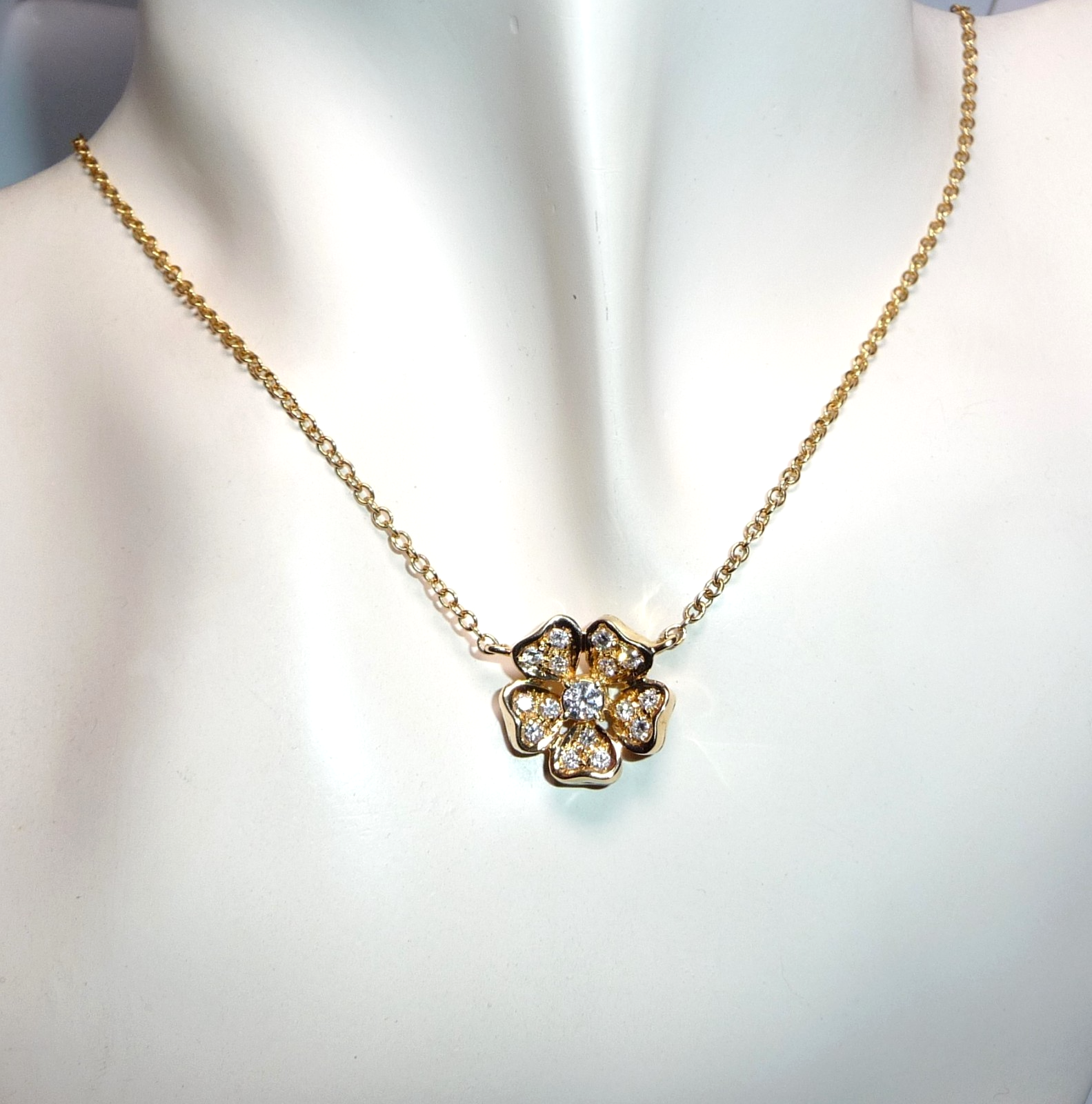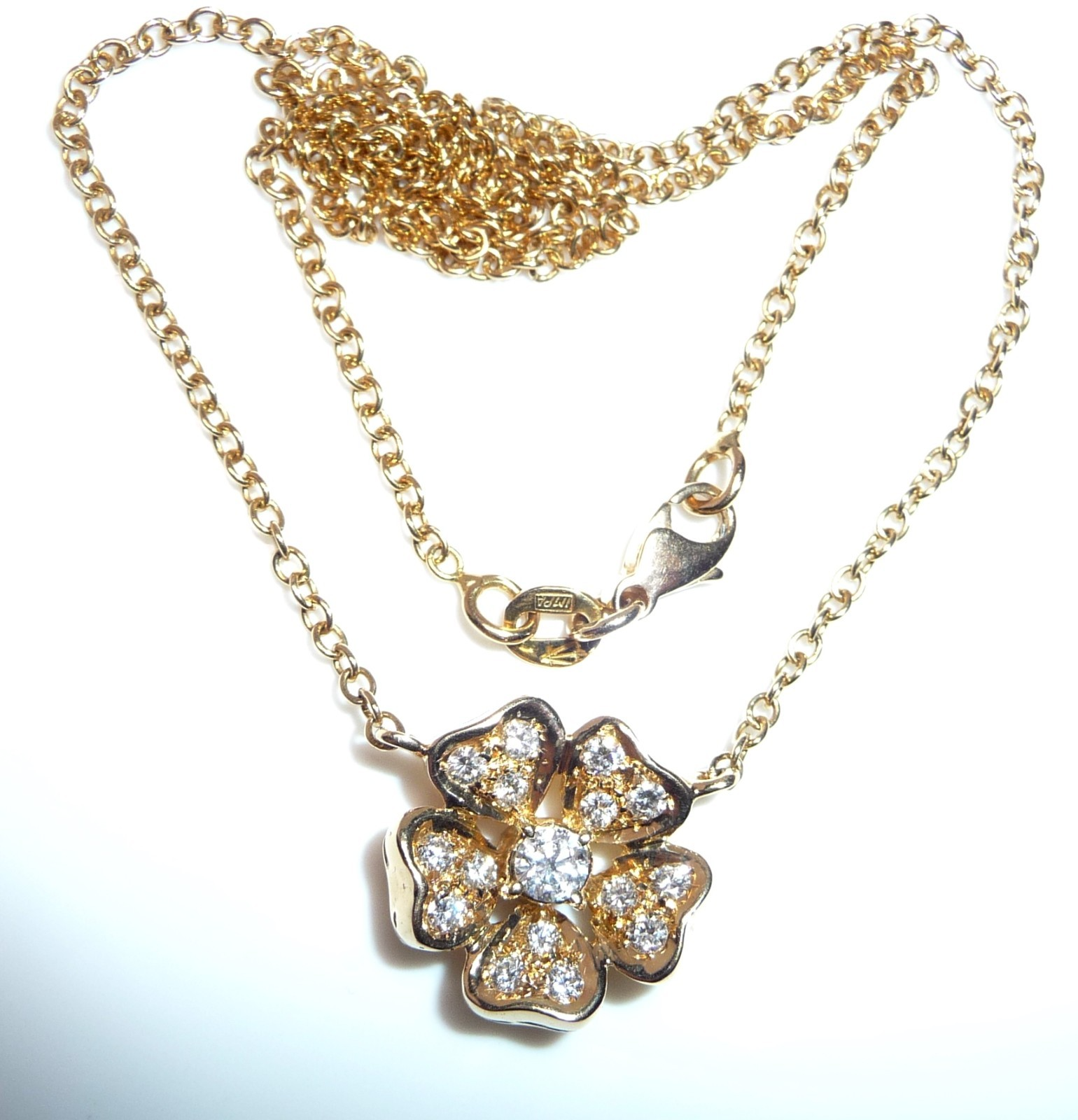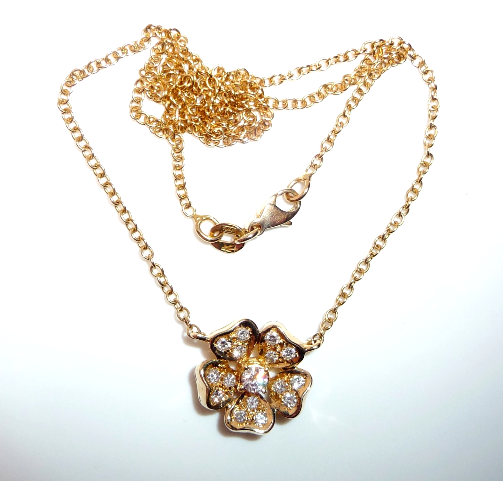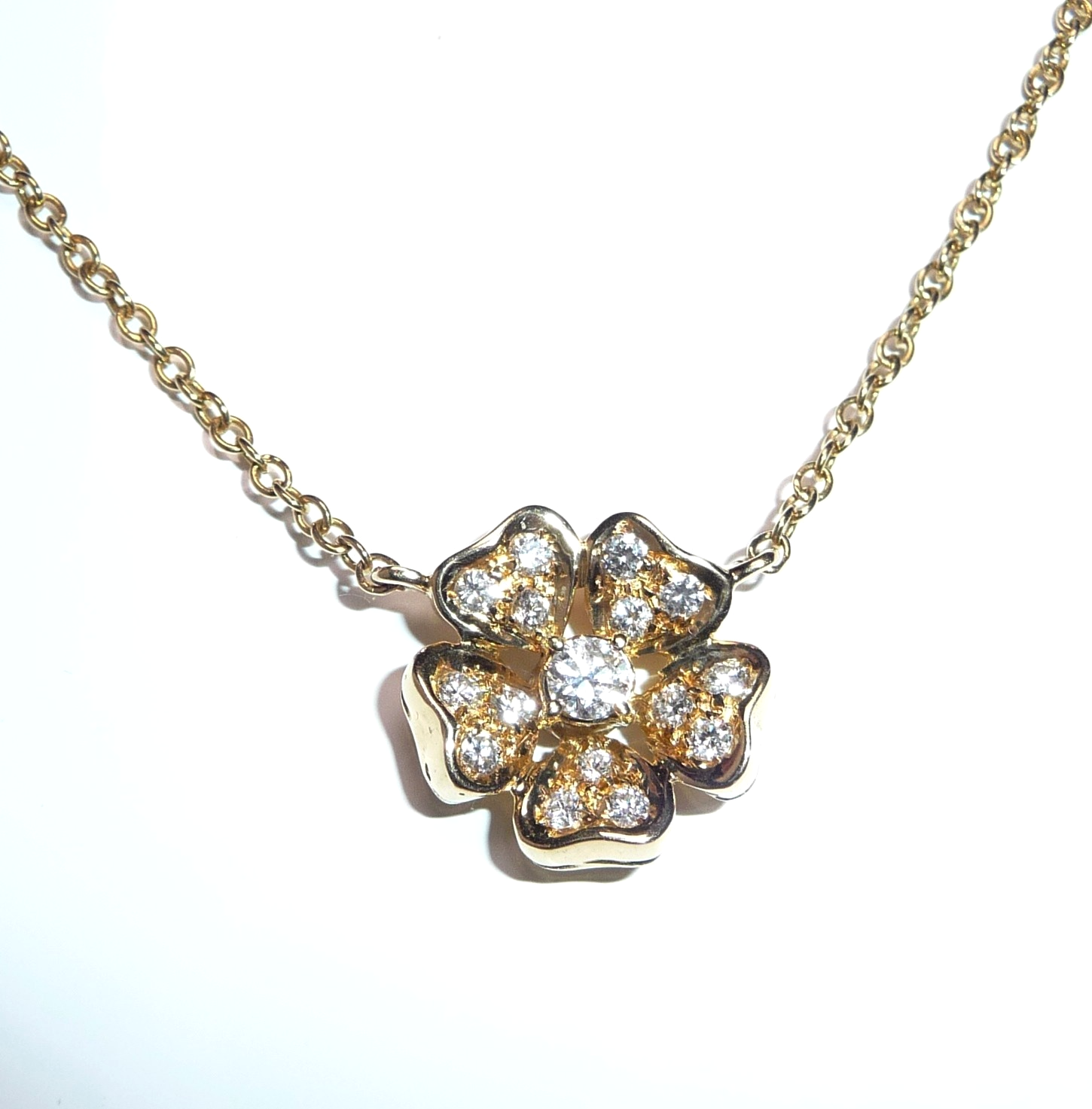 Collier-Kette in 750 / 18 K Gelbgold. Im Zentrum der Kette ist ein Anhänger integriert in Blüten-Form. Die Blüte hat 5 geschwungene Blütenblätter. Im Zentrum der Blume ist ein Diamant von 3,5 mm Durchmesser, entsprechend 0.20 ct.(F/SI). Die 5 Blätter sind besetzt mit insgesamt 15 Diamanten im Brillantschliff von total 0.45 ct. (F/VS). Diamanten total: 0.65 ct.