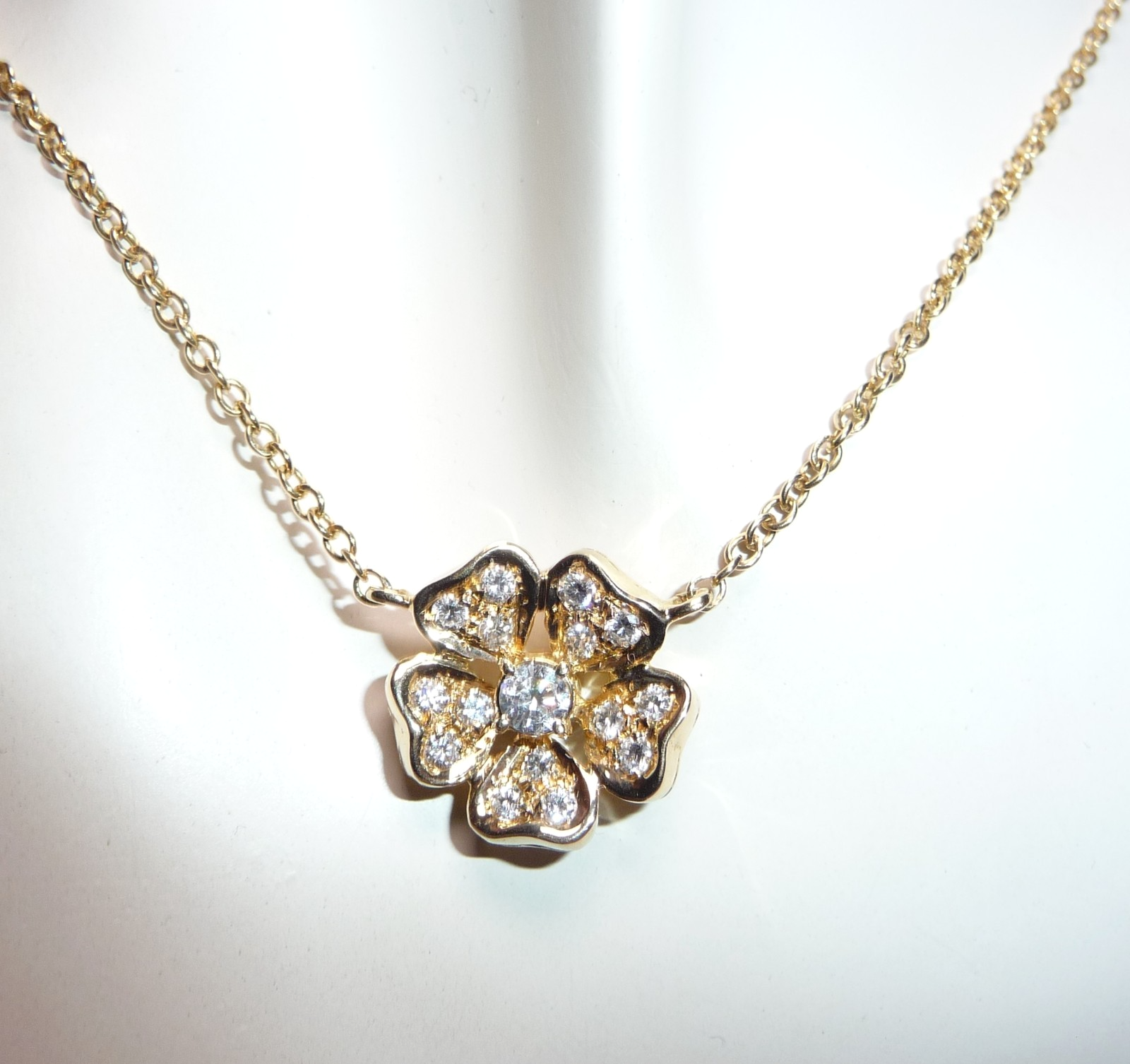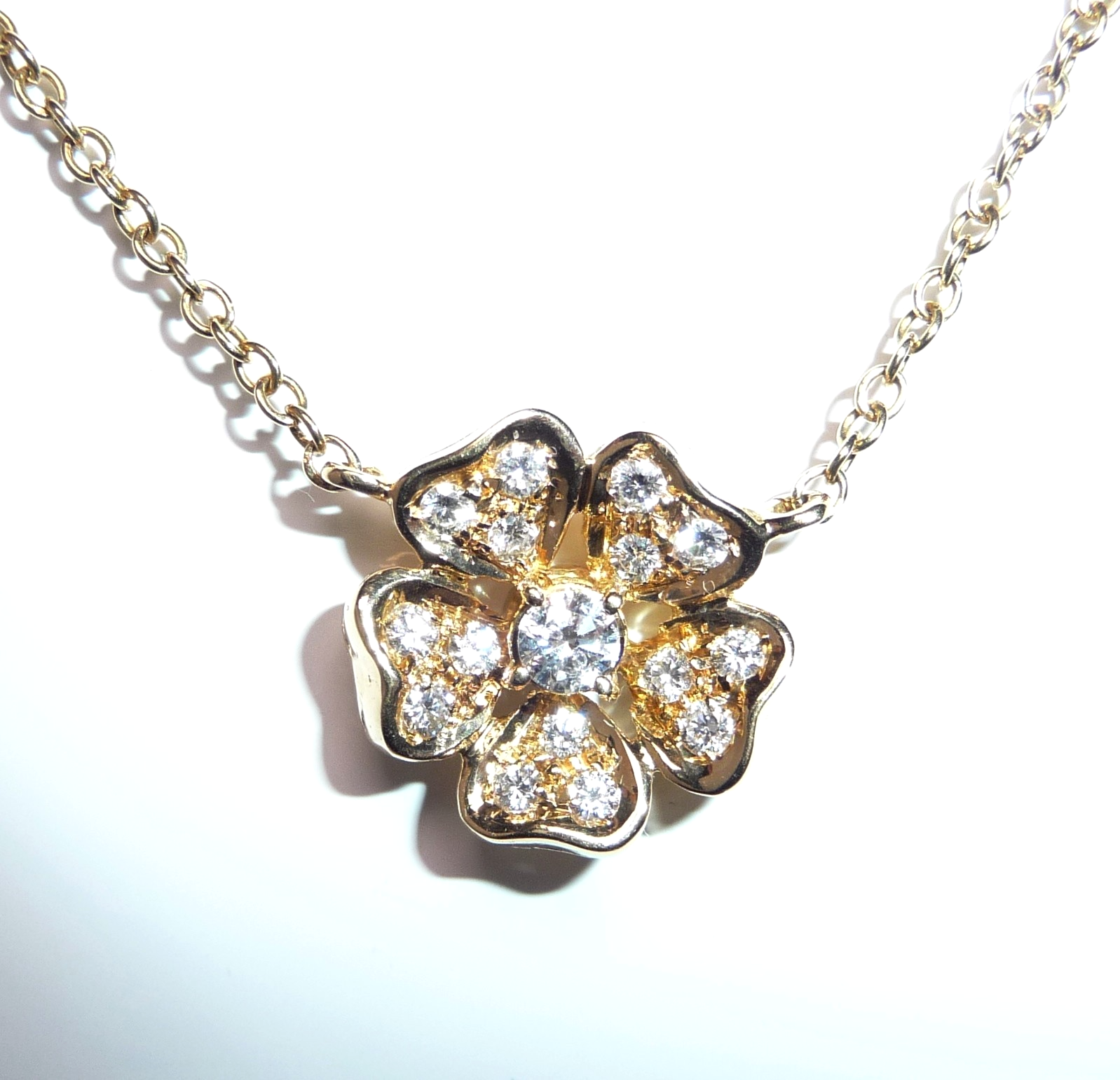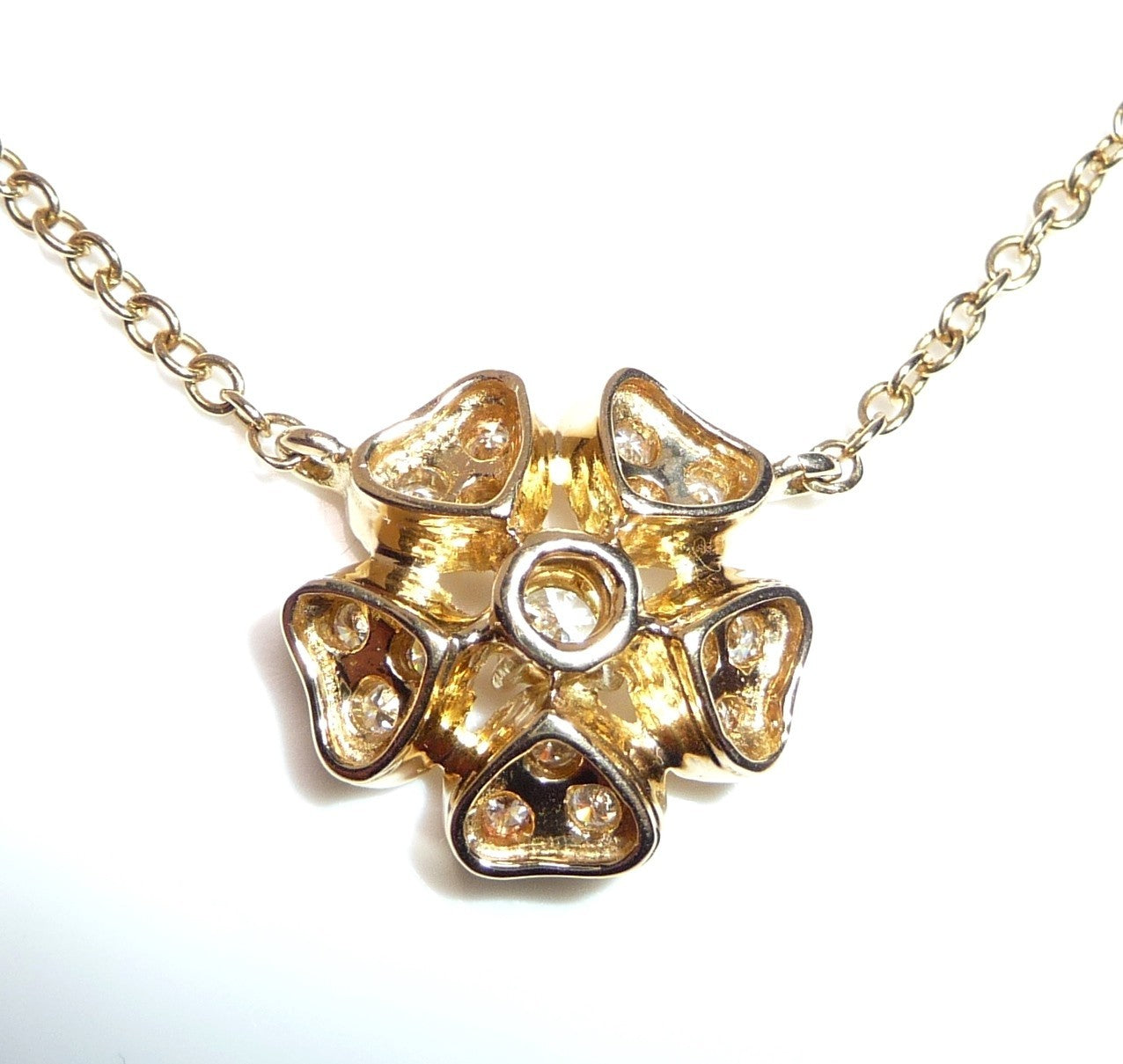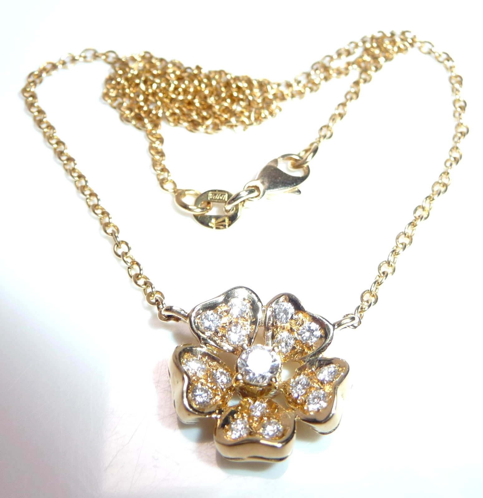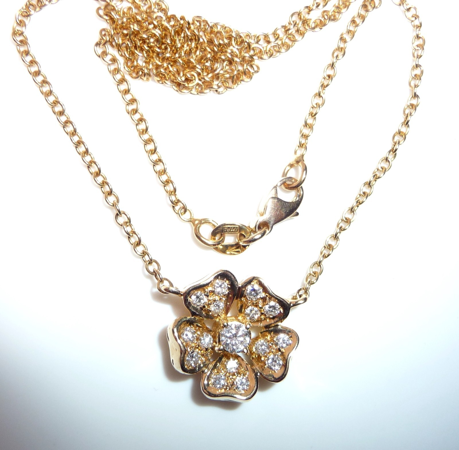 Collier-Kette in 750 / 18 K Gelbgold. Im Zentrum der Kette ist ein Anhänger integriert in Blüten-Form. Die Blüte hat 5 geschwungene Blütenblätter. Im Zentrum der Blume ist ein Diamant von 3,5 mm Durchmesser, entsprechend 0.20 ct.(F/SI). Die 5 Blätter sind besetzt mit insgesamt 15 Diamanten im Brillantschliff von total 0.45 ct. (F/VS). Diamanten total: 0.65 ct.