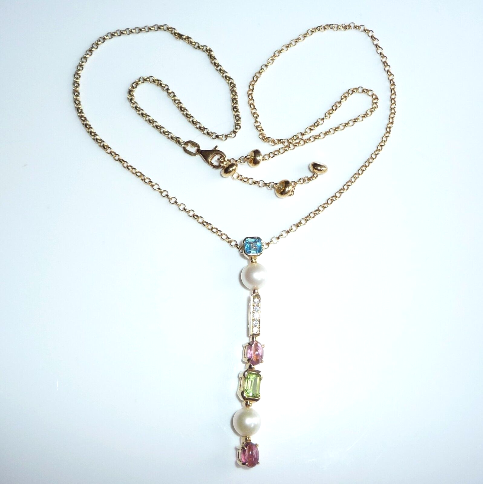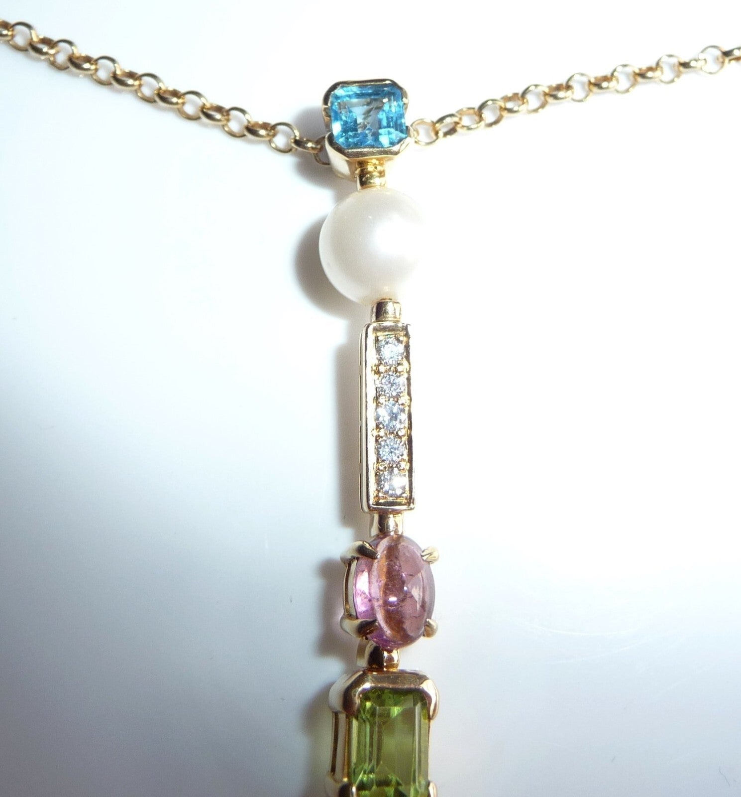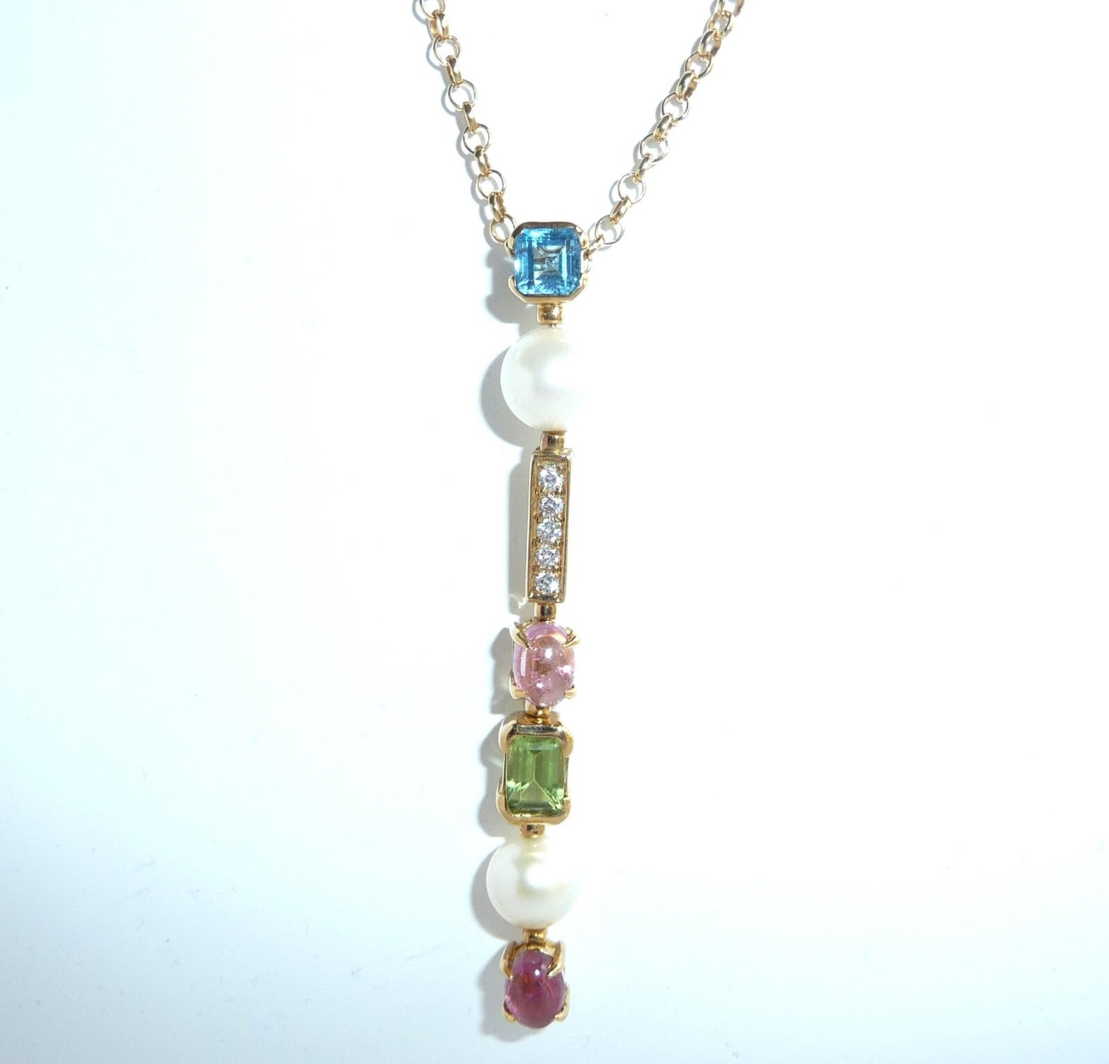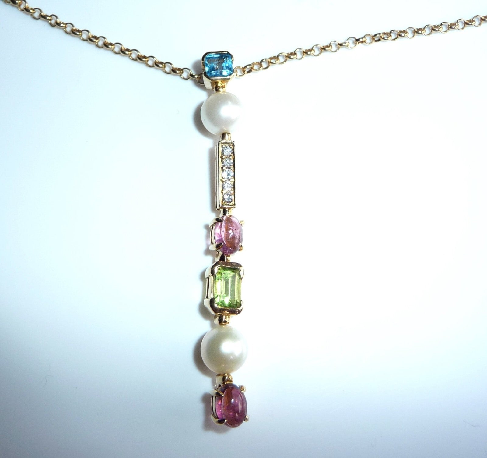 Der lange Anhänger hat eine bewegliche Verbindung. Eingefasst sind 2 Akoya-Perlen von 8,2 mm Durchmesser. Fern eingefasst sind 2 rosa/pinke Turmaline - auch Rubellite genannt - von zusammen 1.00 ct., 1 Peridot von 1.00 ct. und ein blauer Topas von ca. 0.50 ct.. Ein Verbindungsglied hat noch 5 Diamanten im Brillantschliff von total 0.10 ct.(F/VVS) eingefasst.