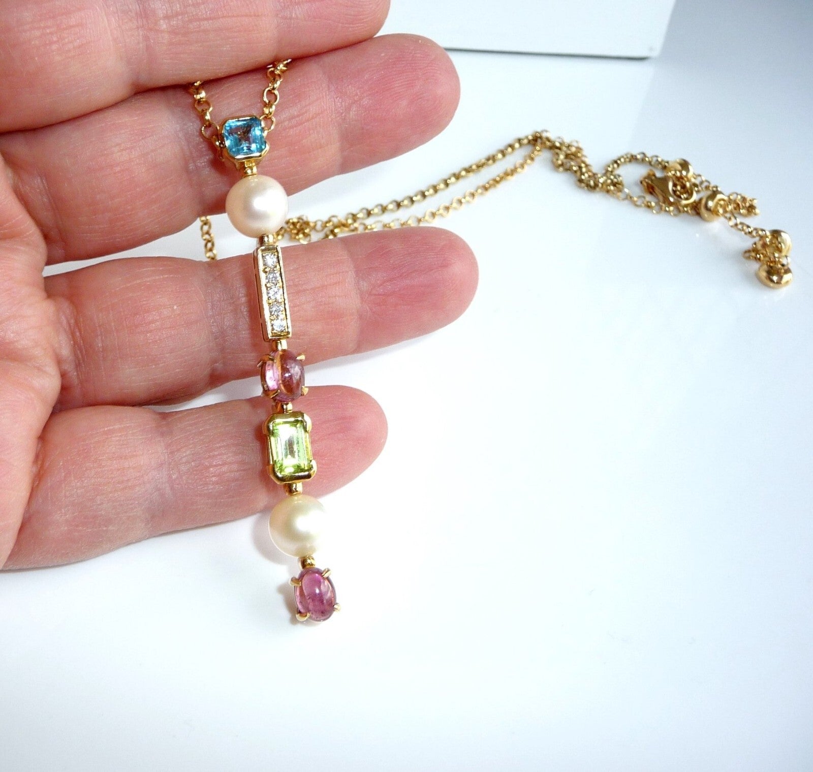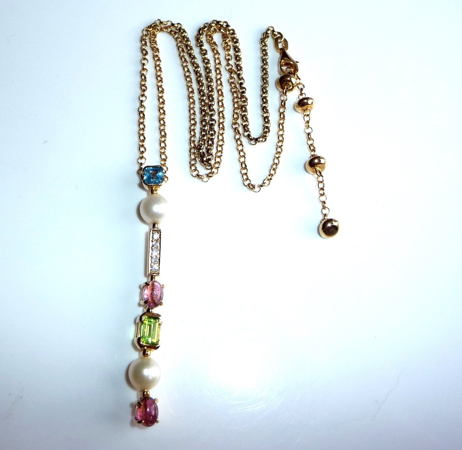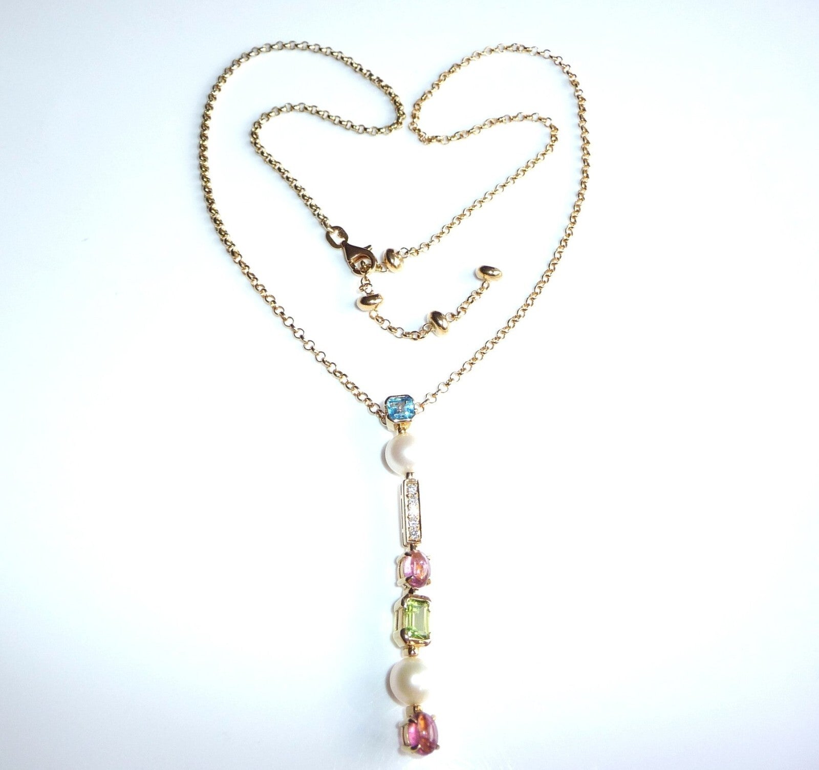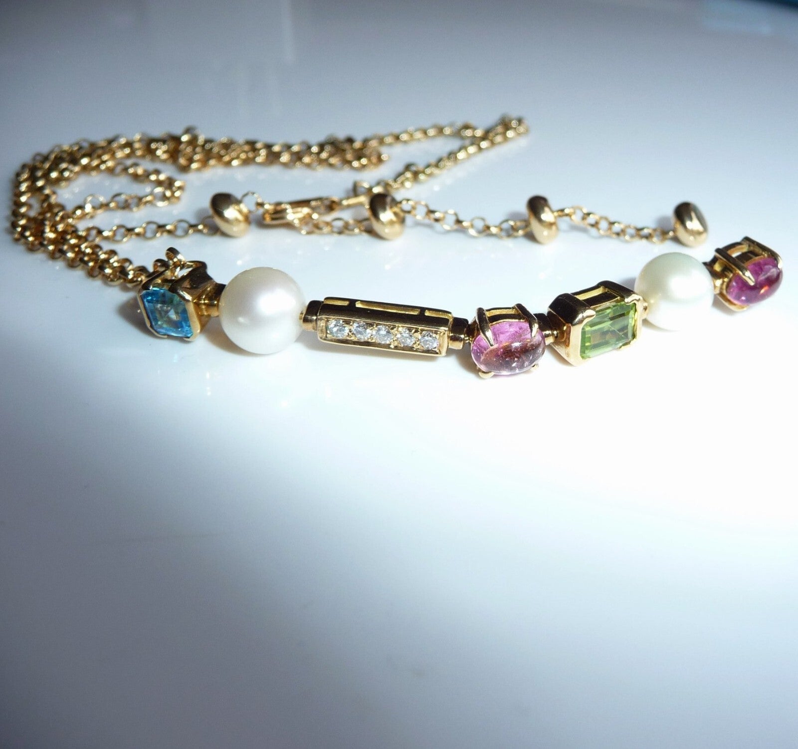 Der lange Anhänger hat eine bewegliche Verbindung. Eingefasst sind 2 Akoya-Perlen von 8,2 mm Durchmesser. Fern eingefasst sind 2 rosa/pinke Turmaline - auch Rubellite genannt - von zusammen 1.00 ct., 1 Peridot von 1.00 ct. und ein blauer Topas von ca. 0.50 ct.. Ein Verbindungsglied hat noch 5 Diamanten im Brillantschliff von total 0.10 ct.(F/VVS) eingefasst.