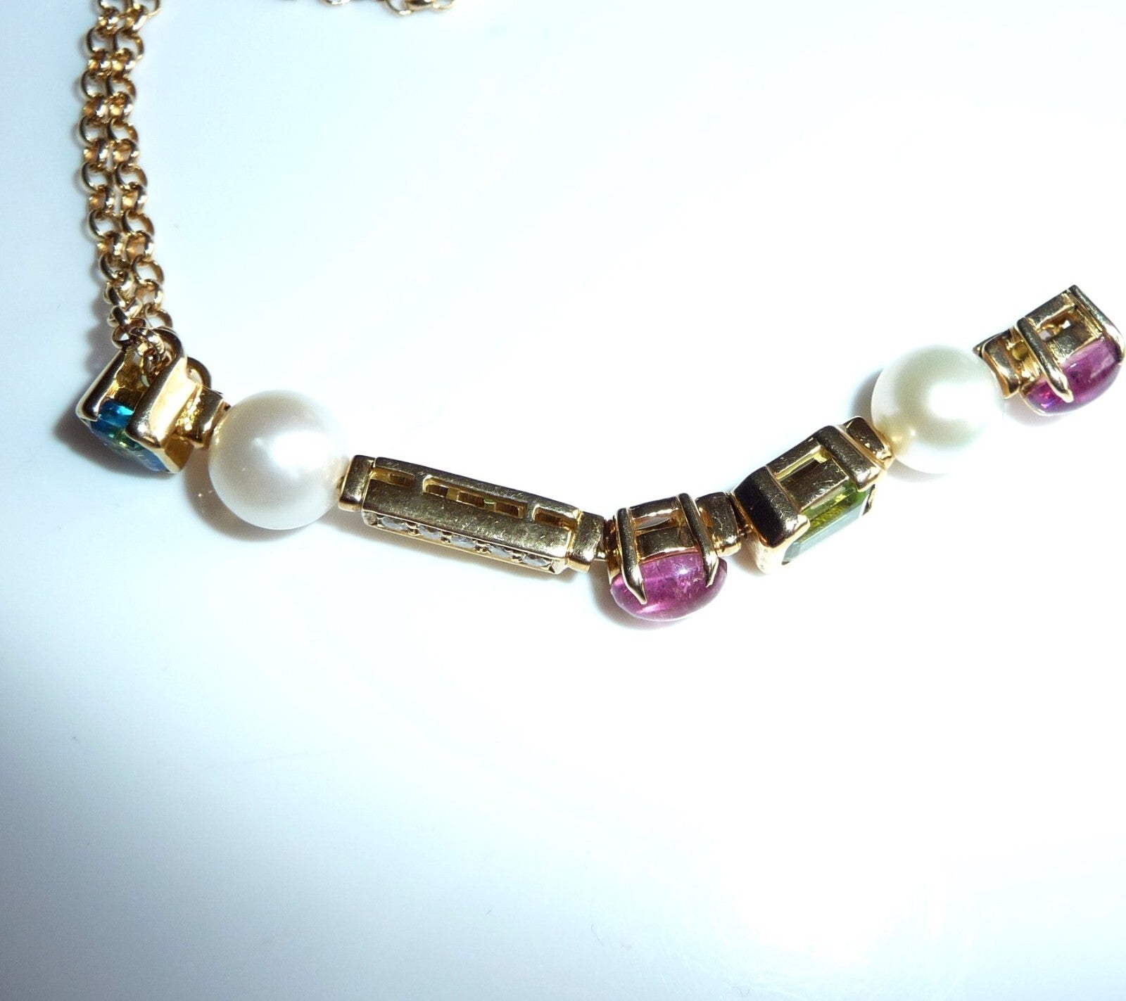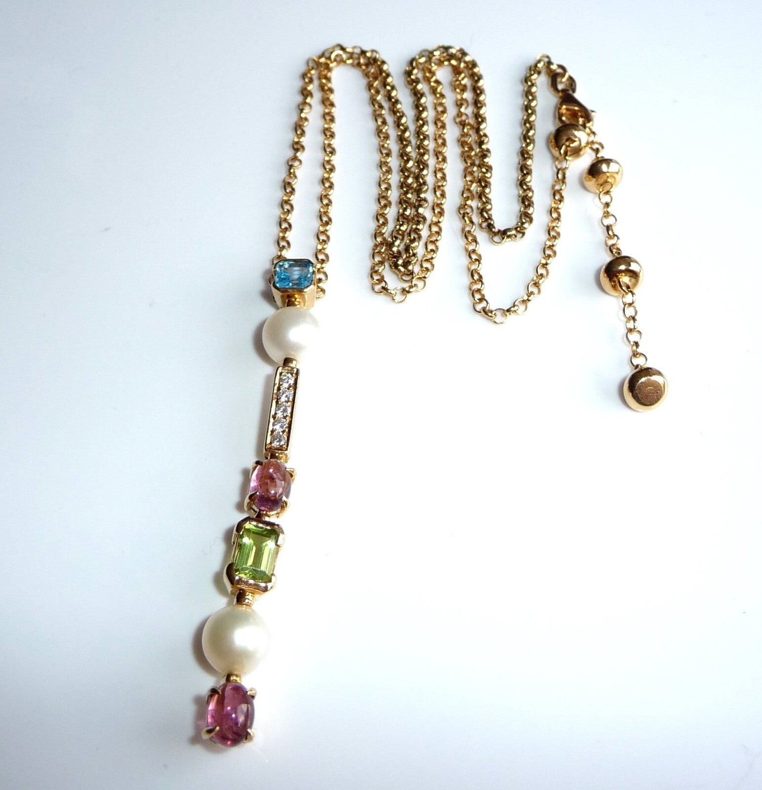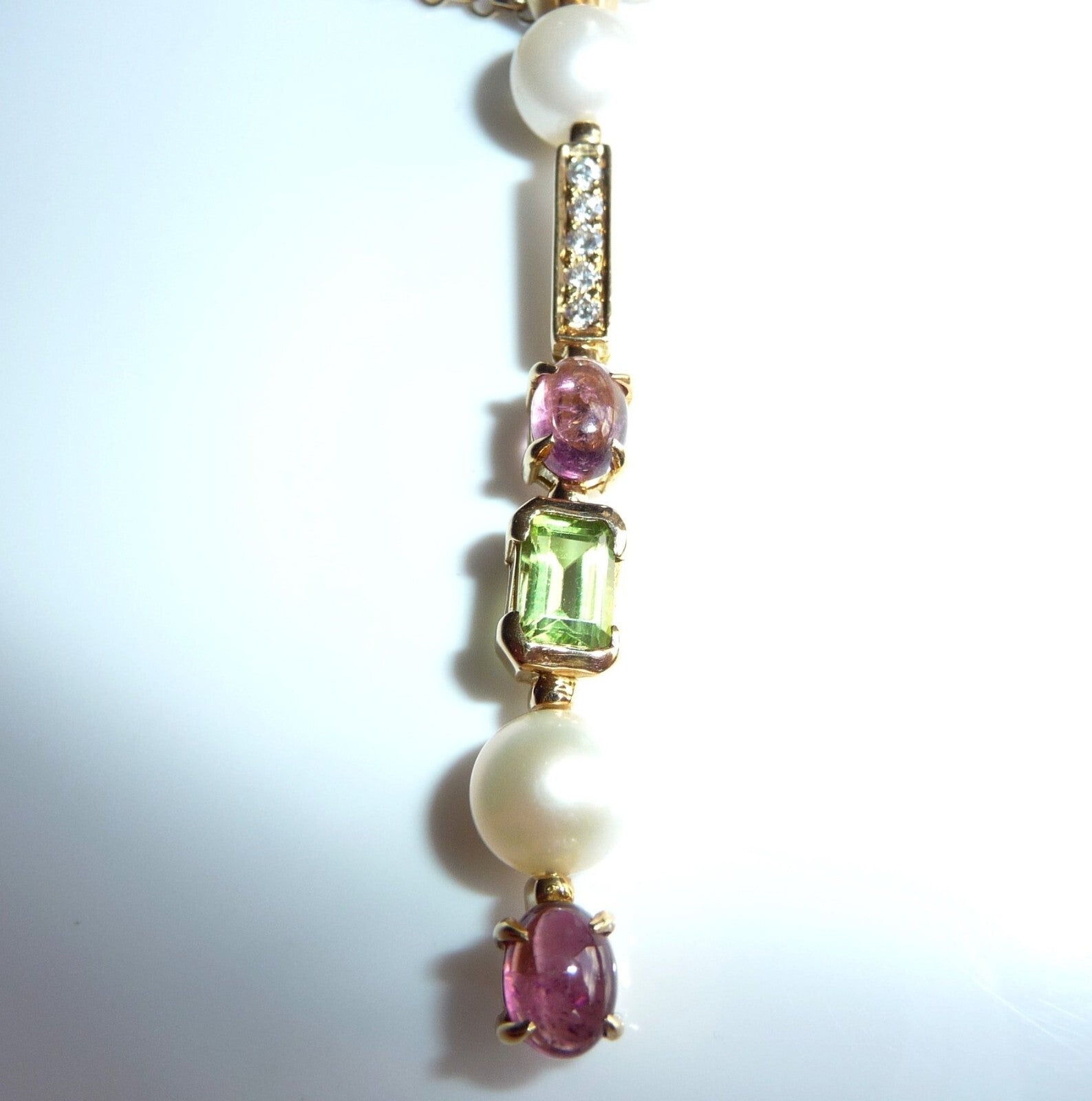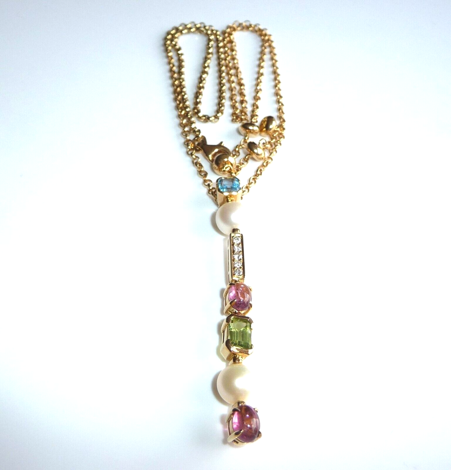 Der lange Anhänger hat eine bewegliche Verbindung. Eingefasst sind 2 Akoya-Perlen von 8,2 mm Durchmesser. Fern eingefasst sind 2 rosa/pinke Turmaline - auch Rubellite genannt - von zusammen 1.00 ct., 1 Peridot von 1.00 ct. und ein blauer Topas von ca. 0.50 ct.. Ein Verbindungsglied hat noch 5 Diamanten im Brillantschliff von total 0.10 ct.(F/VVS) eingefasst.
