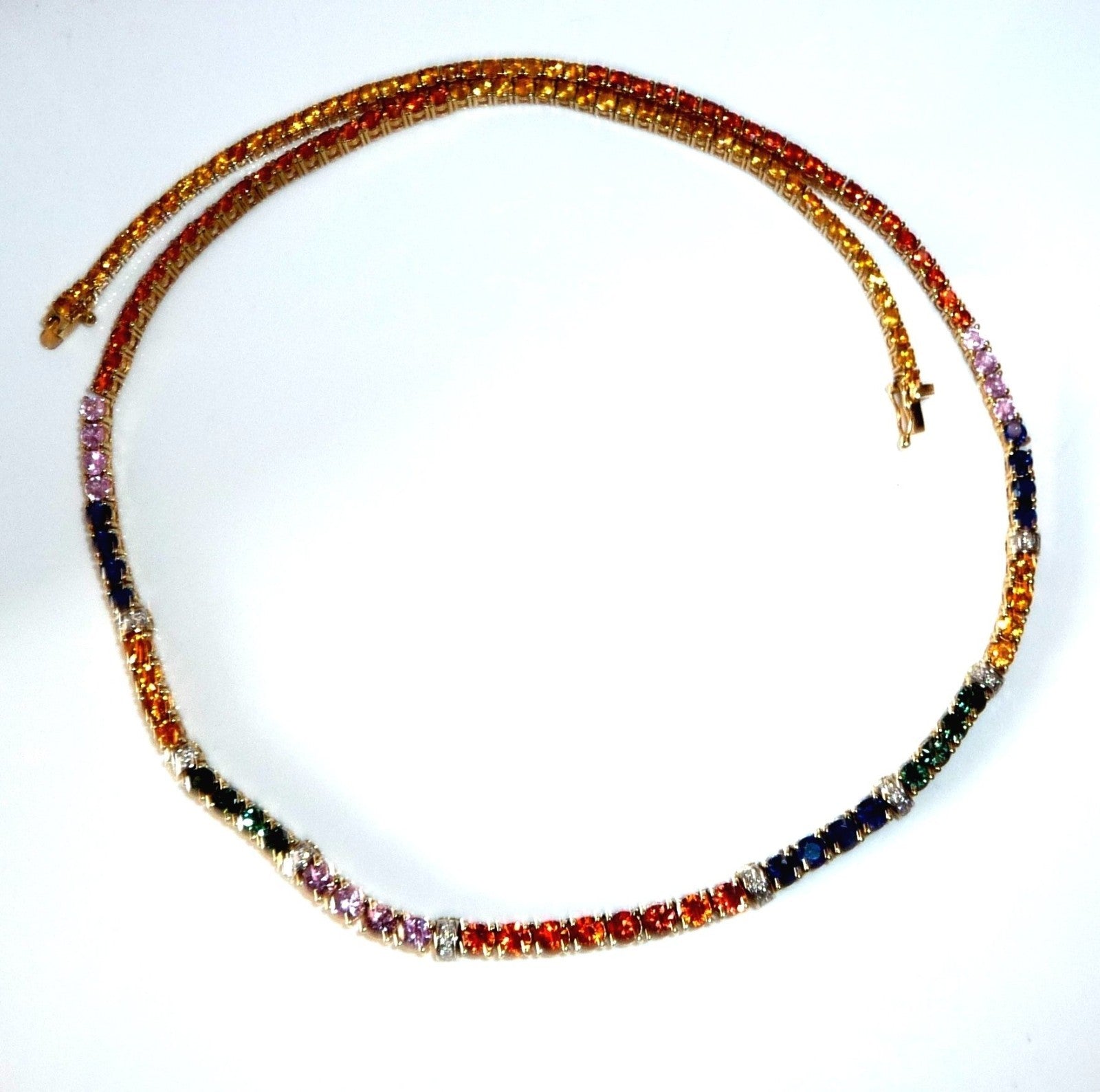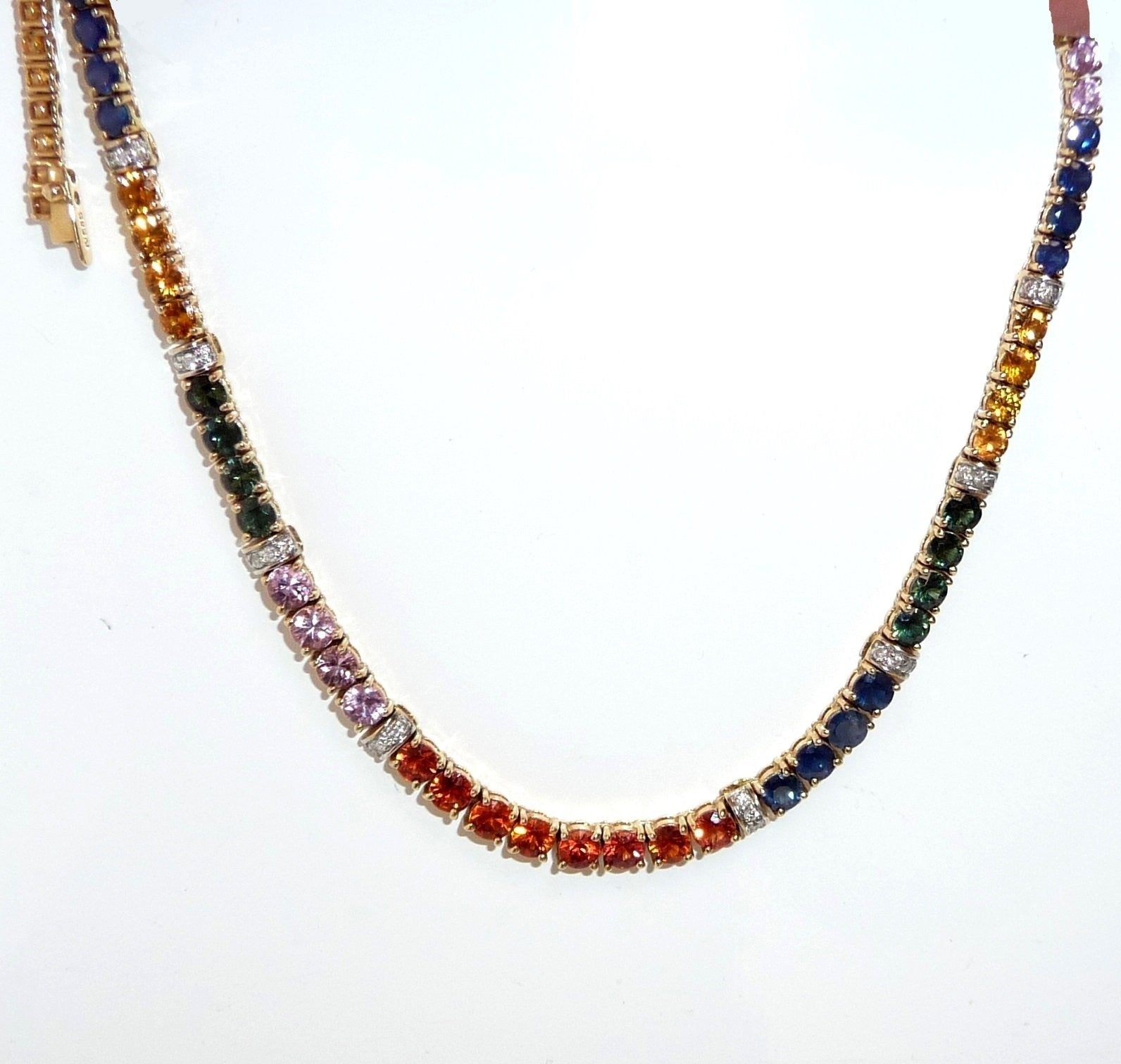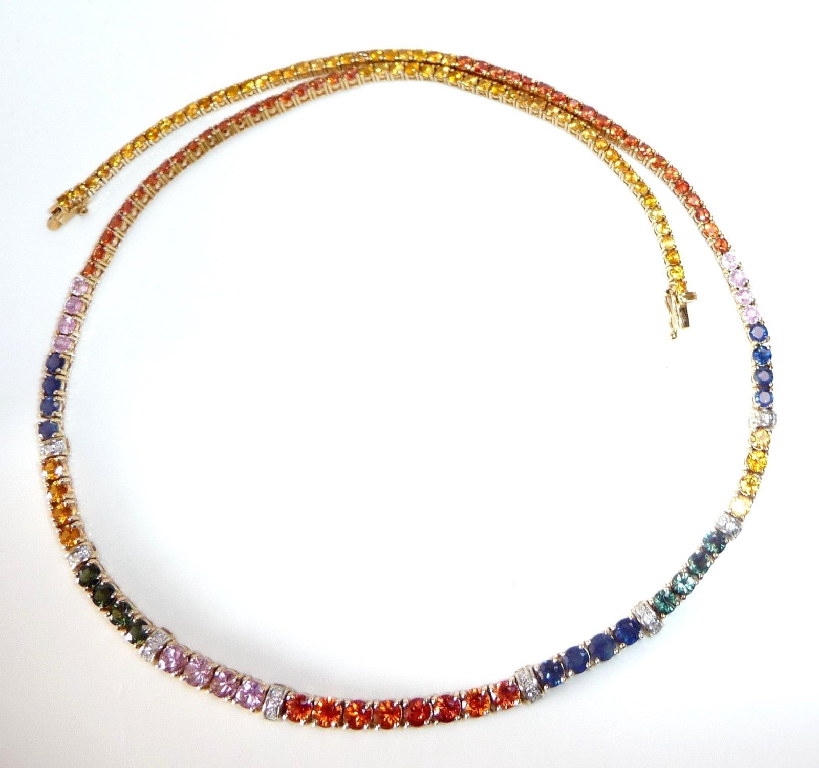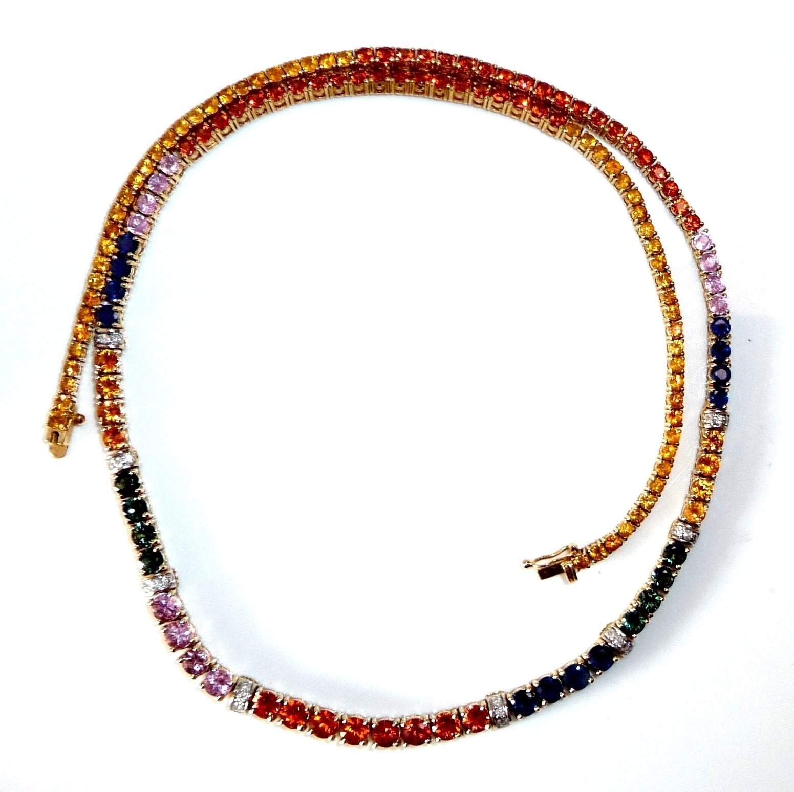 Die Collier-Kette ist im Verlauf gearbeitet und wird zur Mitte hin minimal breiter. Insgesamt sind 146 farbige Saphire von total ca. 10.50 ct. eingefasst. Vertreten sind dabei die Farben: gelb, orange, rosa, grün, blau und intensives, kräftiges Orange. Im vorderen Bereich sind die Farben in farblich geordnete Segmente eingeteilt und die Farb-Segmente sind jeweils durch kleine Weißgold-Brücken getrennt. Die Weißgold-Brücken haben insgesamt 28 Diamanten im Brillantschliff von total 0.30 ct. (G/SI-I) eingefasst.