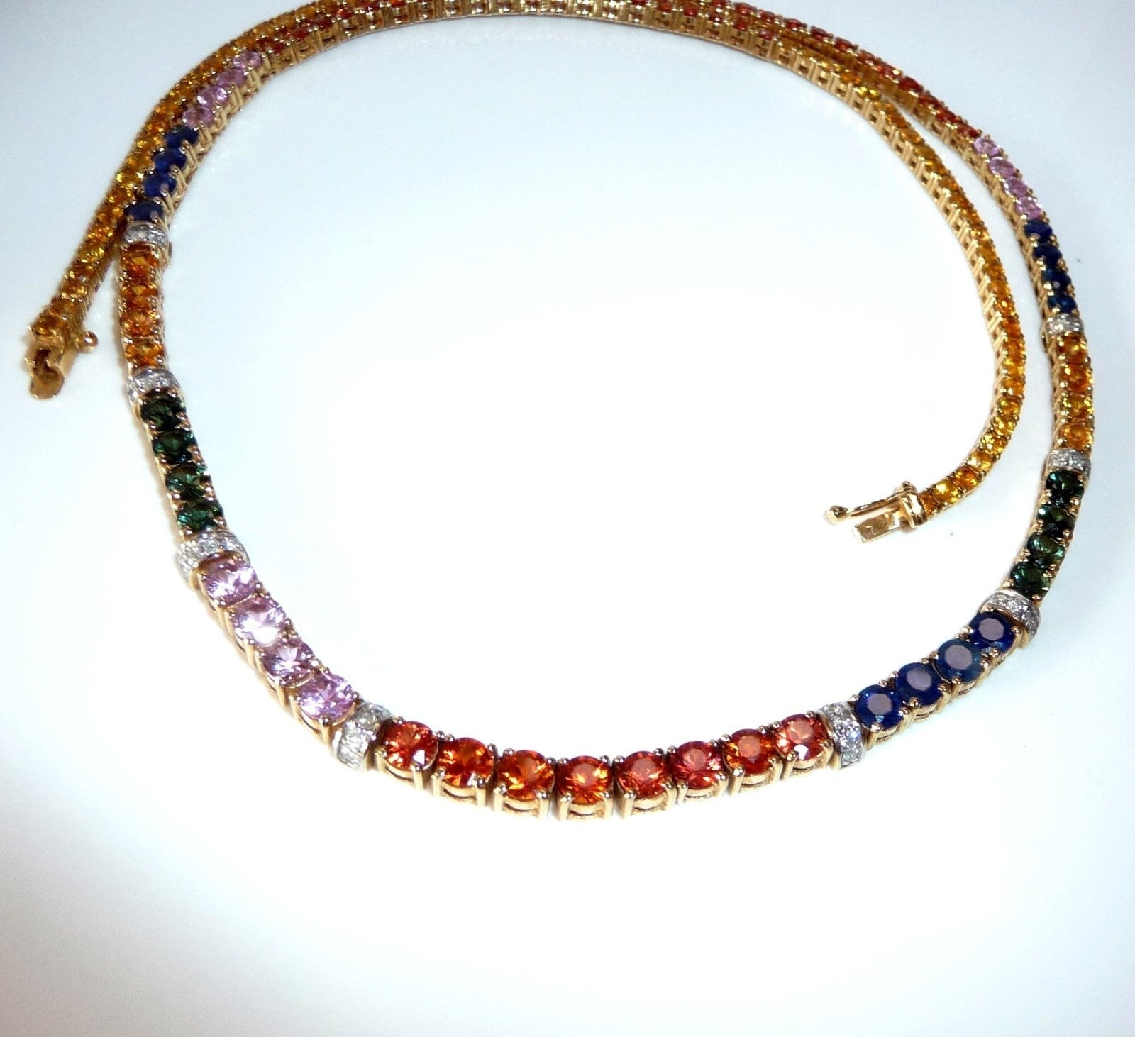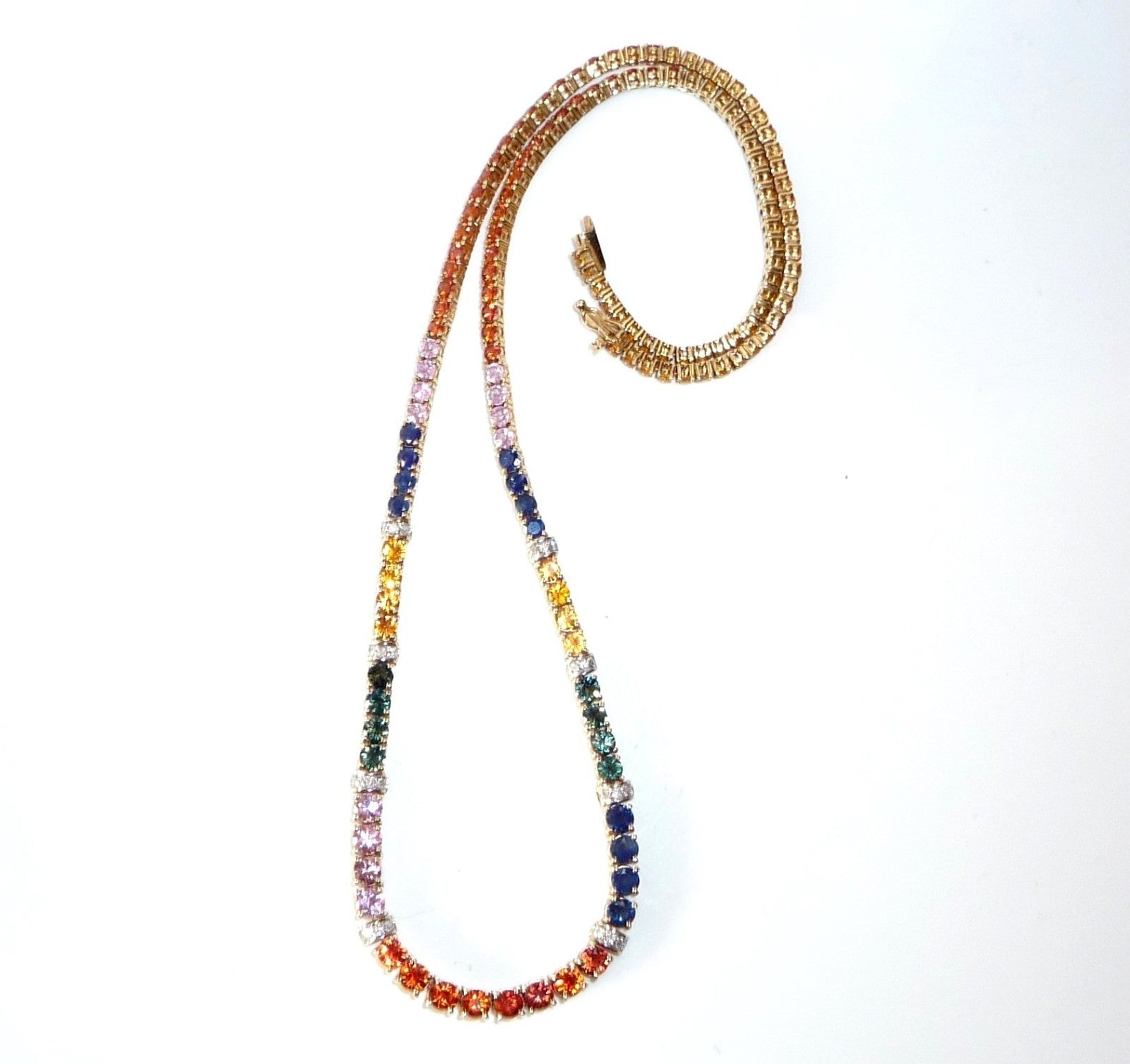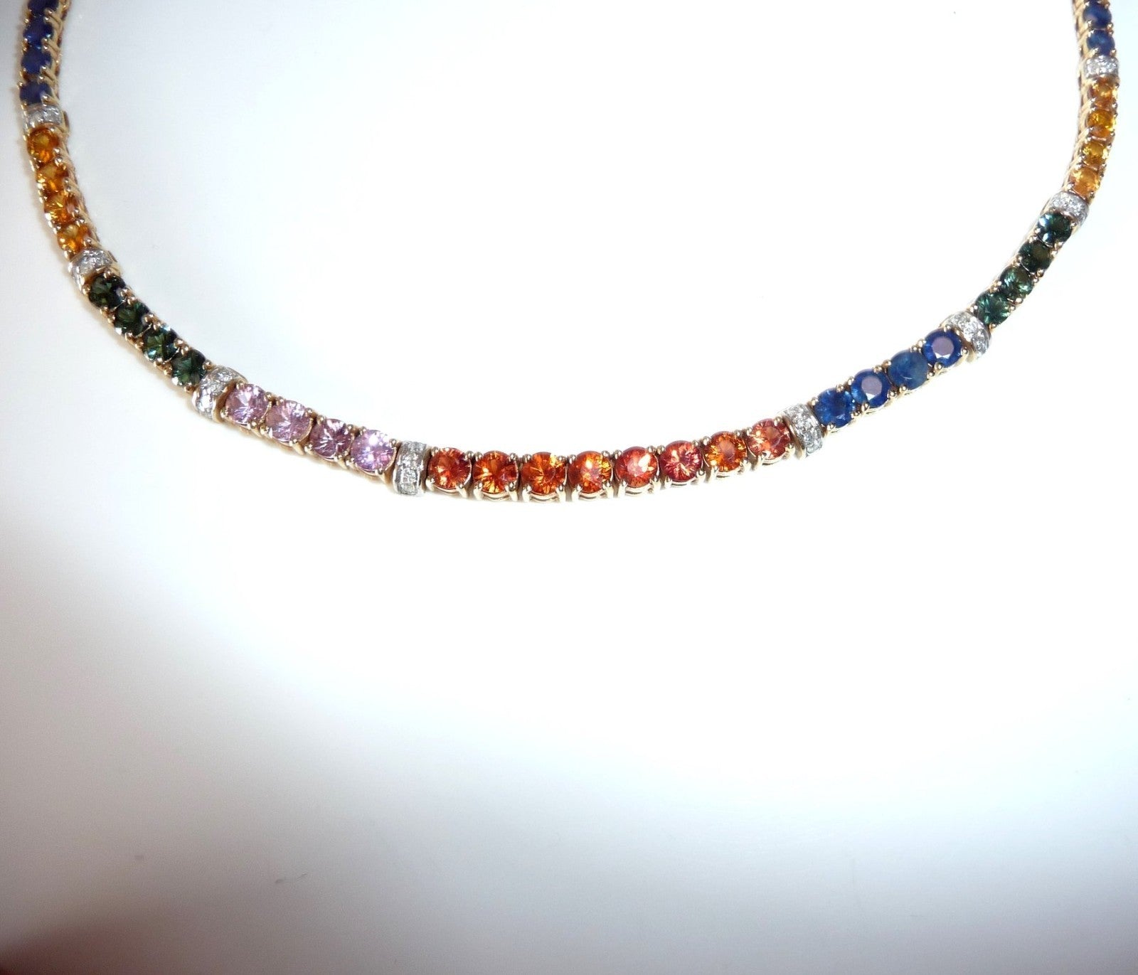 Die Collier-Kette ist im Verlauf gearbeitet und wird zur Mitte hin minimal breiter. Insgesamt sind 146 farbige Saphire von total ca. 10.50 ct. eingefasst. Vertreten sind dabei die Farben: gelb, orange, rosa, grün, blau und intensives, kräftiges Orange. Im vorderen Bereich sind die Farben in farblich geordnete Segmente eingeteilt und die Farb-Segmente sind jeweils durch kleine Weißgold-Brücken getrennt. Die Weißgold-Brücken haben insgesamt 28 Diamanten im Brillantschliff von total 0.30 ct. (G/SI-I) eingefasst.