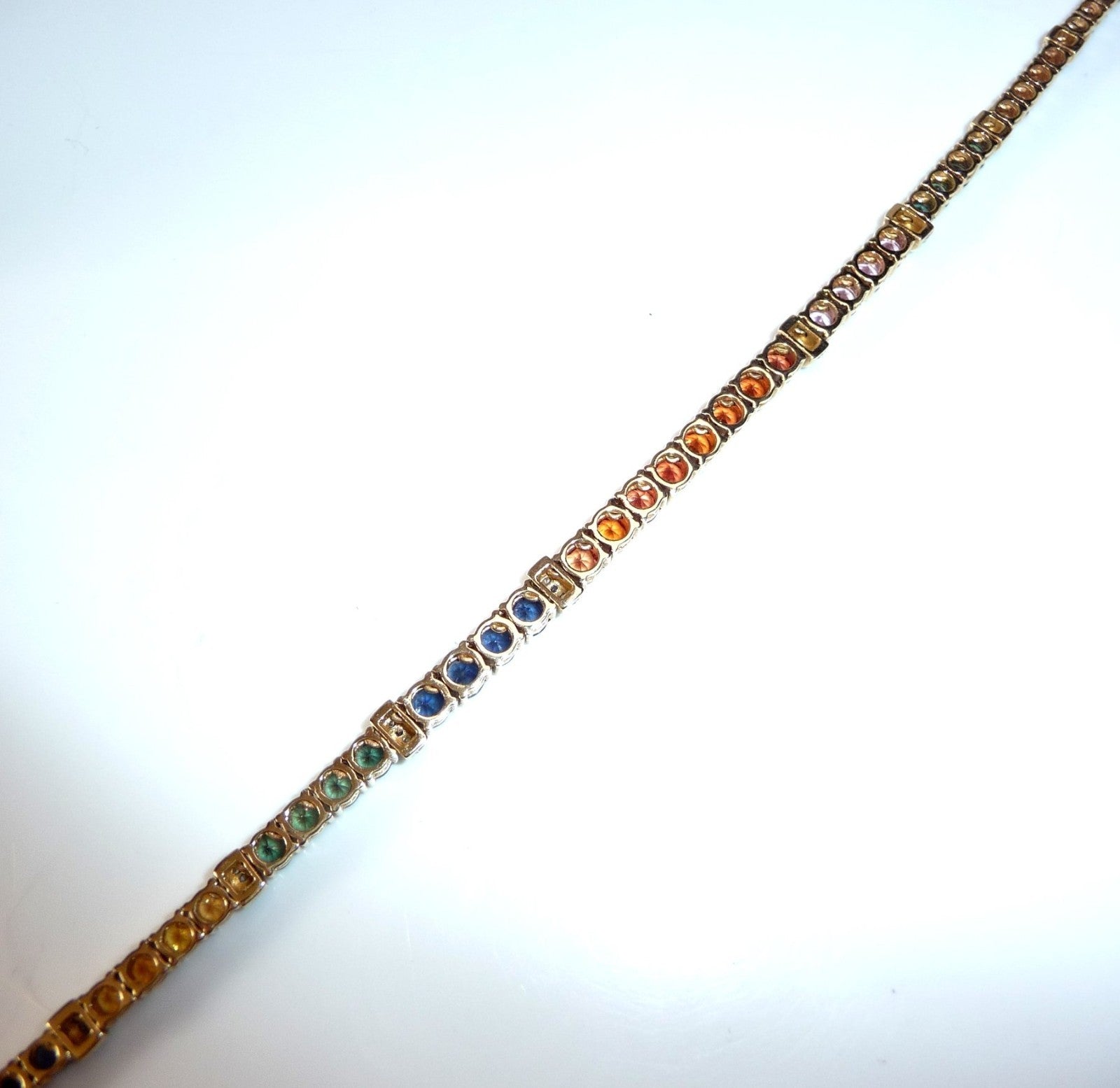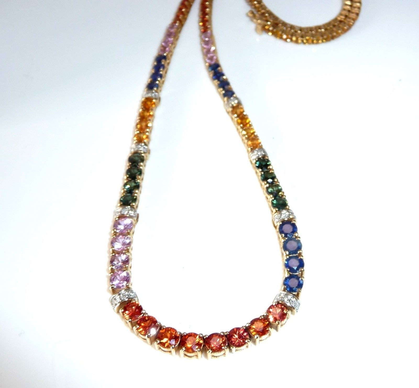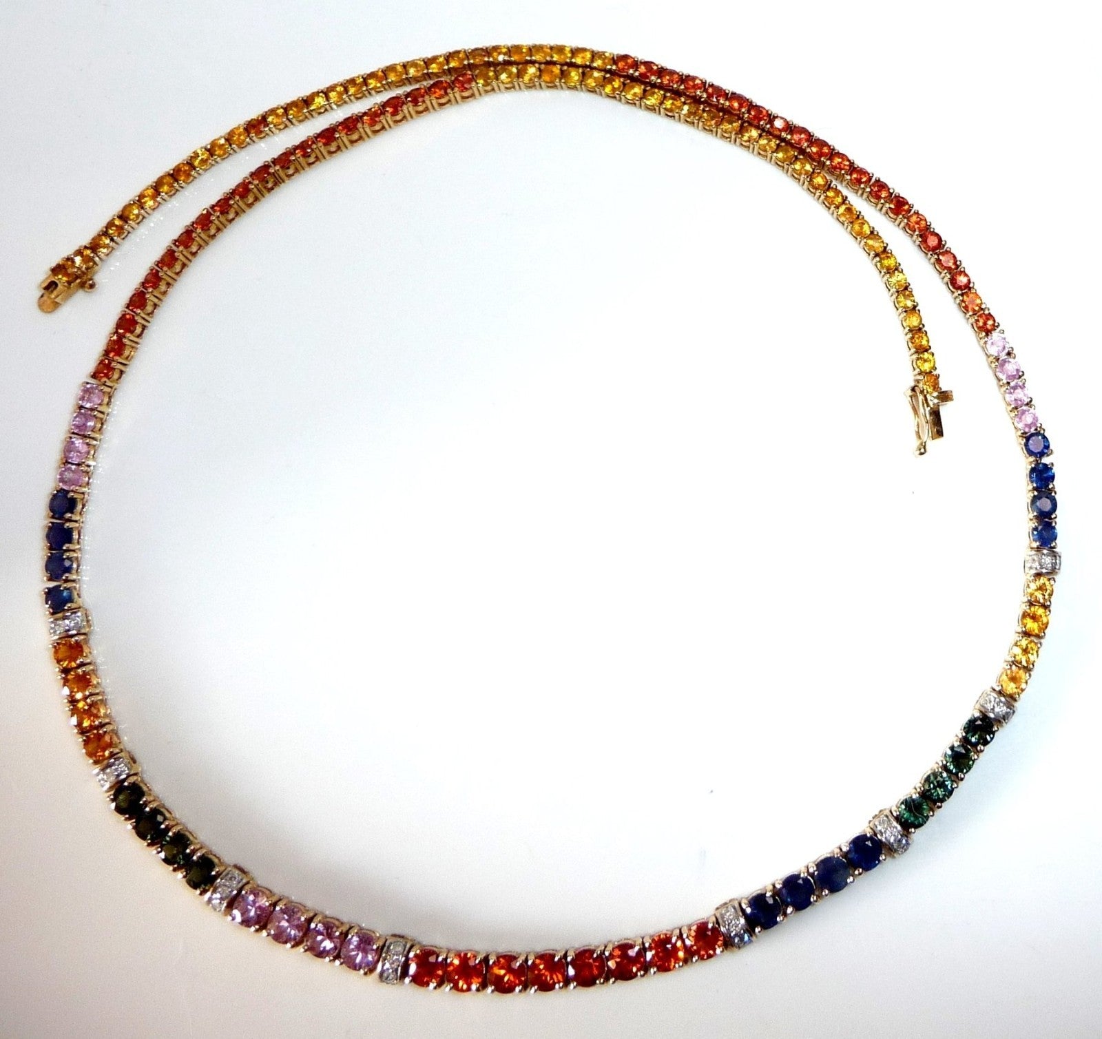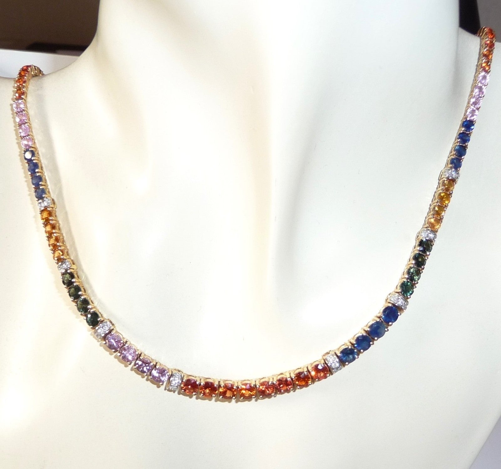 Die Collier-Kette ist im Verlauf gearbeitet und wird zur Mitte hin minimal breiter. Insgesamt sind 146 farbige Saphire von total ca. 10.50 ct. eingefasst. Vertreten sind dabei die Farben: gelb, orange, rosa, grün, blau und intensives, kräftiges Orange. Im vorderen Bereich sind die Farben in farblich geordnete Segmente eingeteilt und die Farb-Segmente sind jeweils durch kleine Weißgold-Brücken getrennt. Die Weißgold-Brücken haben insgesamt 28 Diamanten im Brillantschliff von total 0.30 ct. (G/SI-I) eingefasst.