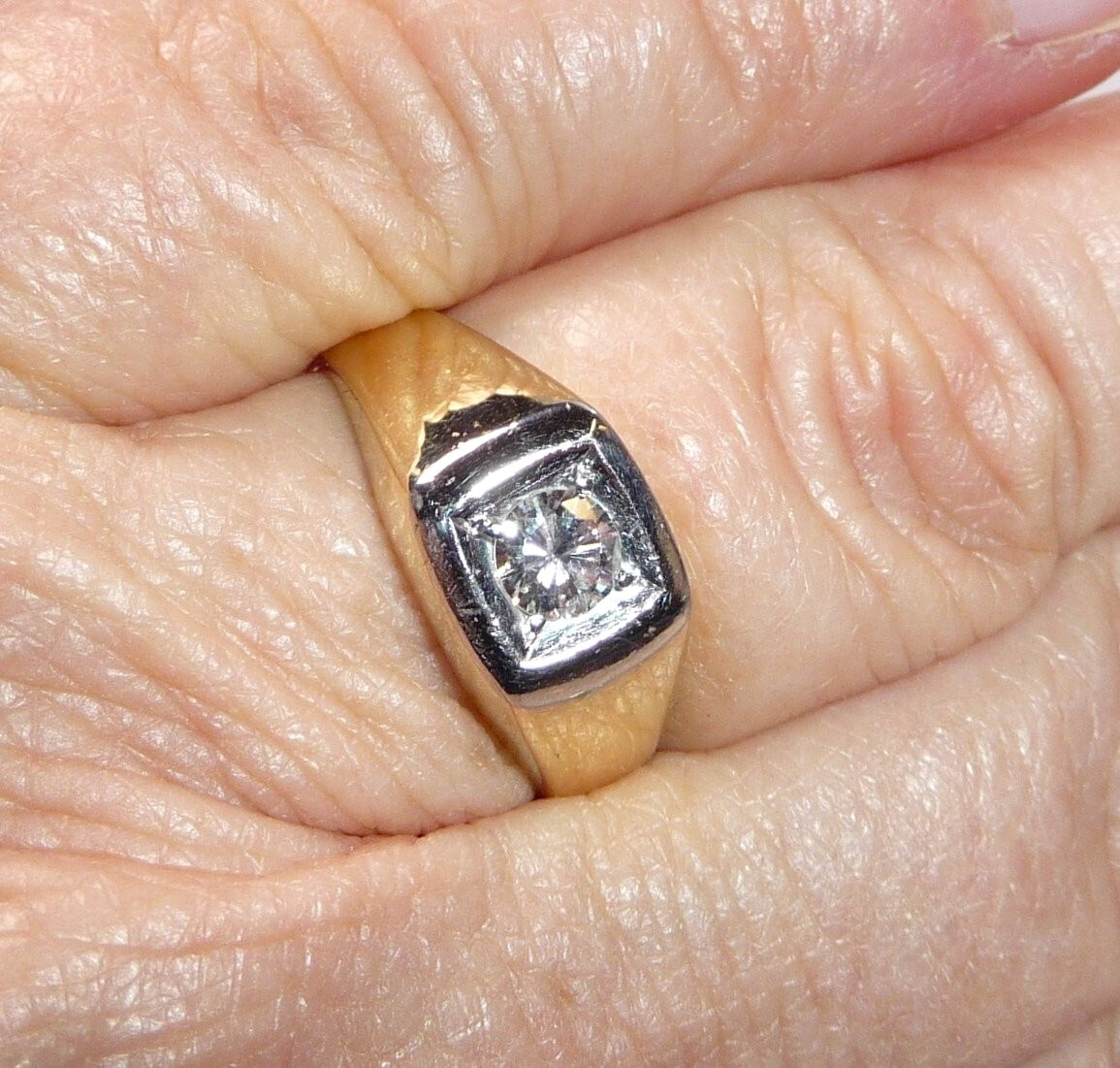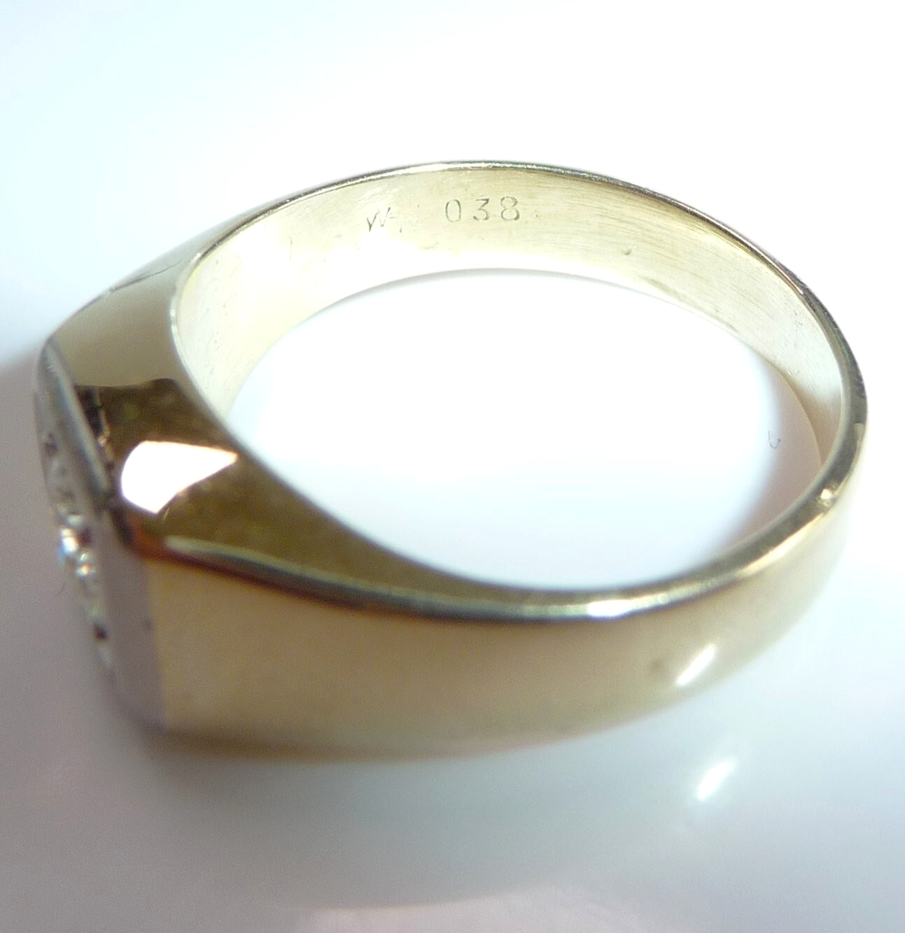Der Ring hat eine elegante, glatte Form, die ideal im Alltag zu tragen ist. Die Ringschiene verbreitert sich nach oben und mündet in einer quadratischen Weißgold-Fassung. In dieses Weißgold-Quadrat wurde ein großer Solitär-Diamant im Brillantschliff von 0.38 ct. eingefasst. Dieses Karat-Gewicht ist in der Ringschiene eingepunzt. Ebenso ist noch ein "W" für Wesselton/Weiß zuerkennen. Das entspricht der Farb-Graduierung H-G. Reinheit ist SI.