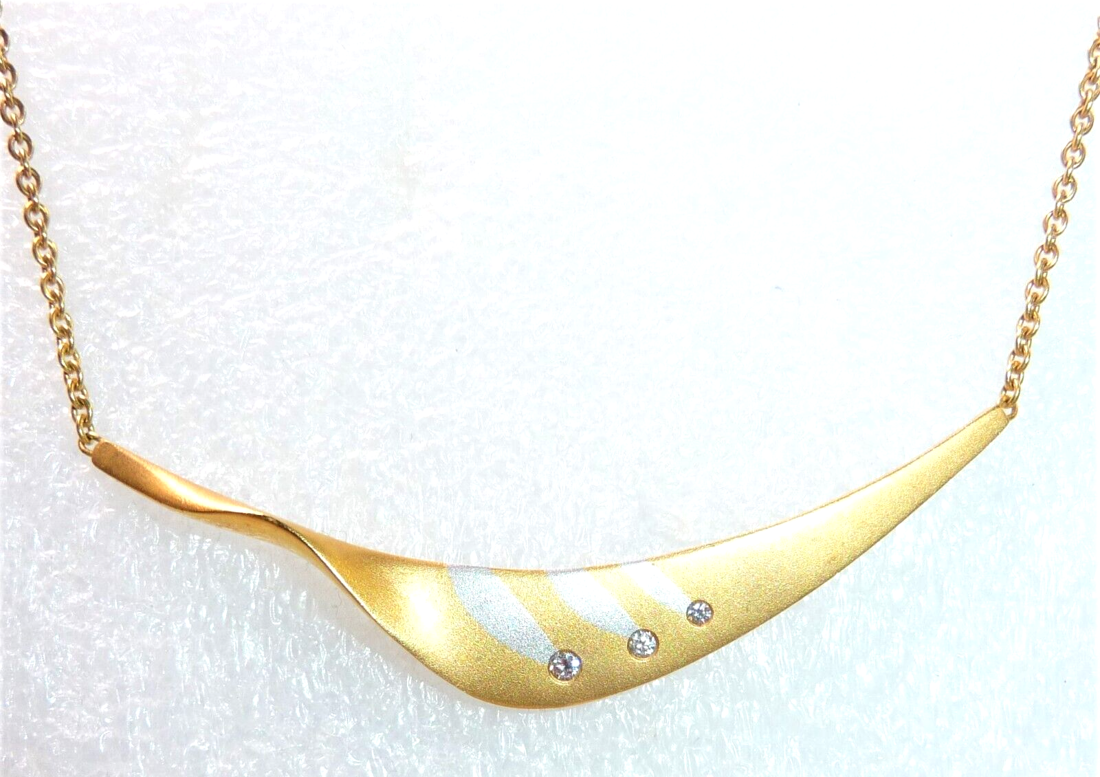 Kreative Collier-Kette in hochwertigem 18 K / 750 Gelbgold mit 950 Platin Inlays. Die Kette ist eine von Hand gefertigte Goldschmiede-Arbeit mit kreativer Note. Das Mittel-Stück hat drei Diamanten im Brillantschliff von total 0.075 ct. (F/VVS) eingefasst. Sie werden von einem Platin-Streifen akzentuiert. Die drei Platin-Streifen sind massive zwischen das Gold eingefügt. Exzellente Goldschmiede-Kunst. Eine stabile Ankerkette mit fein abgerundeten Gliedern komplettiert das stilvolle Schmuckstück.