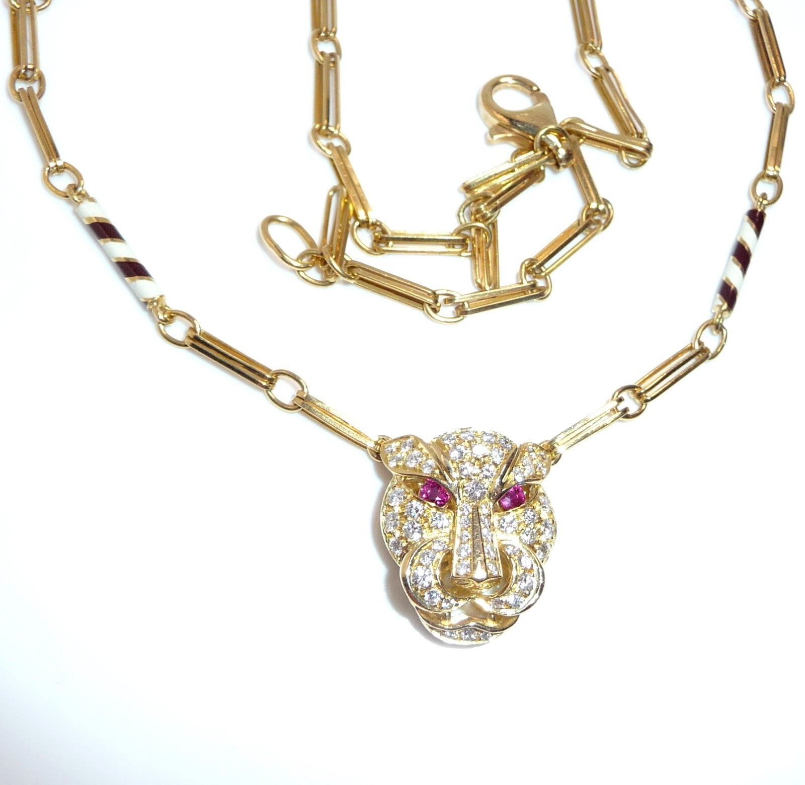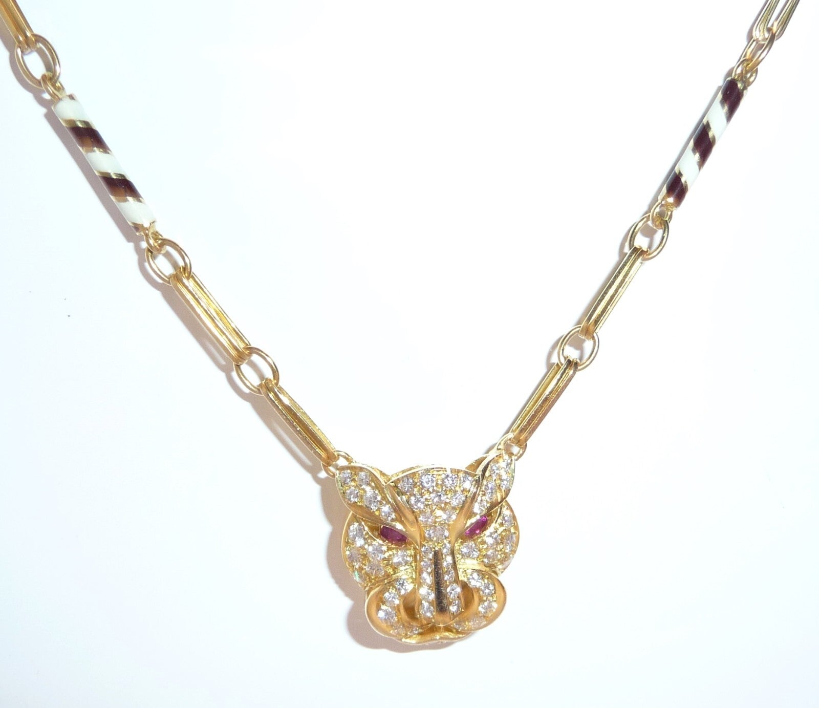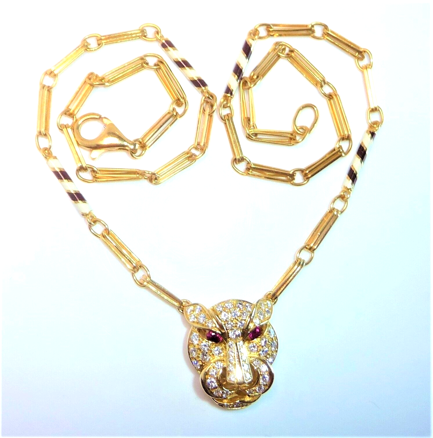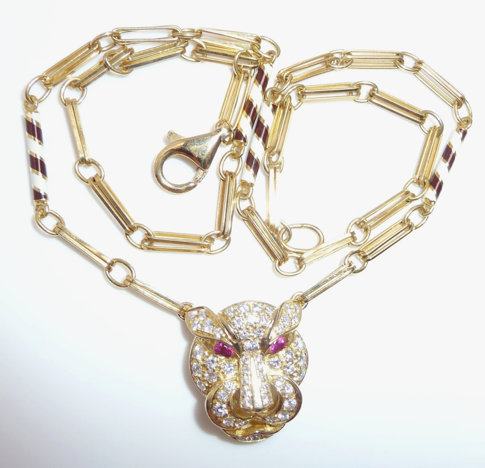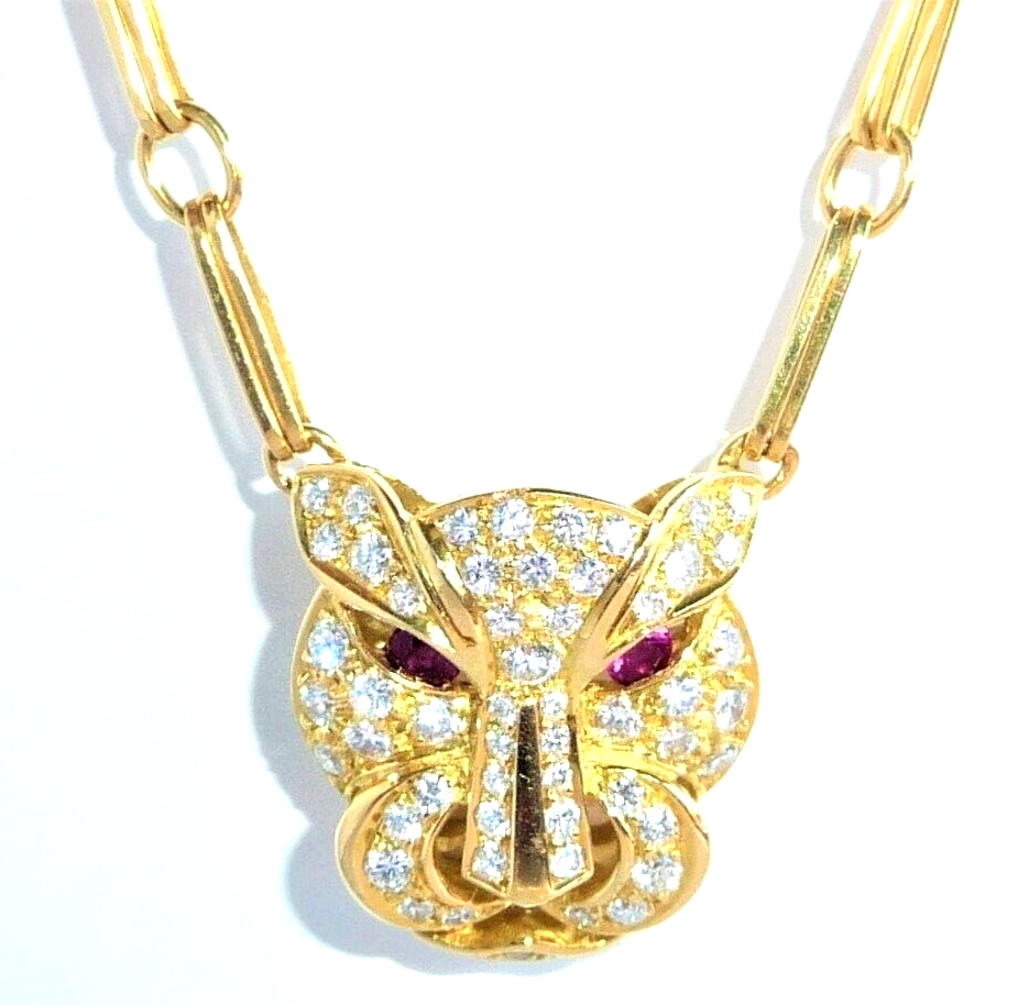Halskette / Collier in 750 / 18 K Gelbgold. An der feinen, von Hand gefertigten Kette ist der Kopf einer Raubkatze in der Mitte platziert Die Kette mit den Doppel-Gliedern hat im sichtbaren unteren Bereich insgesamt 4 Elemente mit schwarz-weißer Emaille-Verzierung eingefügt. Der Panther-Kopf ist bestückt mit insgesamt 55 Diamanten im Brillantschliff von total mindestens 1.10 bis 1.20  ct. (F/VVS). Die Augen werden durch blutrote Rubine von total 0.15 ct. akzentuiert.