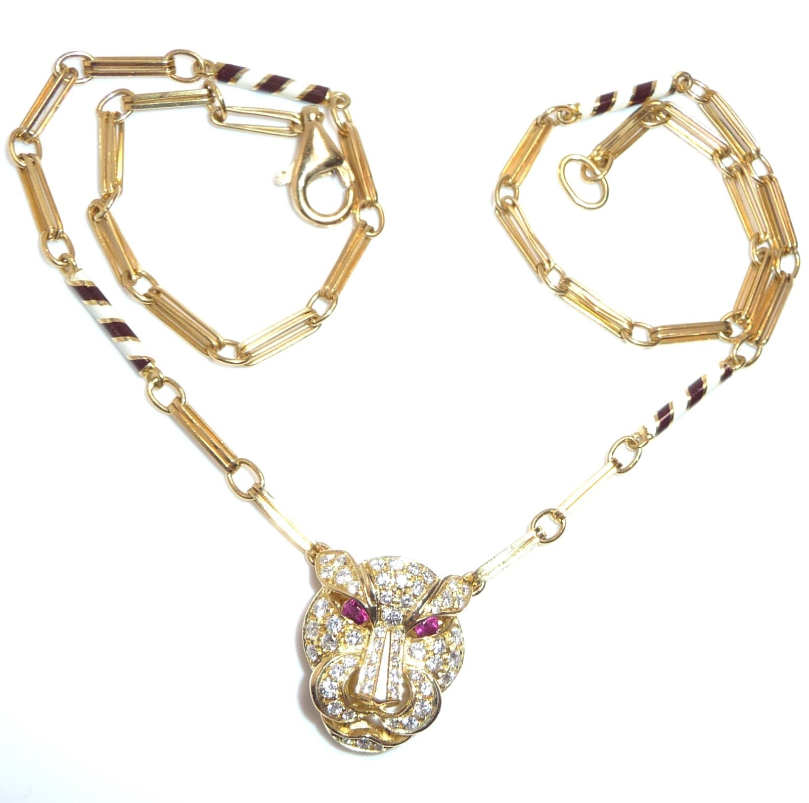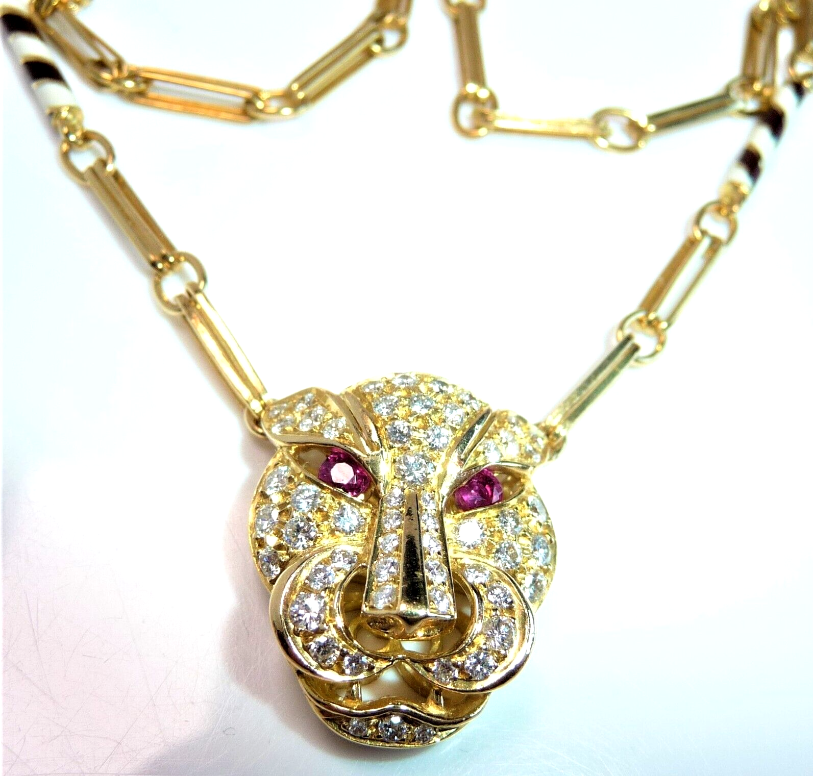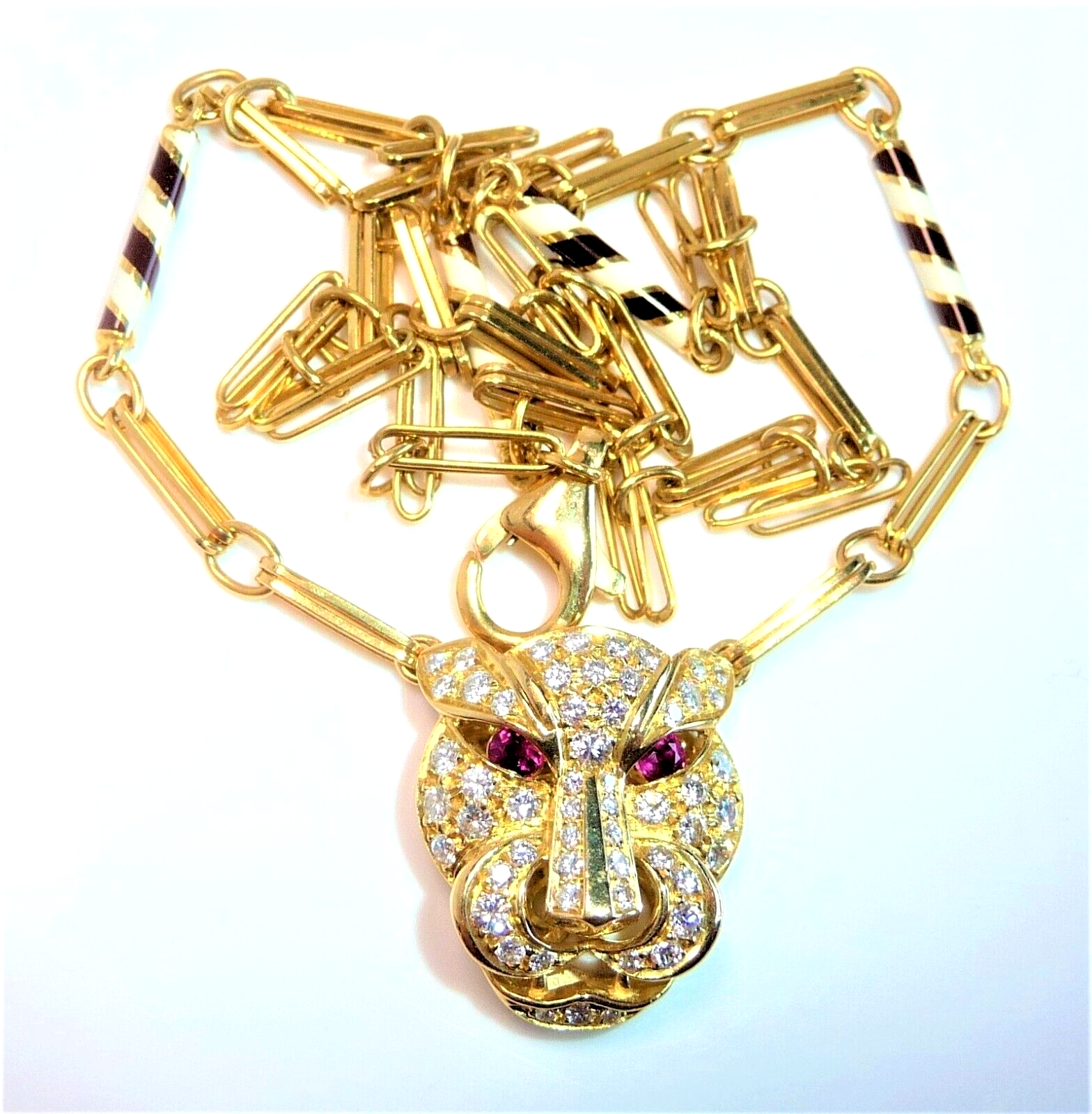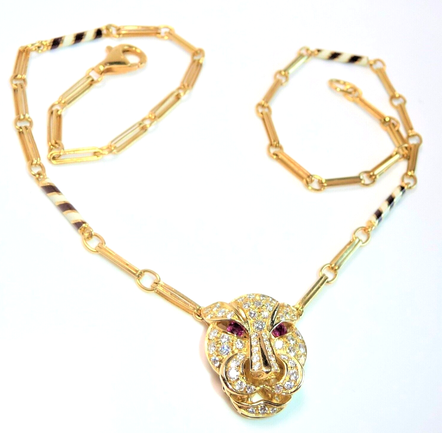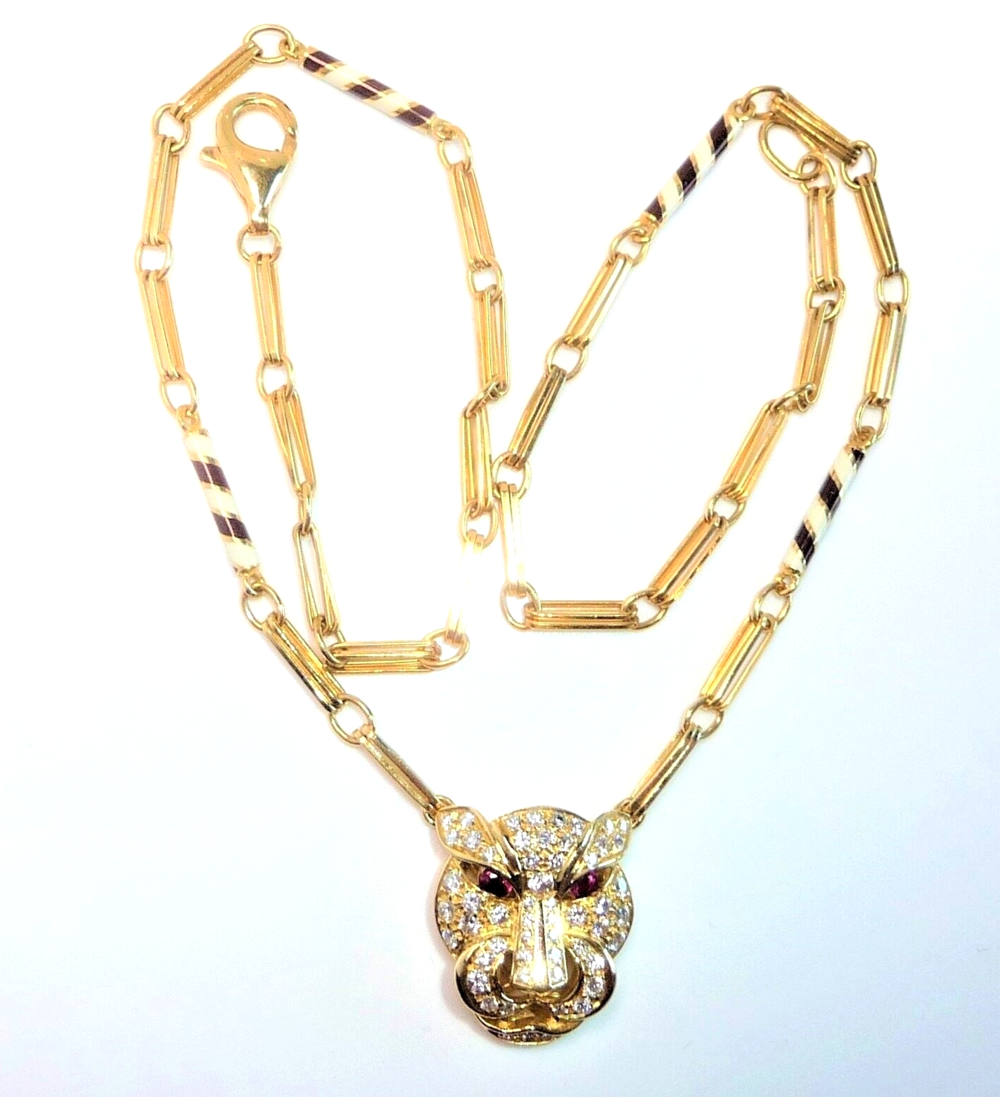 Halskette / Collier in 750 / 18 K Gelbgold. An der feinen, von Hand gefertigten Kette ist der Kopf einer Raubkatze in der Mitte platziert Die Kette mit den Doppel-Gliedern hat im sichtbaren unteren Bereich insgesamt 4 Elemente mit schwarz-weißer Emaille-Verzierung eingefügt. Der Panther-Kopf ist bestückt mit insgesamt 55 Diamanten im Brillantschliff von total mindestens 1.10 bis 1.20  ct. (F/VVS). Die Augen werden durch blutrote Rubine von total 0.15 ct. akzentuiert.