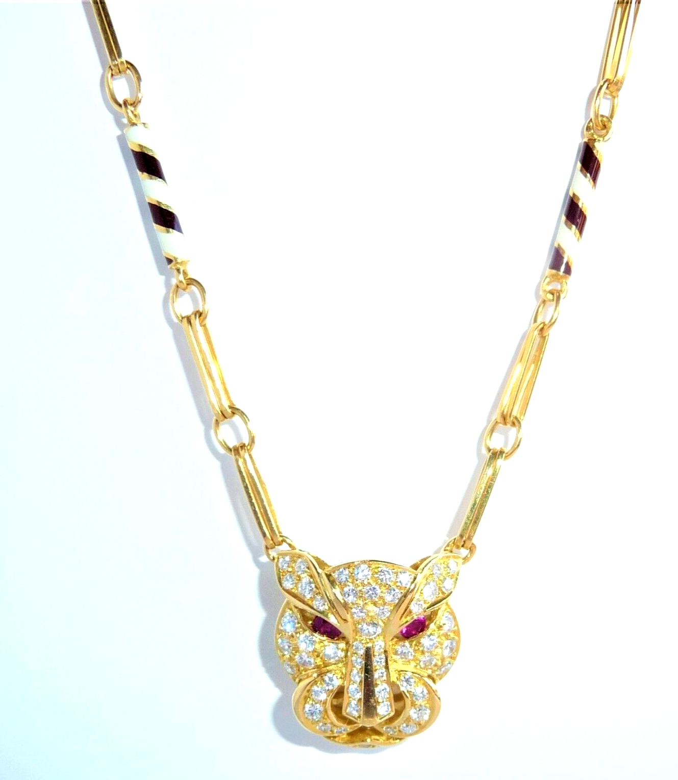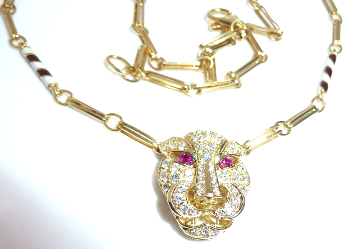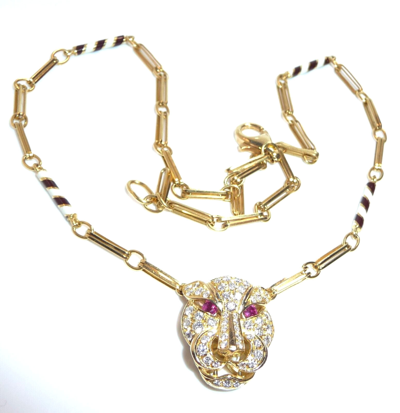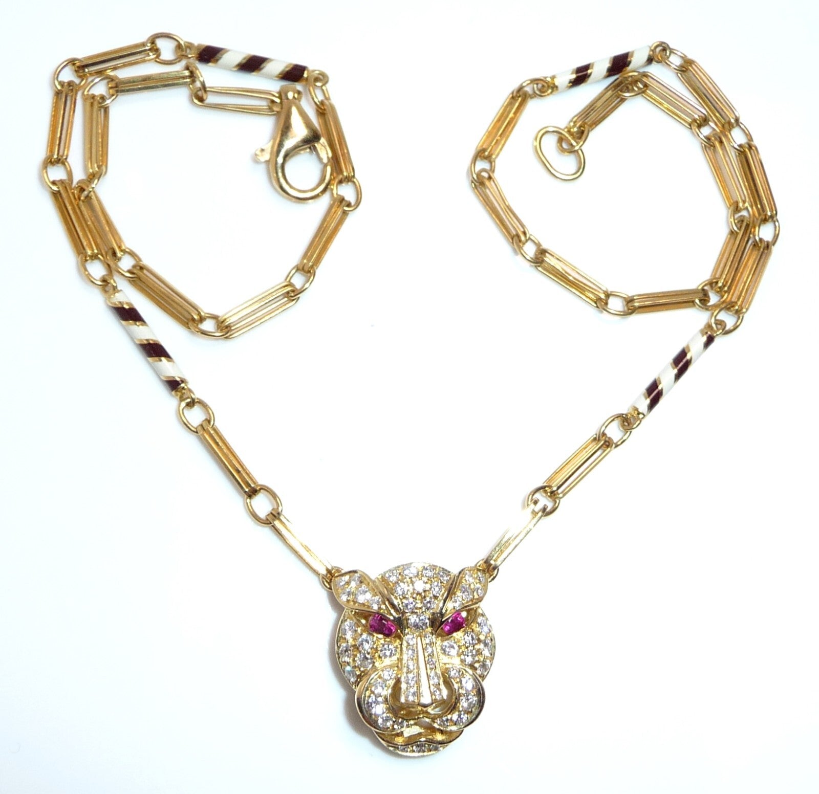 Halskette / Collier in 750 / 18 K Gelbgold. An der feinen, von Hand gefertigten Kette ist der Kopf einer Raubkatze in der Mitte platziert Die Kette mit den Doppel-Gliedern hat im sichtbaren unteren Bereich insgesamt 4 Elemente mit schwarz-weißer Emaille-Verzierung eingefügt. Der Panther-Kopf ist bestückt mit insgesamt 55 Diamanten im Brillantschliff von total mindestens 1.10 bis 1.20  ct. (F/VVS). Die Augen werden durch blutrote Rubine von total 0.15 ct. akzentuiert.