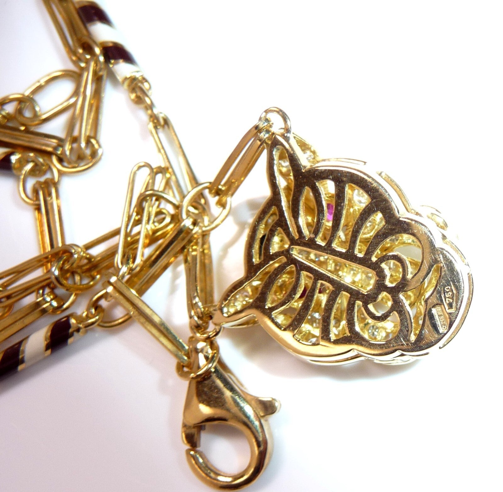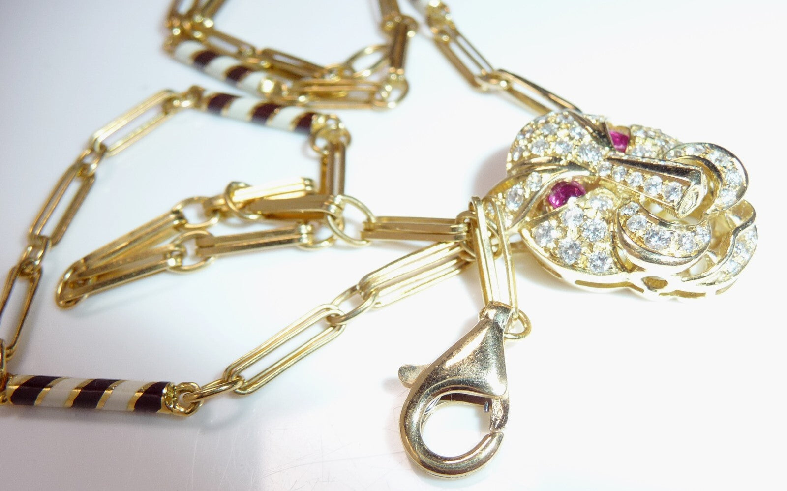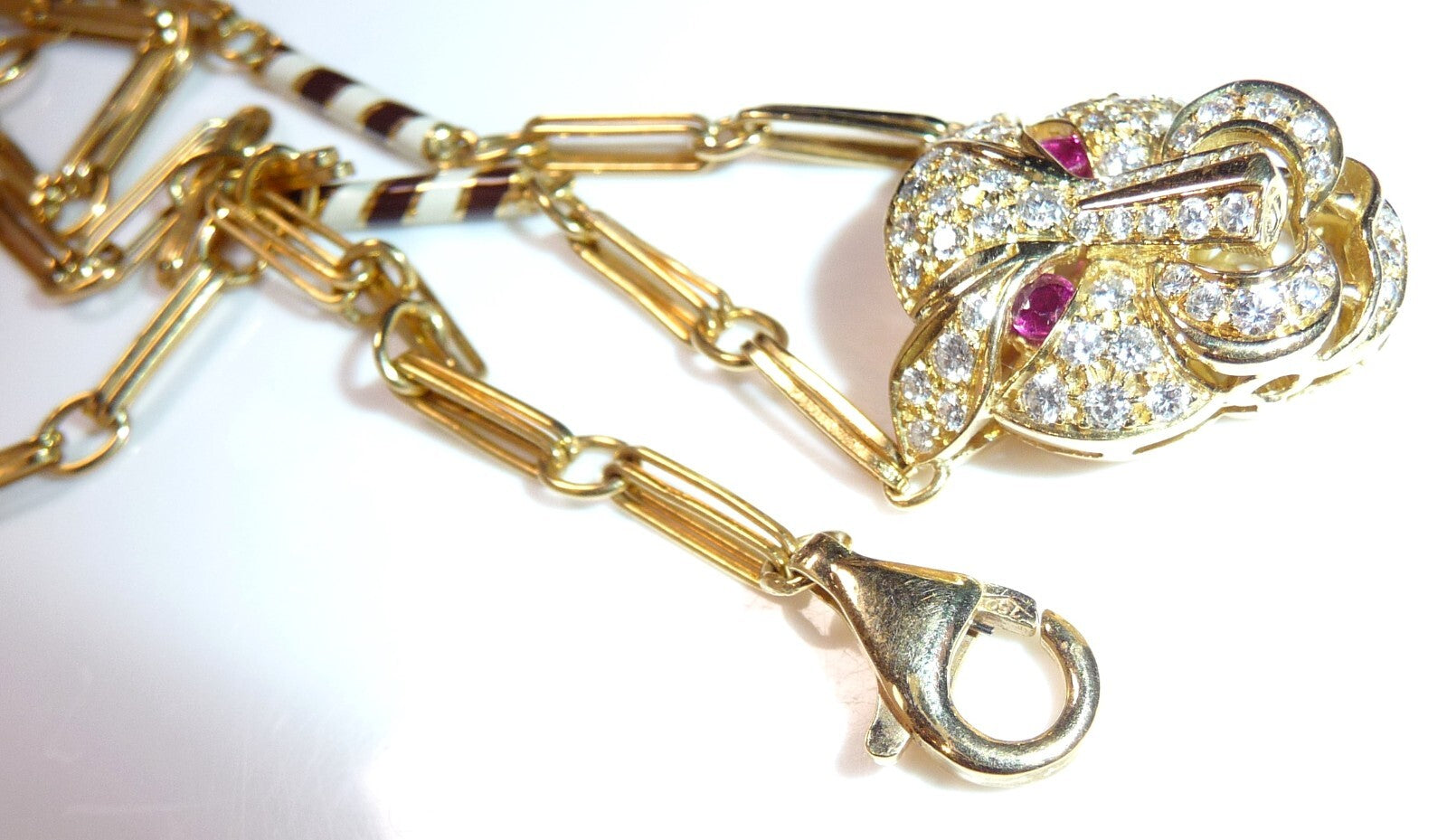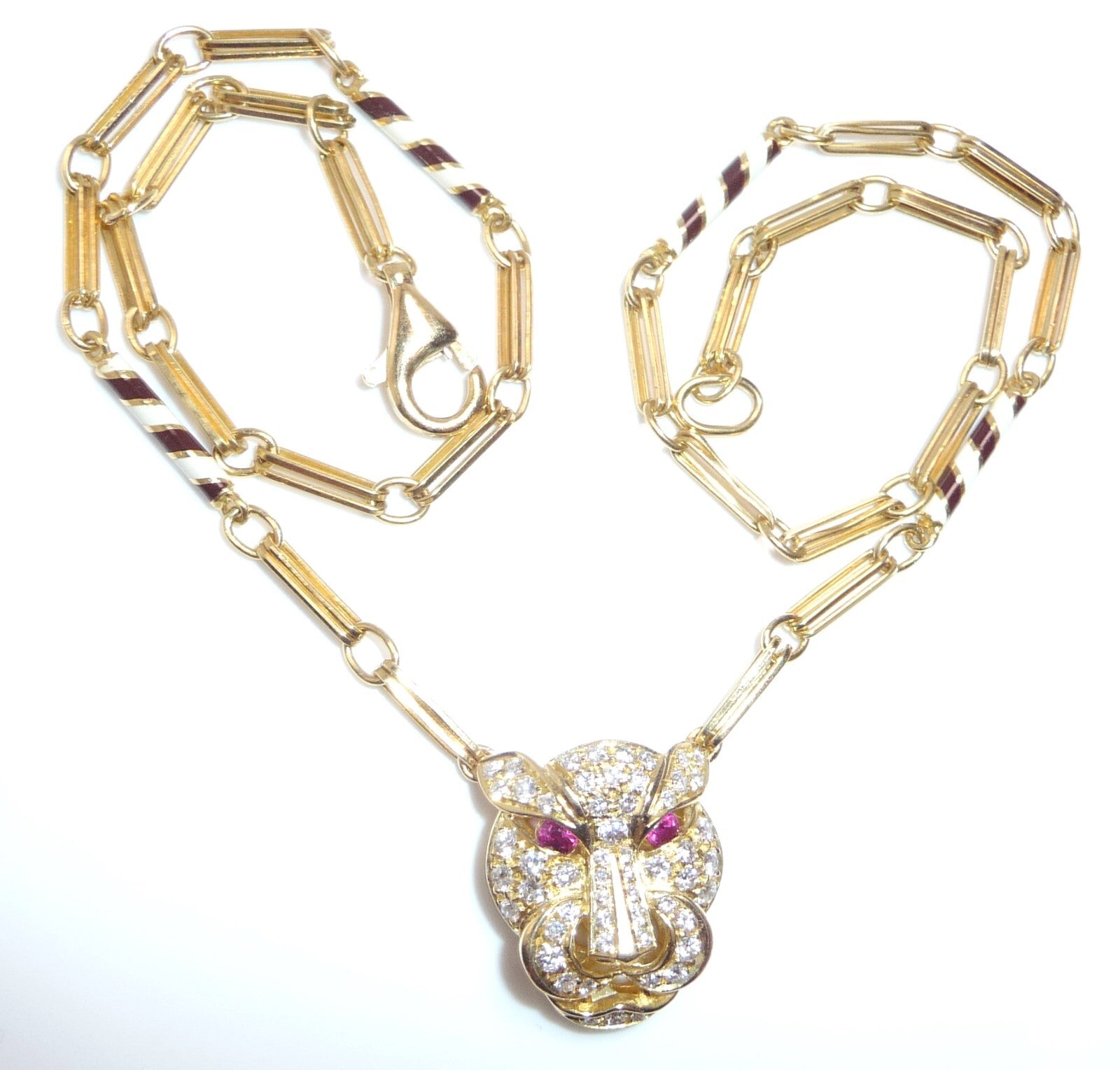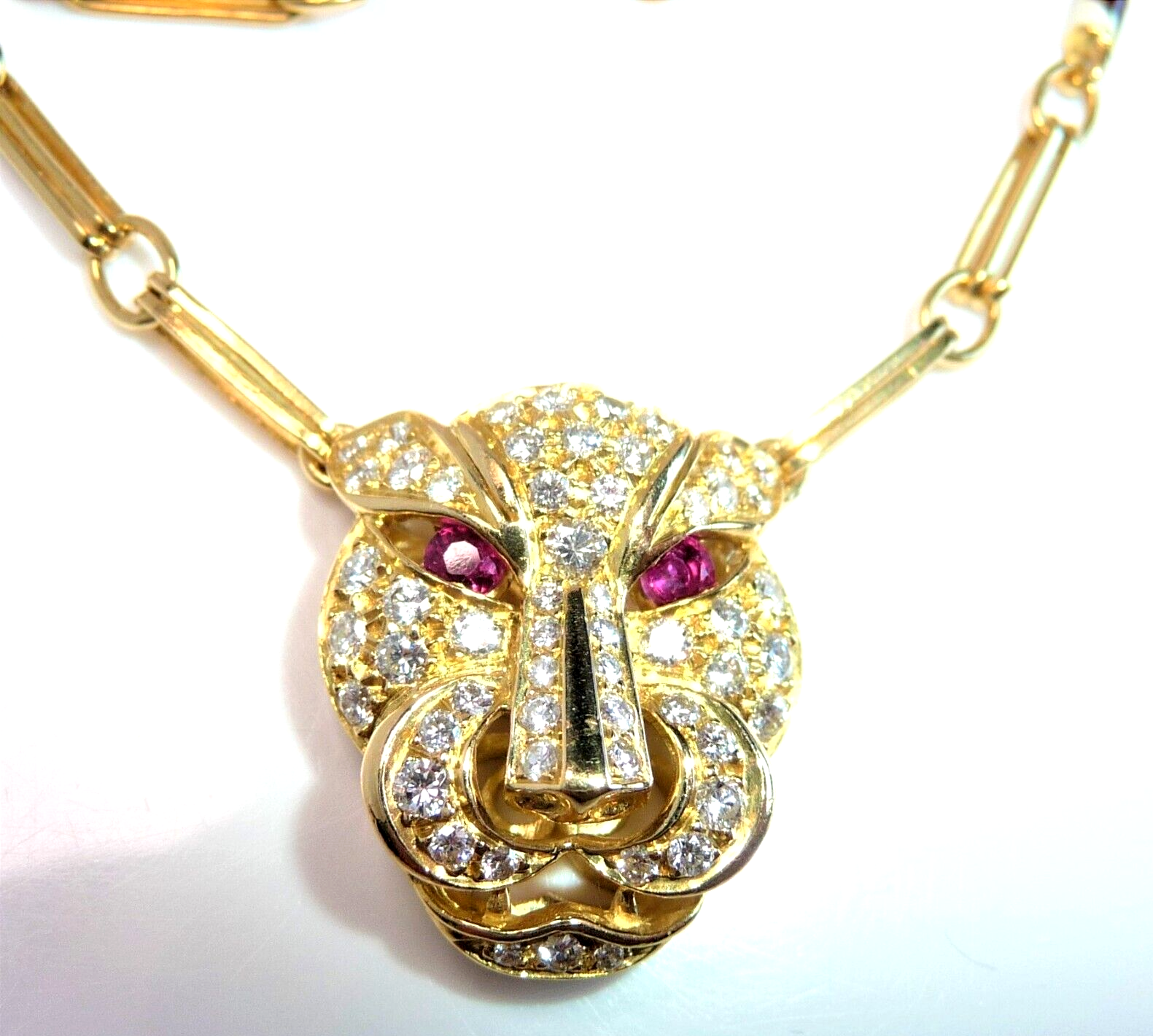 Halskette / Collier in 750 / 18 K Gelbgold. An der feinen, von Hand gefertigten Kette ist der Kopf einer Raubkatze in der Mitte platziert Die Kette mit den Doppel-Gliedern hat im sichtbaren unteren Bereich insgesamt 4 Elemente mit schwarz-weißer Emaille-Verzierung eingefügt. Der Panther-Kopf ist bestückt mit insgesamt 55 Diamanten im Brillantschliff von total mindestens 1.10 bis 1.20  ct. (F/VVS). Die Augen werden durch blutrote Rubine von total 0.15 ct. akzentuiert.