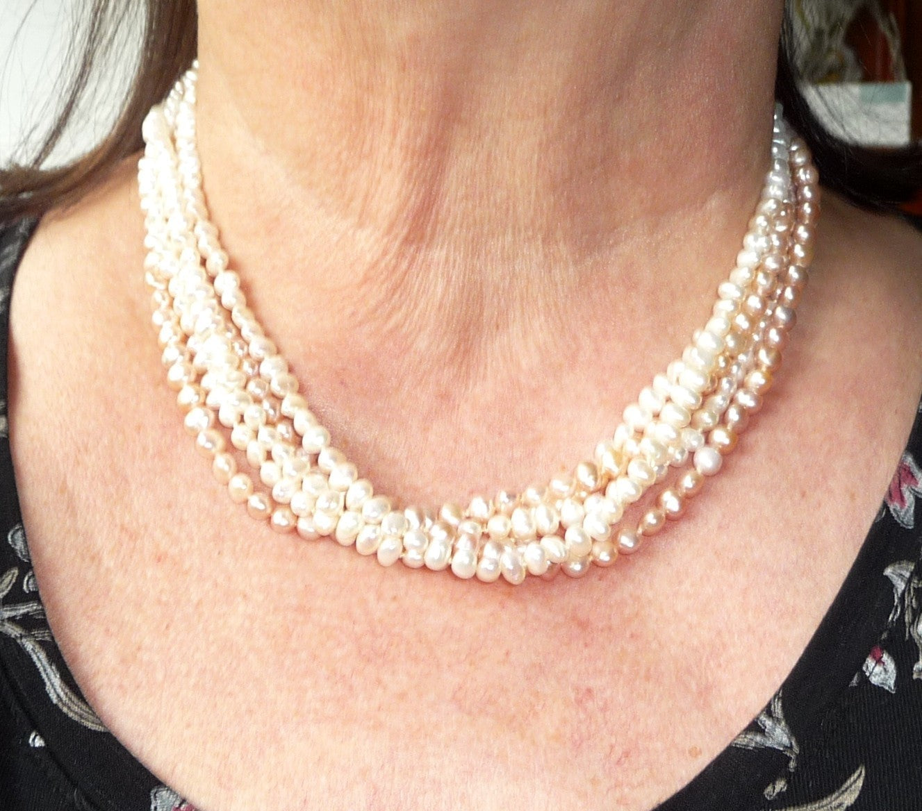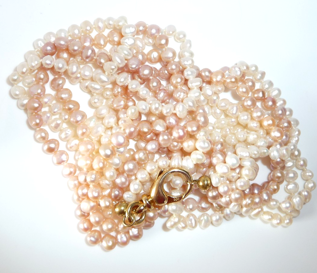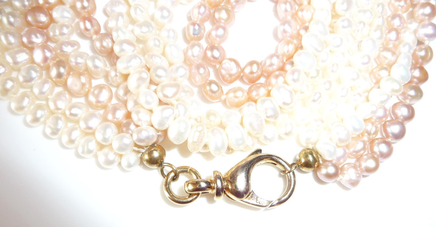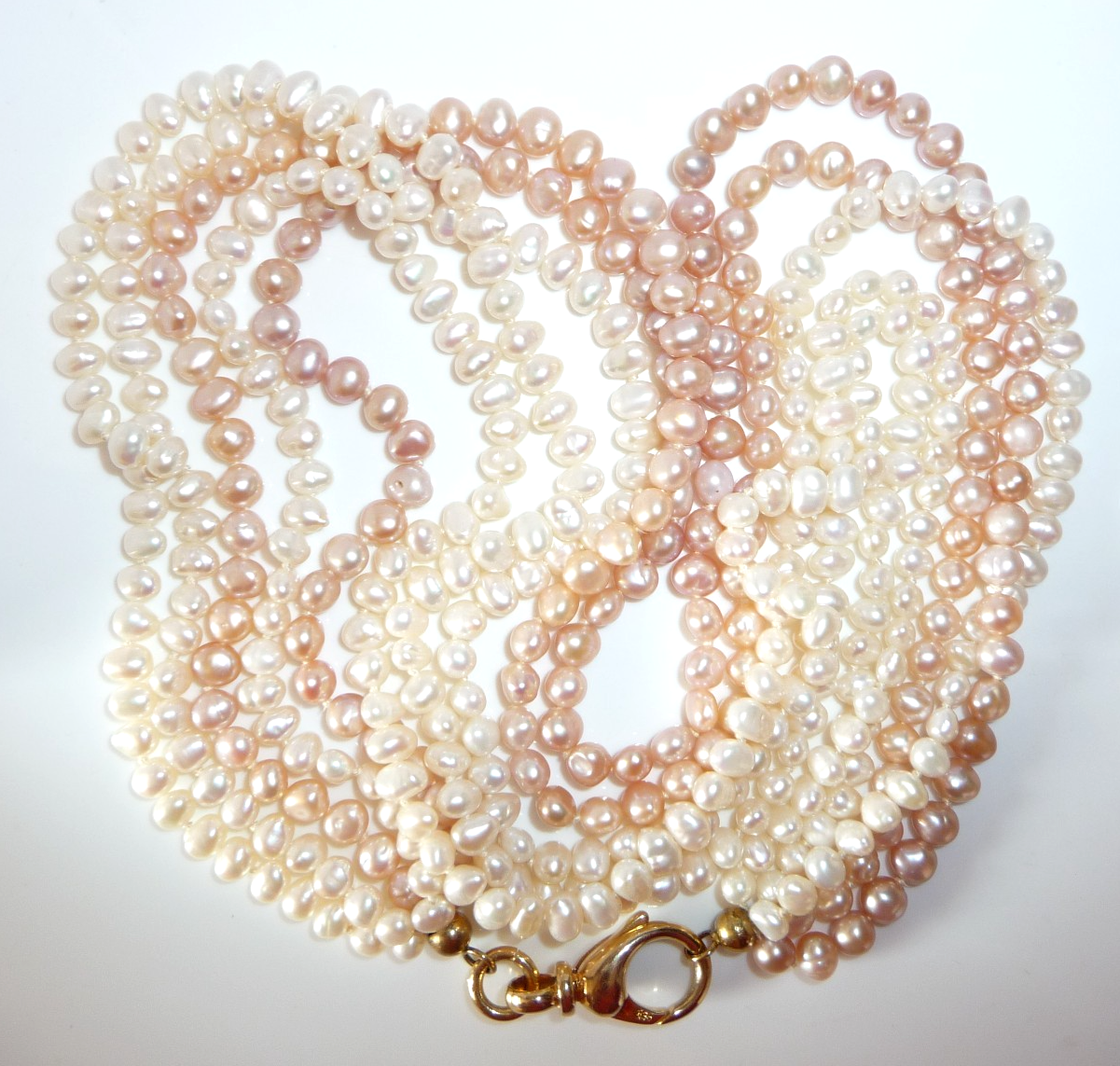 Bei den Perlen handelt es sich um sehr hochwertige, kernlose Süßwasser-Perlen mit hervorragendem Lüster. Es gibt 3 Stränge in weiß und 2 Stränge in zartem Rosa. Die Bündelung der vielen Perlen macht die Kette optisch sehr auffällig. Hinter jeder 2 bis 3. Perle ist ein Knoten. Die Kette ist also hochwertig und professionell aufgezogen.