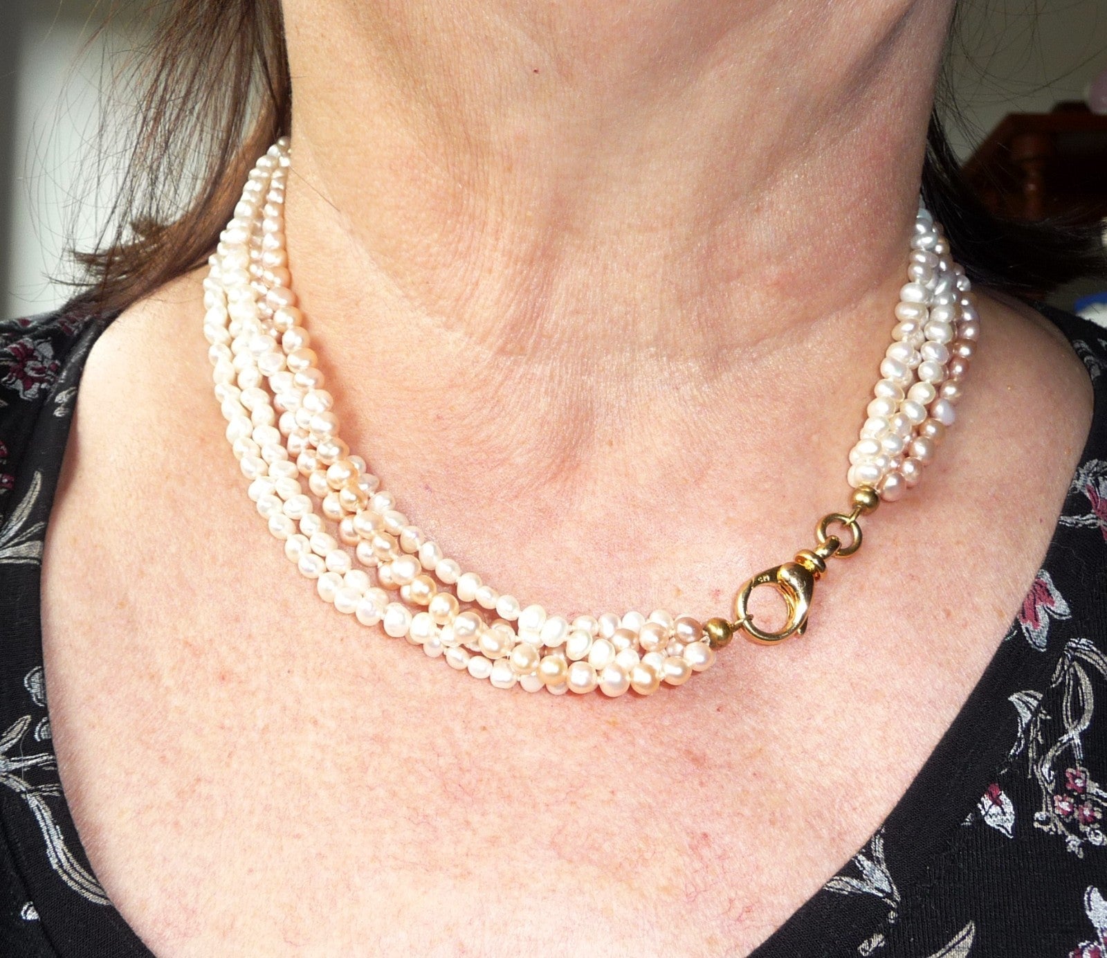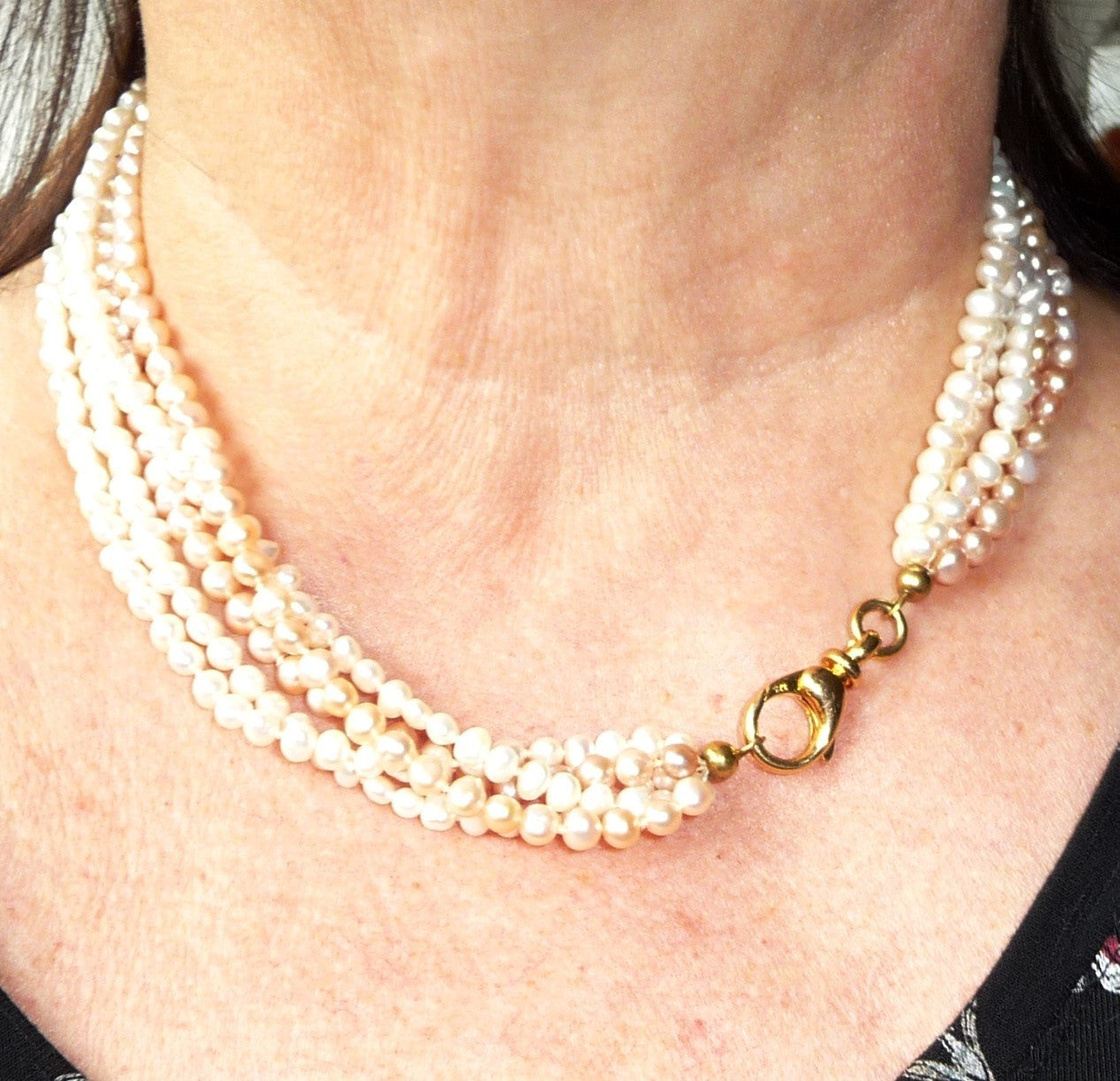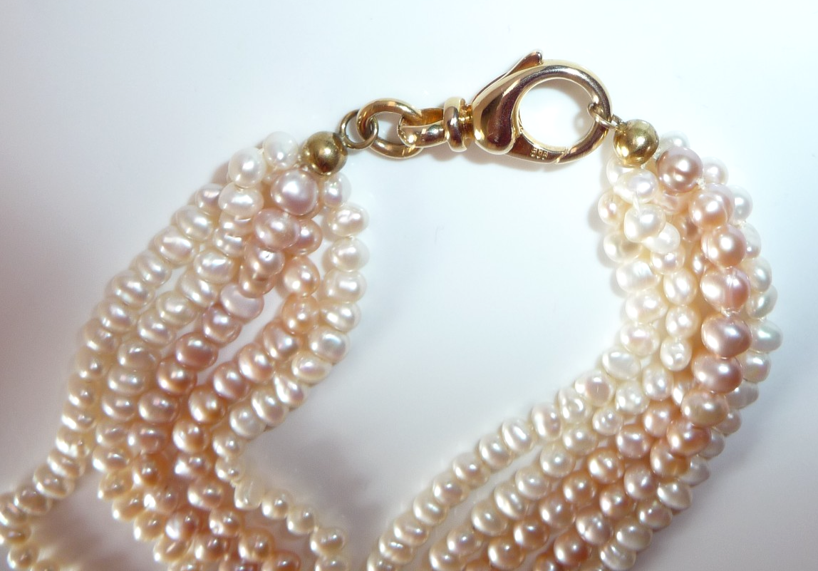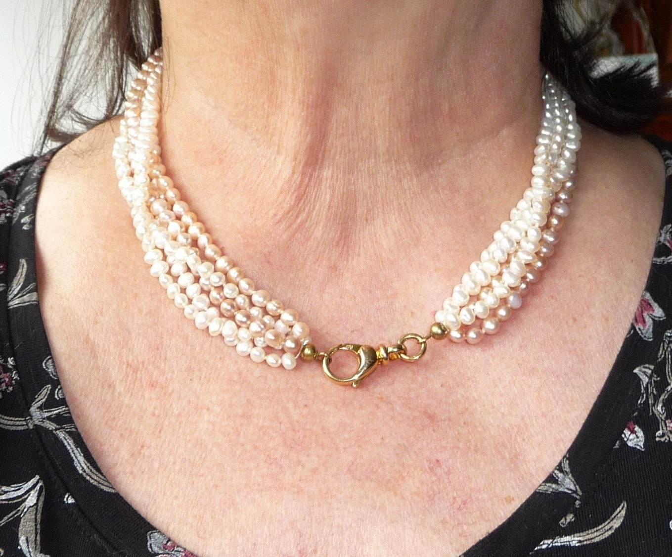 Bei den Perlen handelt es sich um sehr hochwertige, kernlose Süßwasser-Perlen mit hervorragendem Lüster. Es gibt 3 Stränge in weiß und 2 Stränge in zartem Rosa. Die Bündelung der vielen Perlen macht die Kette optisch sehr auffällig. Hinter jeder 2 bis 3. Perle ist ein Knoten. Die Kette ist also hochwertig und professionell aufgezogen.