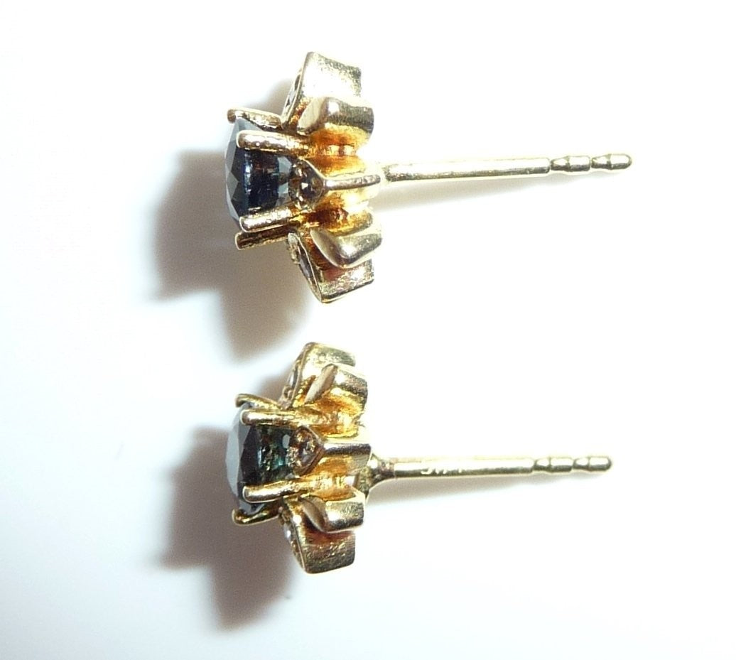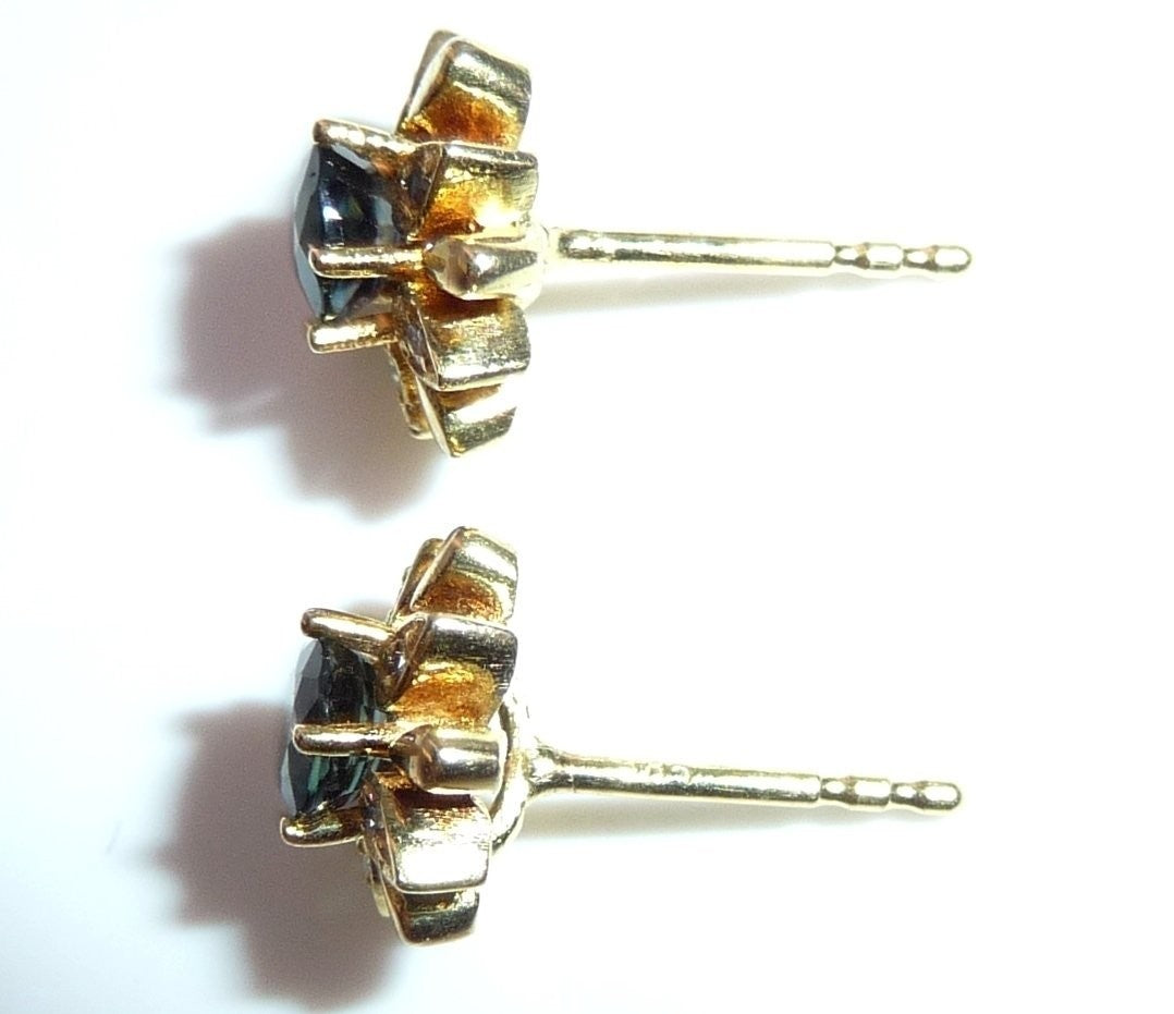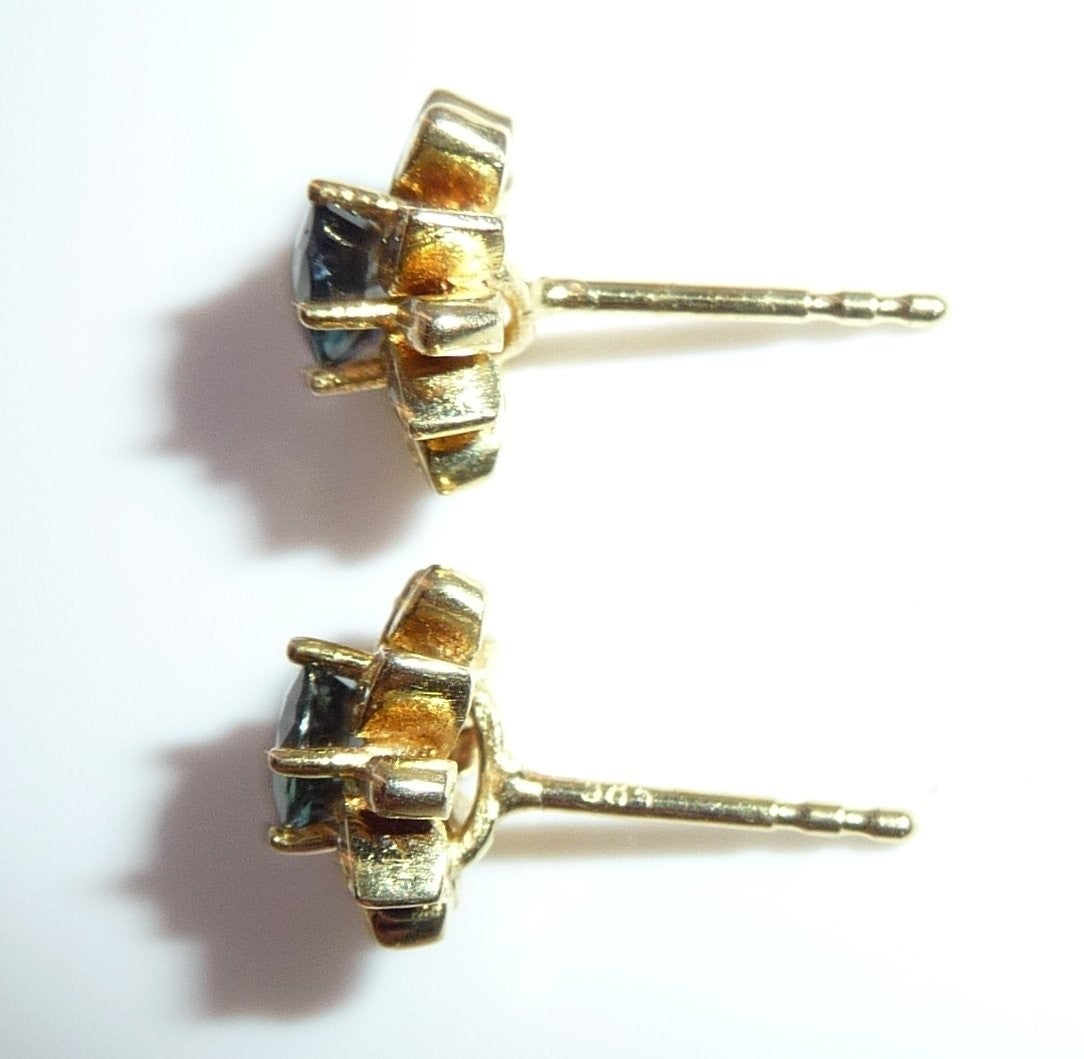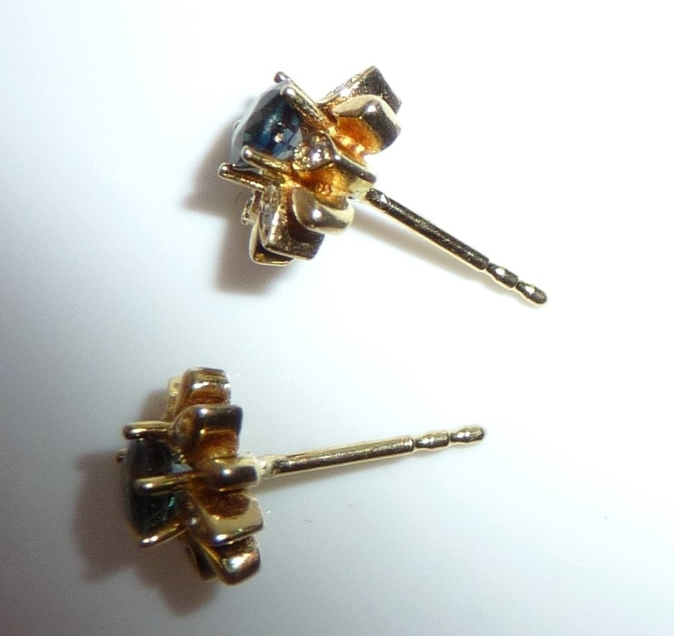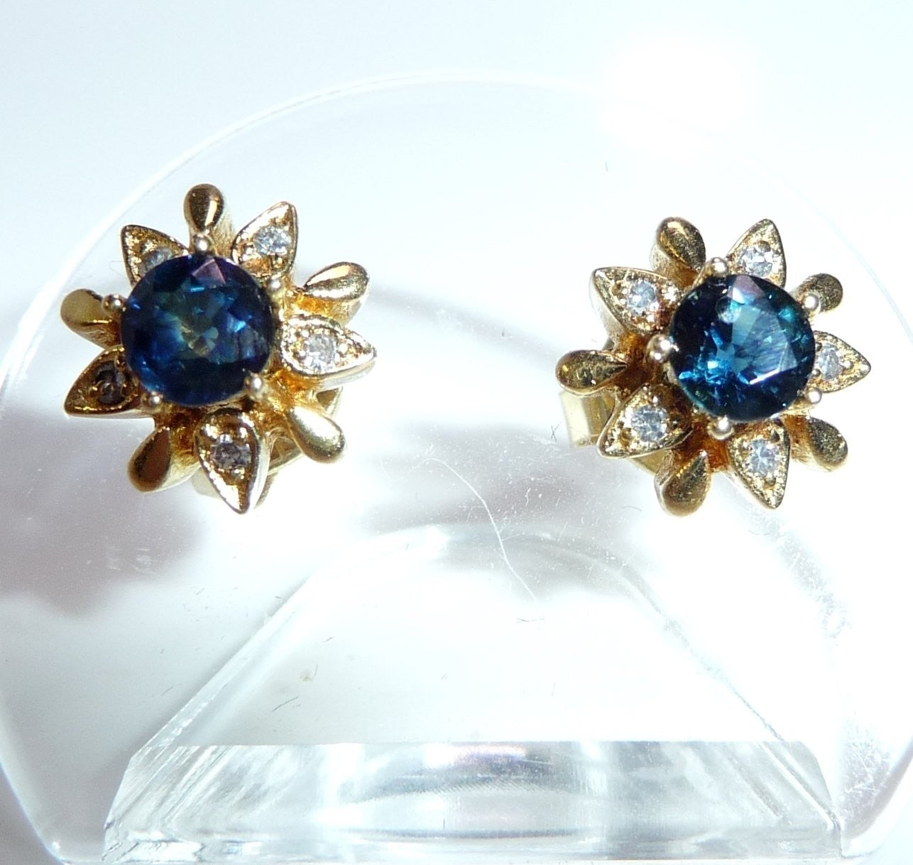 Ohrringe in 14 kt. / 585 Gelbgold. Die Ohrringe wie kleine Blüten gearbeitet.  Im Zentrum ist je ein Saphir in mittlerem Blau. Zusammen haben die runden Saphire 0.60 ct.
