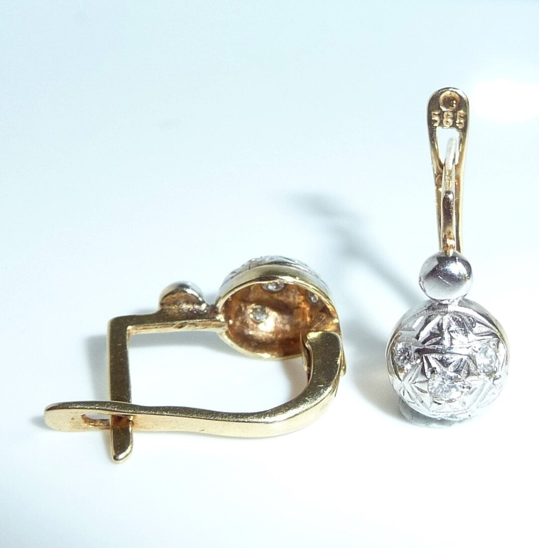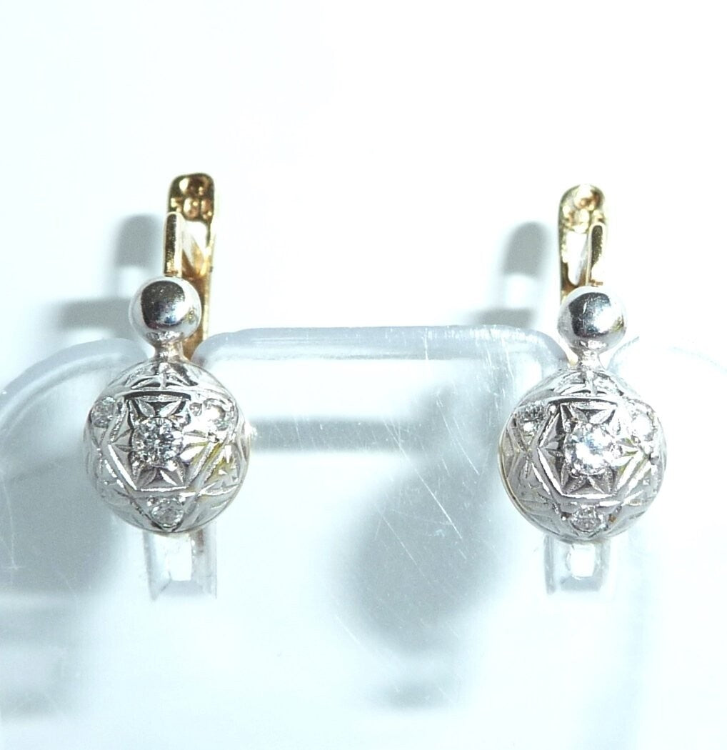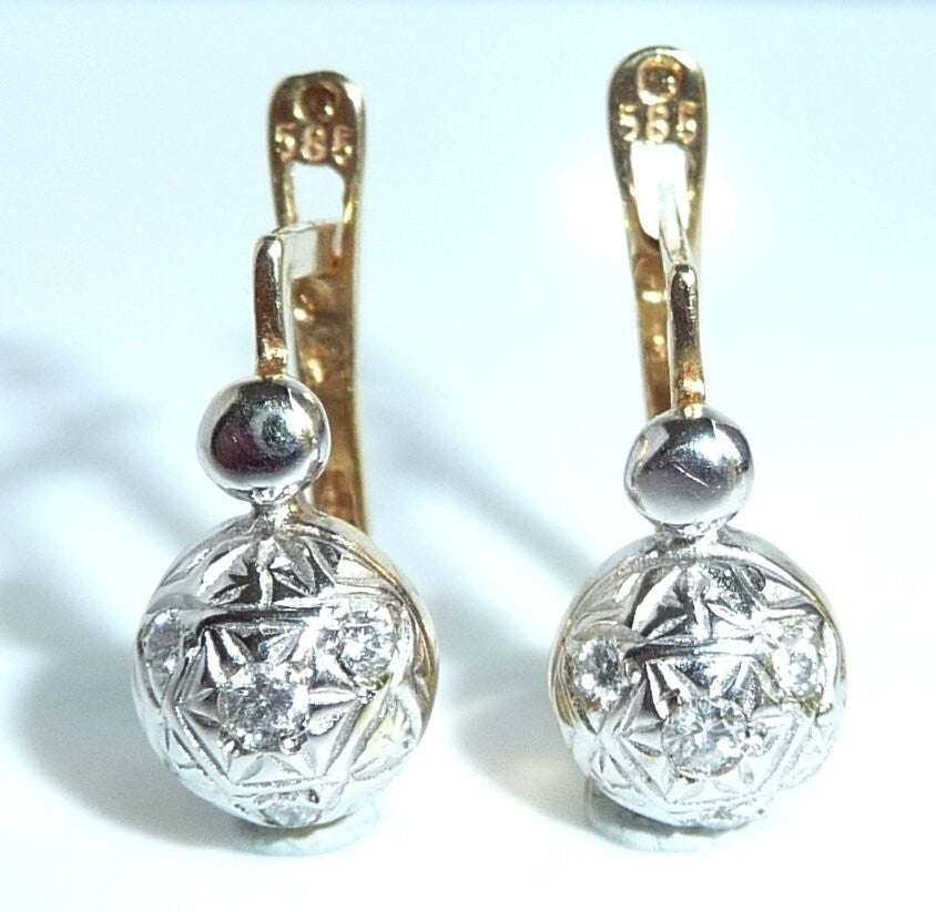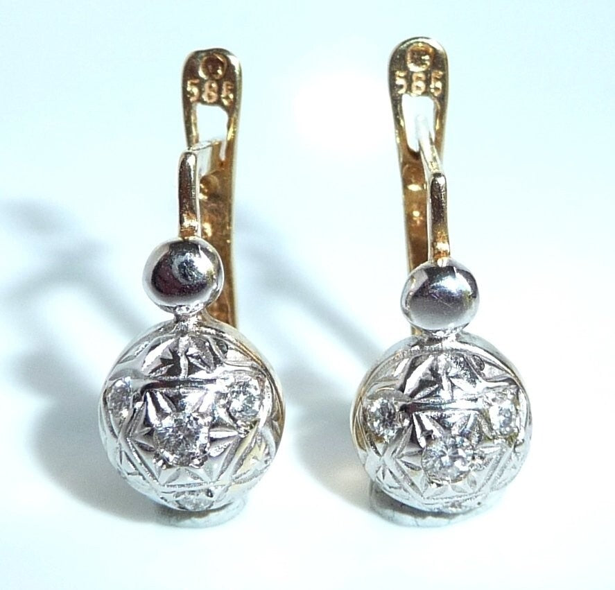 Ohrringe / Ohrhänger in 585 / 14 K Gelbgold mit einem Weißgold-Element auf der Vorderseite. Das Zier-Element ist eine Halb-Kugel in Weißgold, die jeweils mit 4 Diamanten im Brillantschliff besetzt ist. Zusammen haben die 8 Diamanten 0.20ct. (F/VS). Die Halbkugeln haben Verzierungen in Form von Kerben, die ein Muster bilden. Eine kleinere Kugel leitet über zu der Brisur.