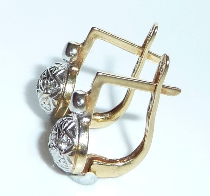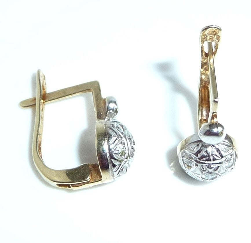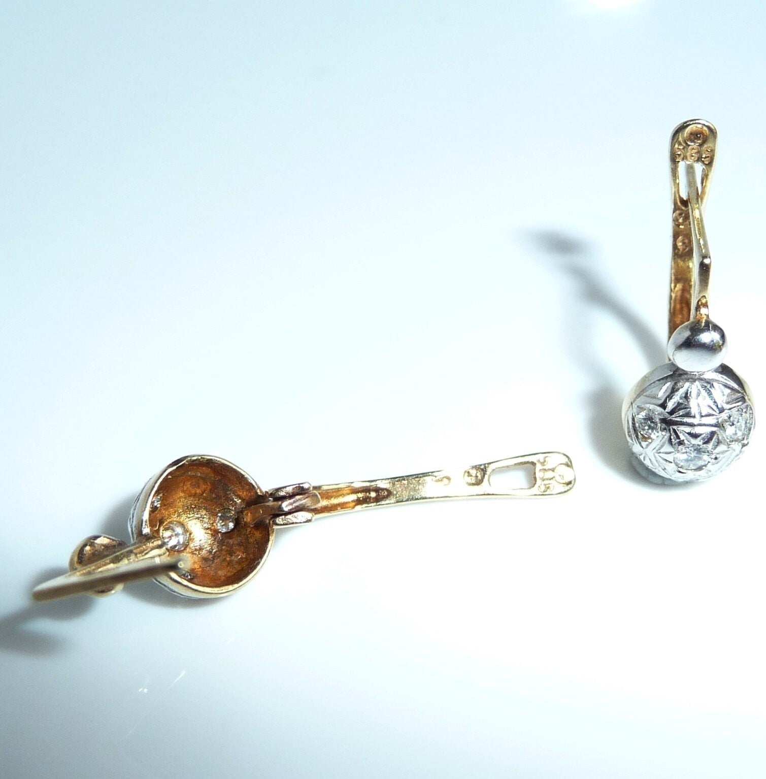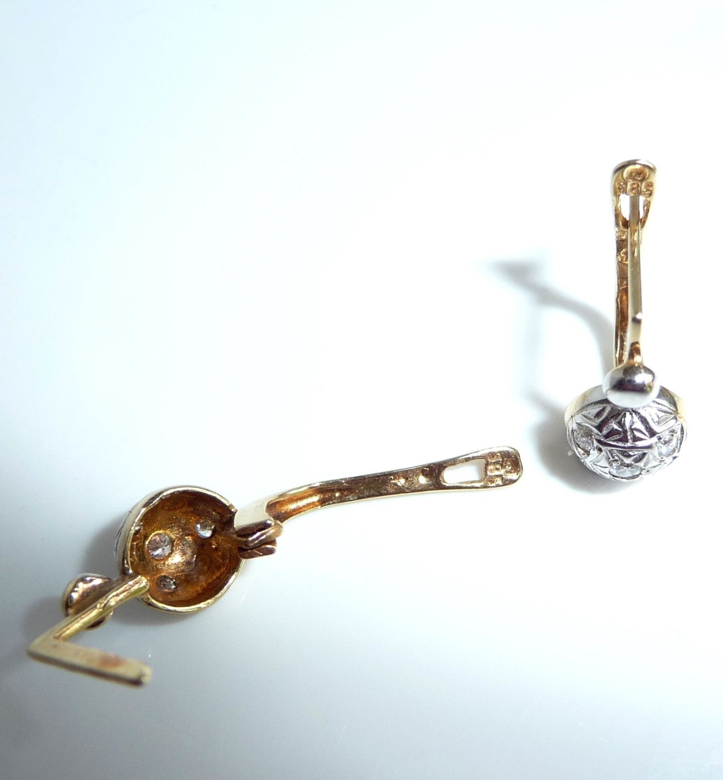 Ohrringe / Ohrhänger in 585 / 14 K Gelbgold mit einem Weißgold-Element auf der Vorderseite. Das Zier-Element ist eine Halb-Kugel in Weißgold, die jeweils mit 4 Diamanten im Brillantschliff besetzt ist. Zusammen haben die 8 Diamanten 0.20ct. (F/VS). Die Halbkugeln haben Verzierungen in Form von Kerben, die ein Muster bilden. Eine kleinere Kugel leitet über zu der Brisur.
