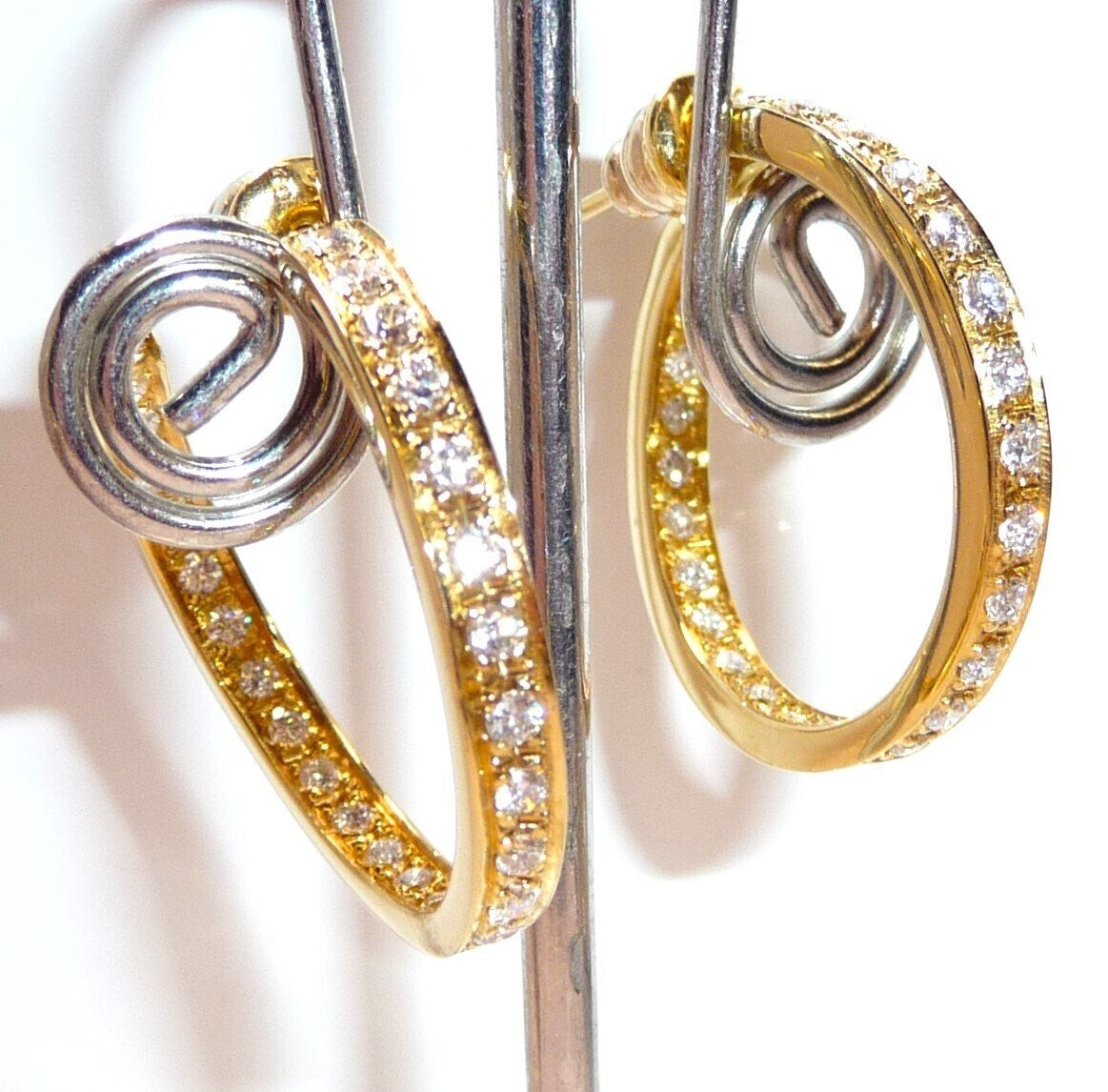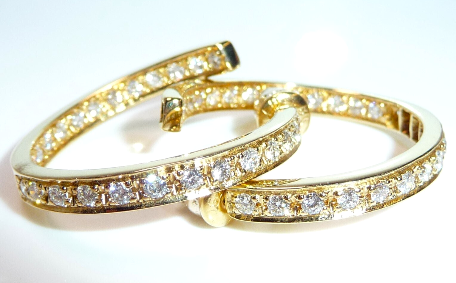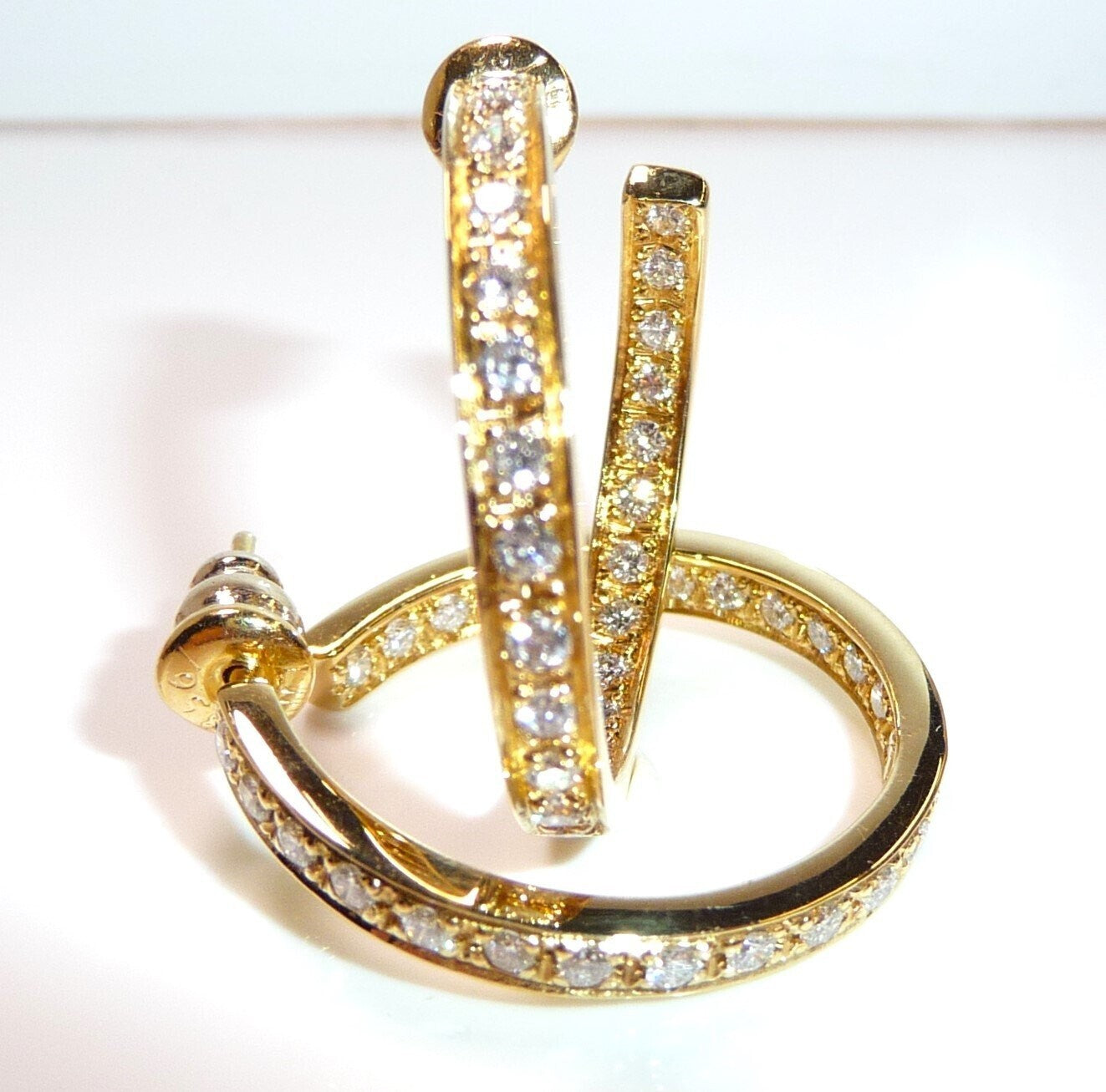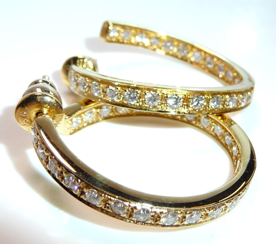 Ohrringe / große Creolen in 750/ 18 K Gelbgold. Die großen Creolen sind oben offen gearbeitet und in sich leicht spiralförmig versetzt. Der Grund für diese Form sind die vielen Diamanten, die dem Betrachter sowohl im Außenbereich als auch im Innen-Kreis entgegen funkeln. Pro Ohrringe sind 26 Diamanten im Brillantschliff eingefasst. Die insgesamt 52 Diamanten haben eine exzellente Qualität mit Farbe F und Reinheit VVS. Zusammen haben die Ohrringe 1.56 ct. mit 52 x 0.03 ct..