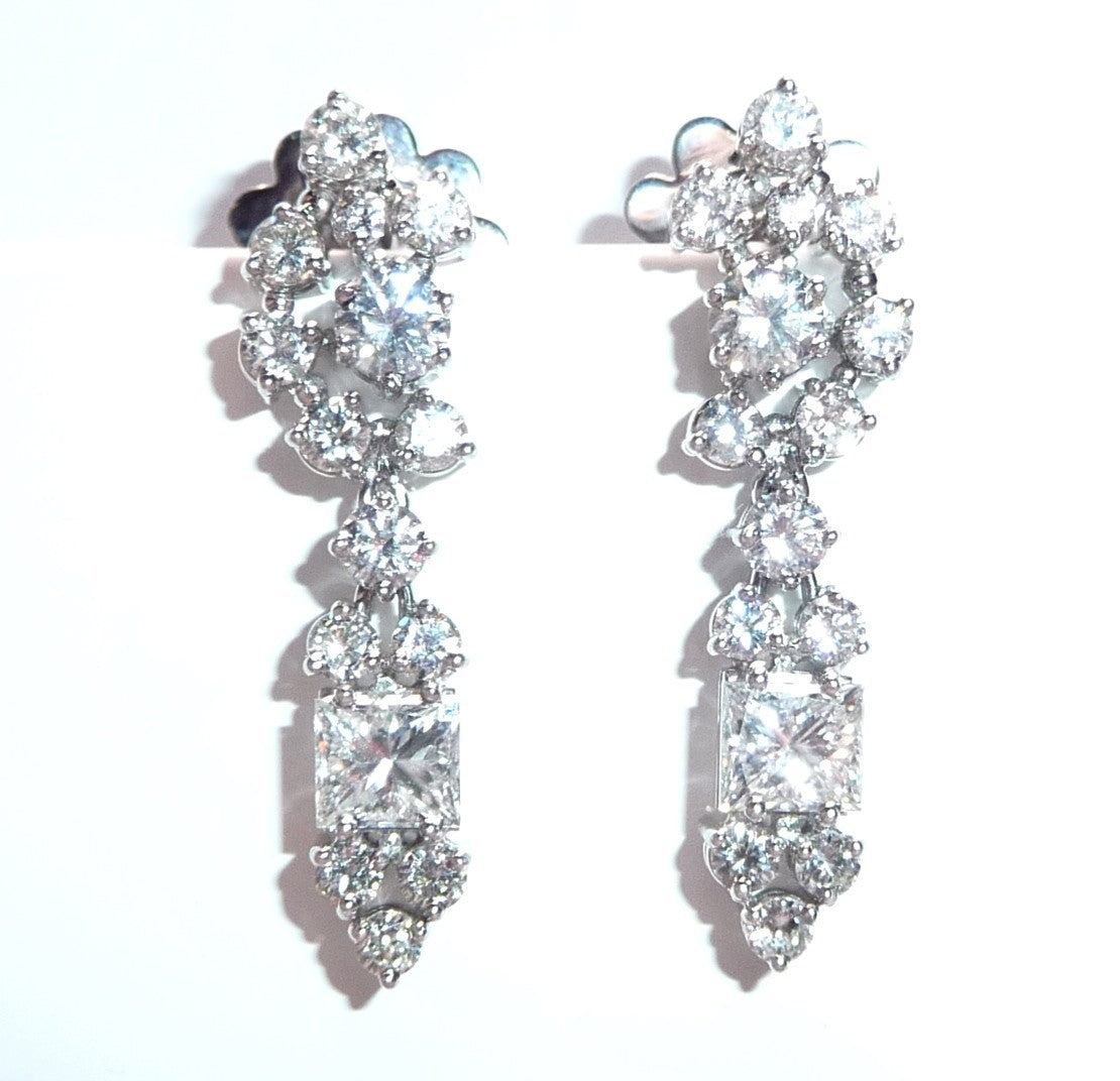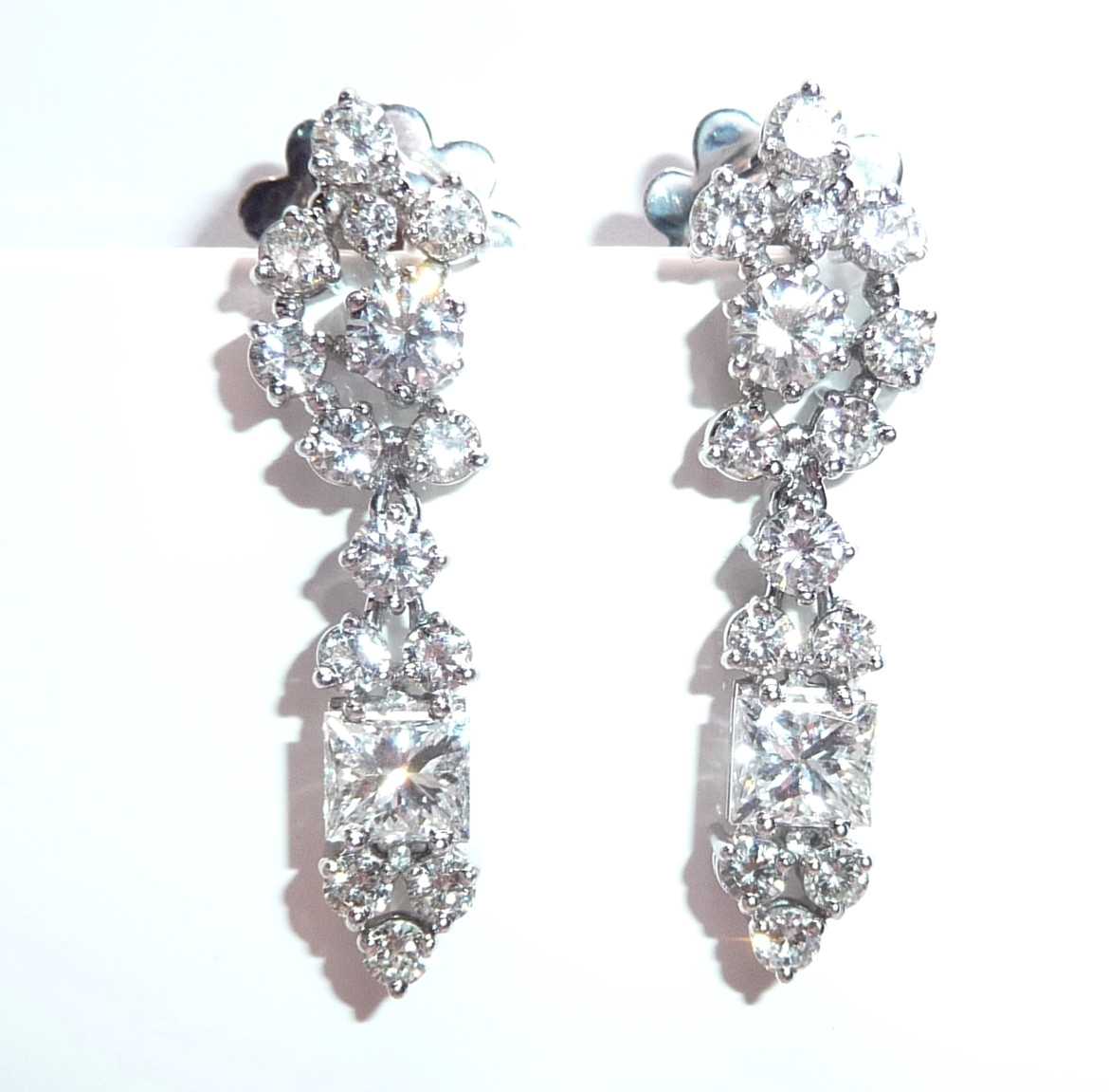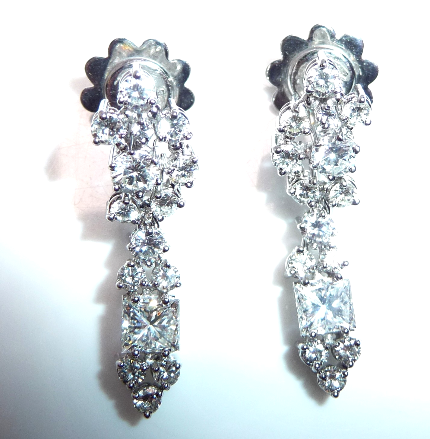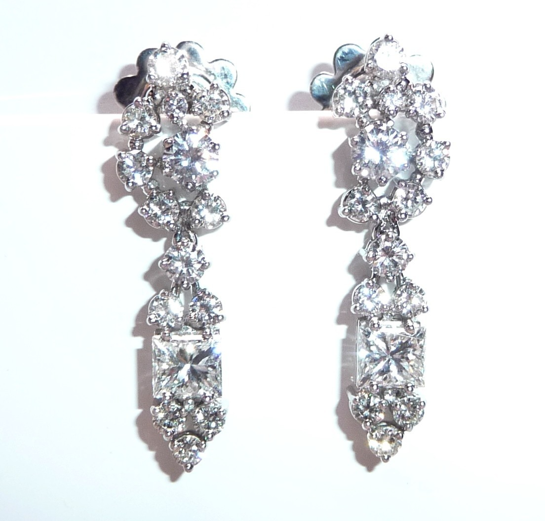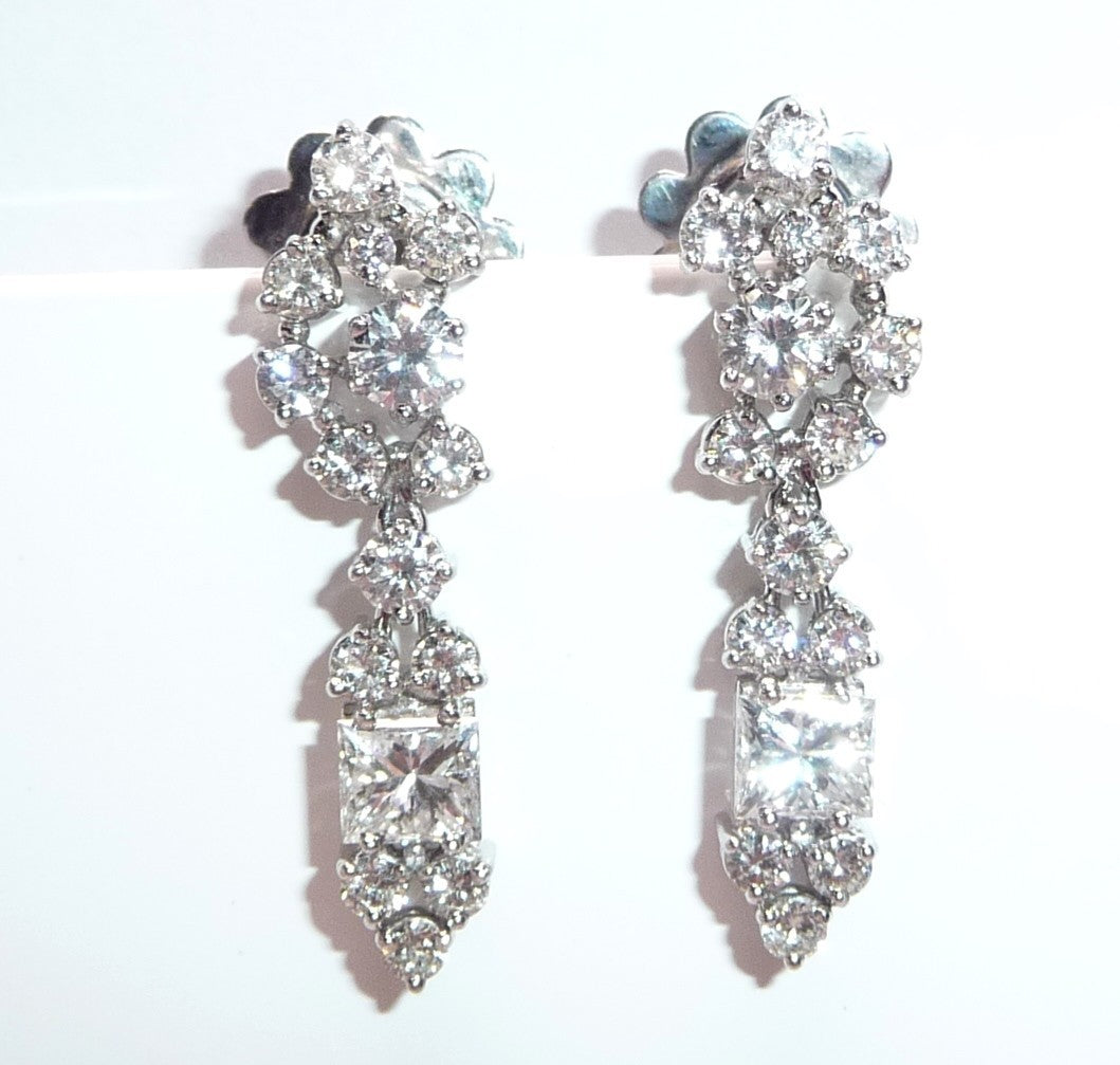 Ohrringe /Ohrhänger in 750/ 18 K Weißgold. Die Ohrringe haben zusammen ca. 2,54 ct. Diamanten. Zusammen sind es 30 Diamanten. Davon sind 28 Diamanten im Brillantschliff und 2 große Diamanten von jeweils 0.57 ct. im Princess-Schliff. Ein Feuerwerk an Brillanz.
