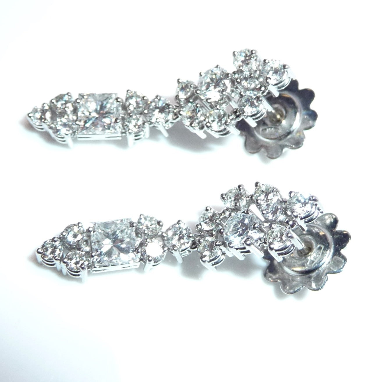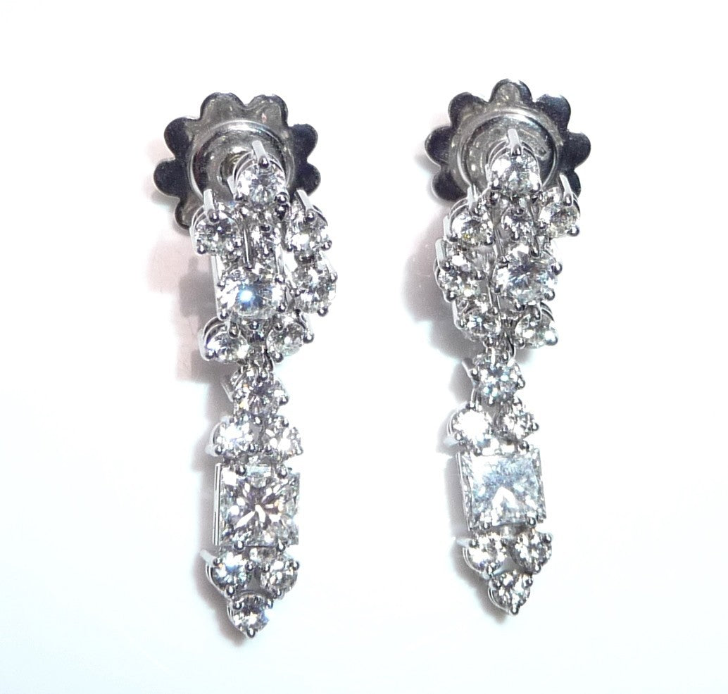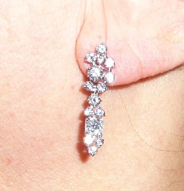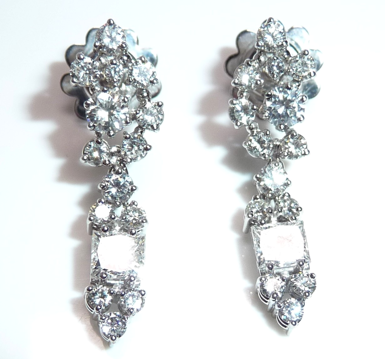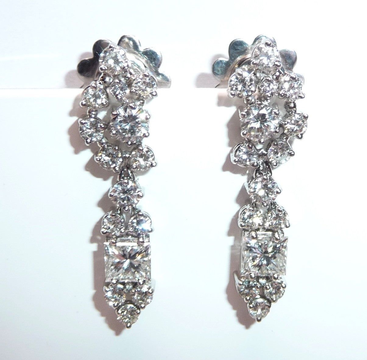 Ohrringe /Ohrhänger in 750/ 18 K Weißgold. Die Ohrringe haben zusammen ca. 2,54 ct. Diamanten. Zusammen sind es 30 Diamanten. Davon sind 28 Diamanten im Brillantschliff und 2 große Diamanten von jeweils 0.57 ct. im Princess-Schliff. Ein Feuerwerk an Brillanz.