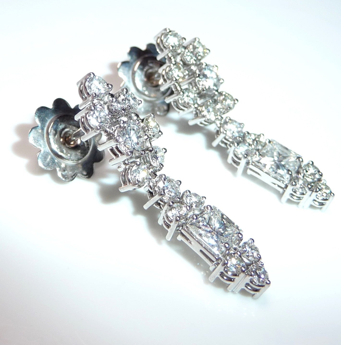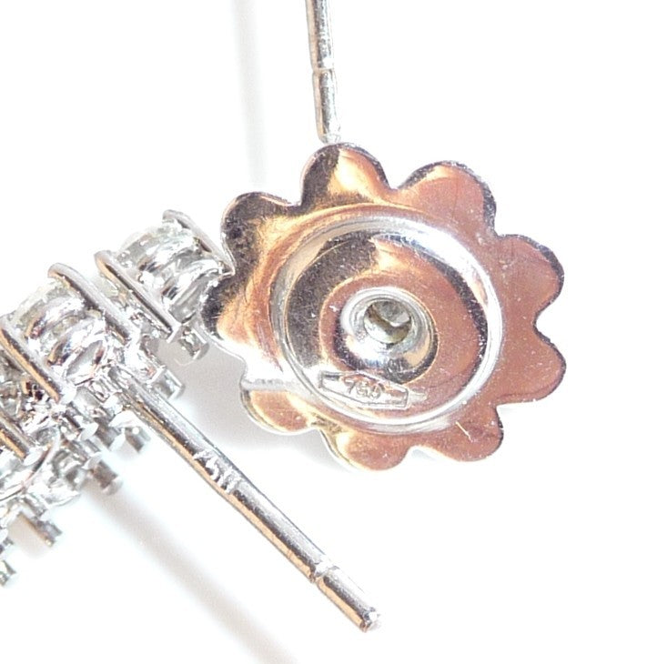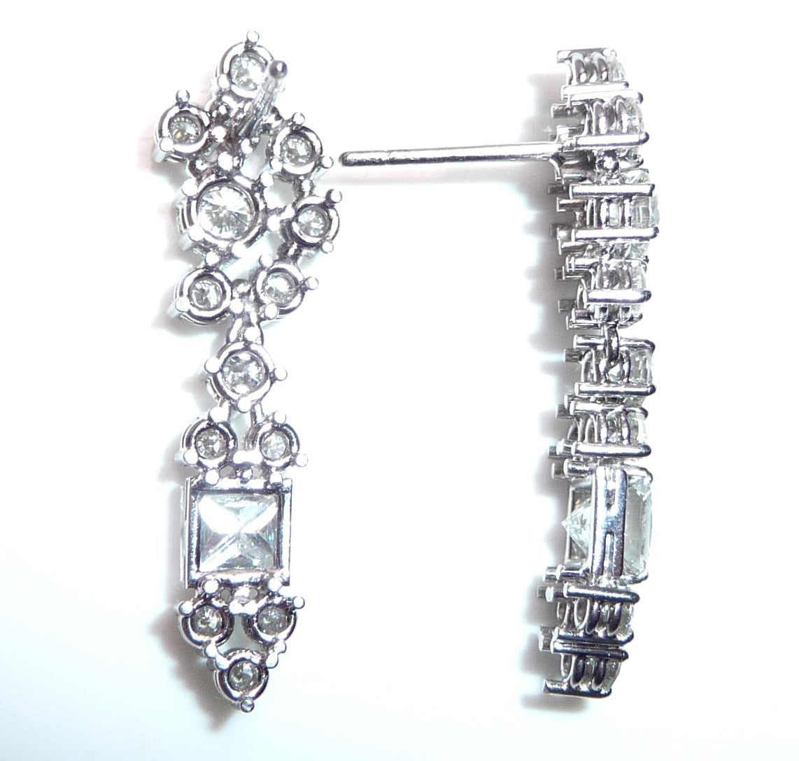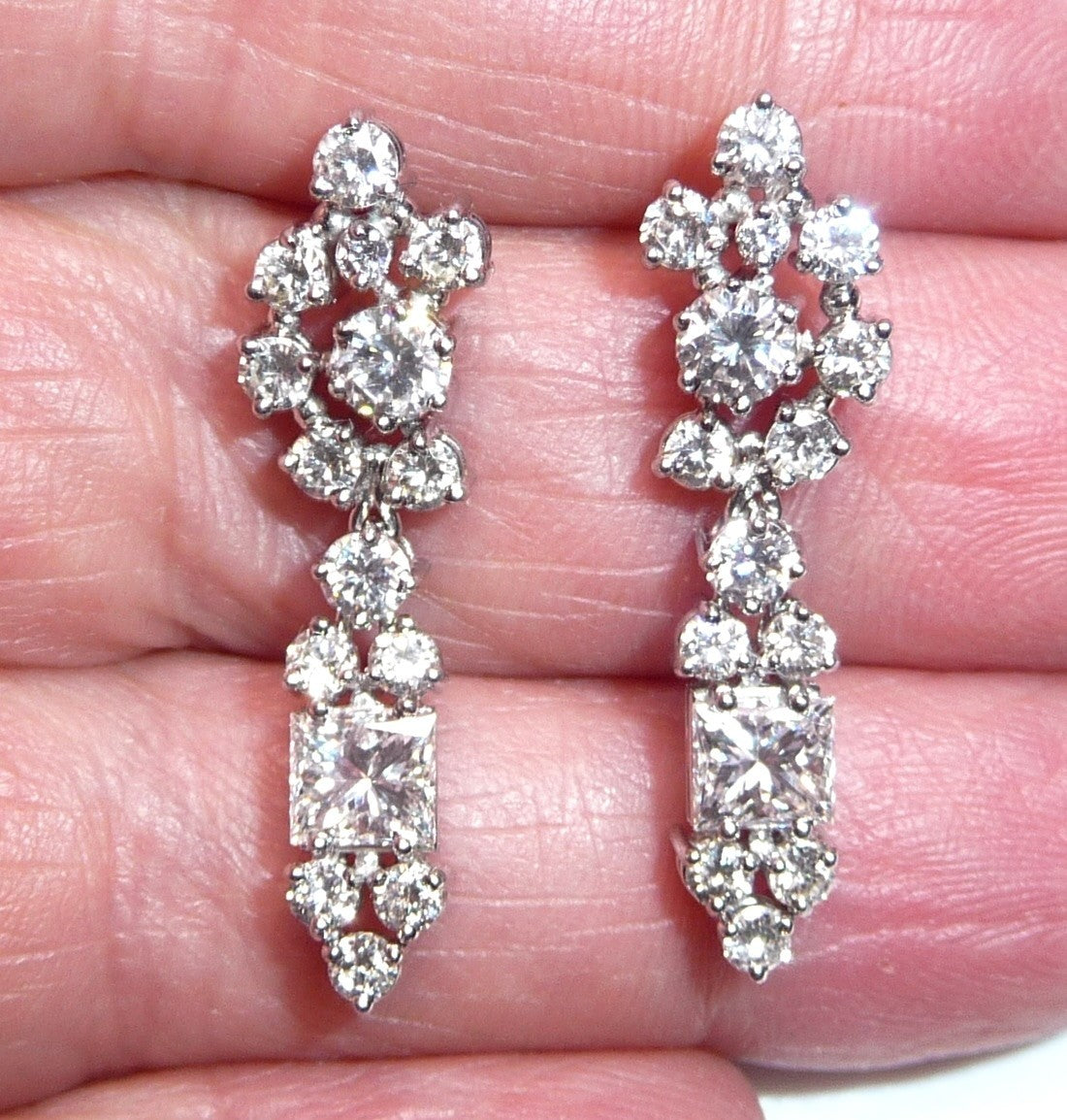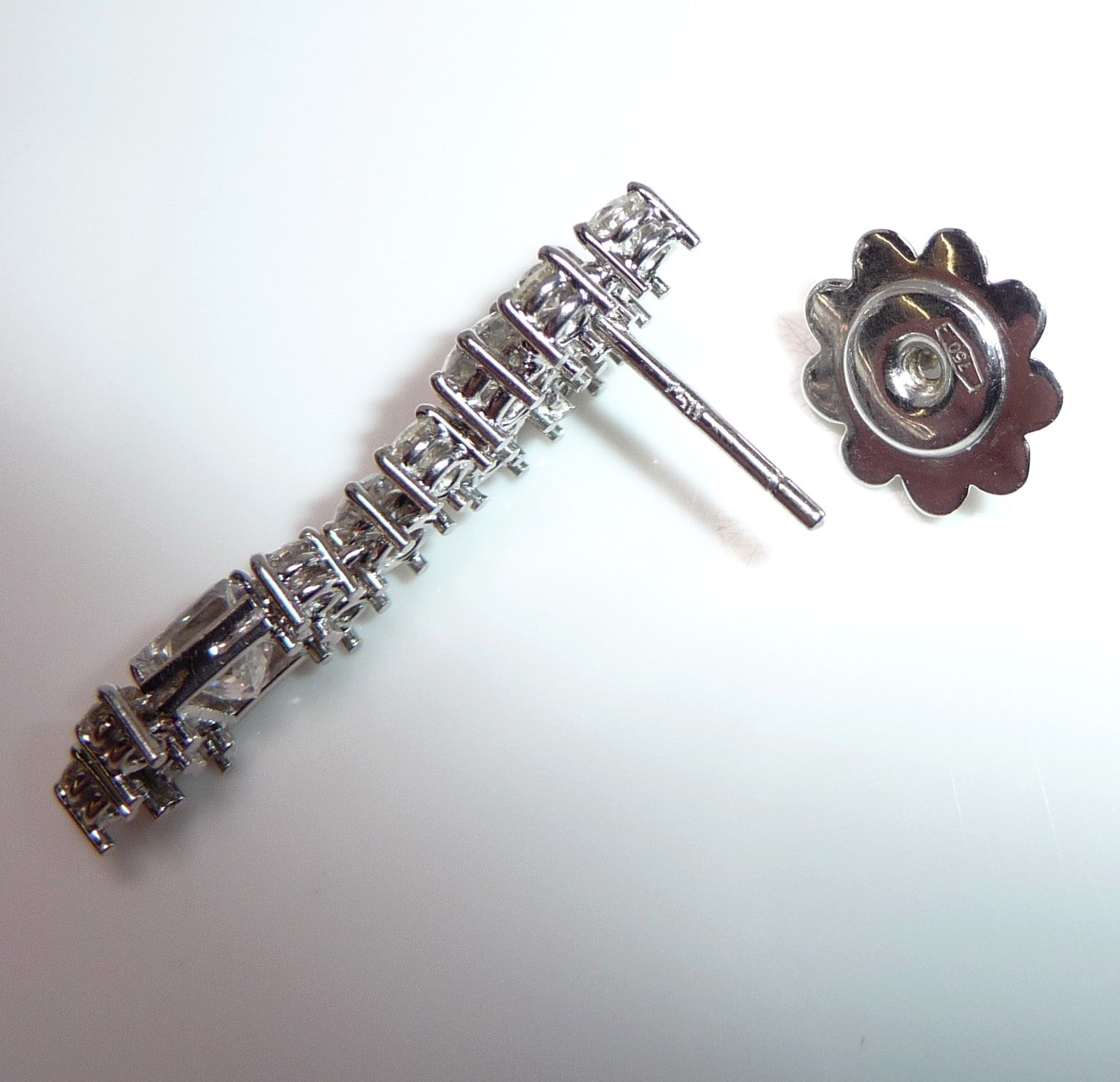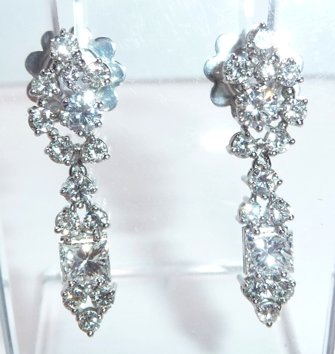 Ohrringe /Ohrhänger in 750/ 18 K Weißgold. Die Ohrringe haben zusammen ca. 2,54 ct. Diamanten. Zusammen sind es 30 Diamanten. Davon sind 28 Diamanten im Brillantschliff und 2 große Diamanten von jeweils 0.57 ct. im Princess-Schliff. Ein Feuerwerk an Brillanz.
