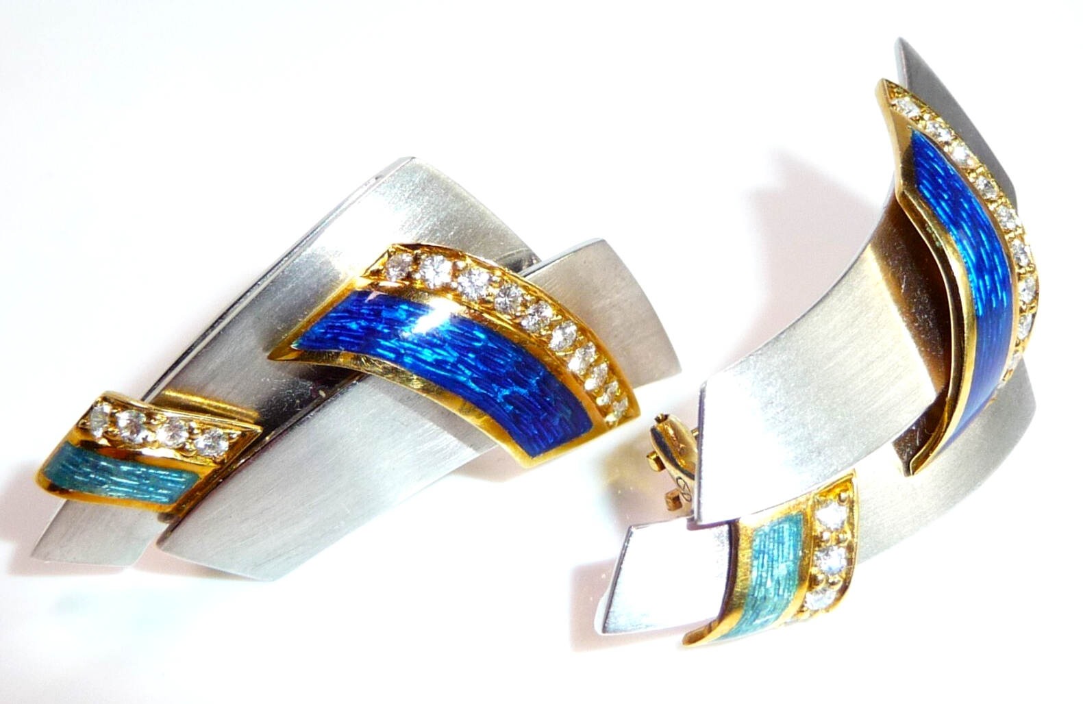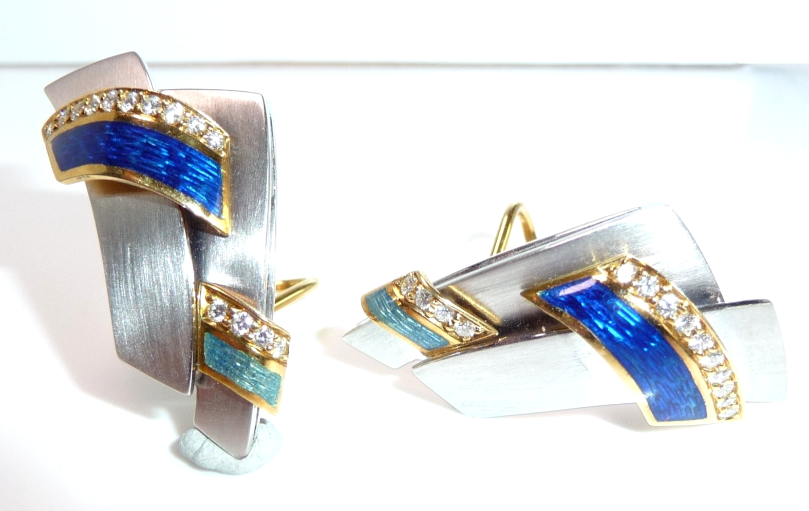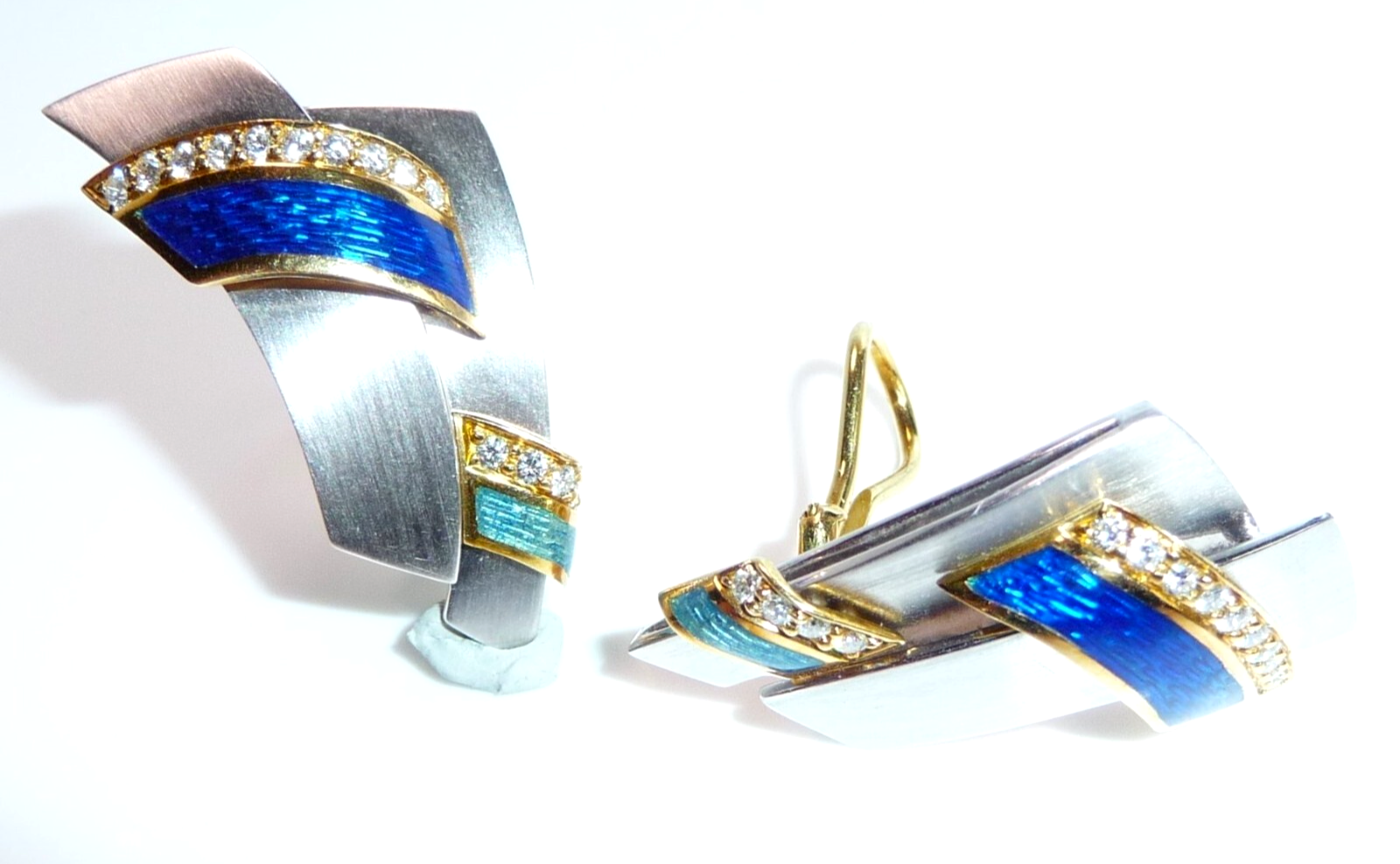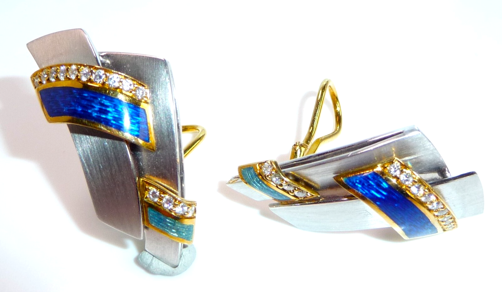 Ohrringe in 750/ 18 K Gold. Die Ohrringe sind Goldschmiede-Arbeiten von Hand mit einem sehr komplexen formalen Aufbau aus unterschiedlichen Elementen. Zwei flache, edle mattierten Weißgold-Bögen schwingen sich nach oben und verbreitern sich dabei. Quer über die beiden Weißgold-Bögen legen sich zwei Gelbgold-Elemente. Die beiden Elemente sind veredelt mit einer Guilloche-Emaille in noblem Königs-Blau und Türkis. Unter der transparenten Emaille schimmert der strukturierte Untergrund hindurch. Über der Emaille ist jeweils ein Diamant-Bogen von insgesamt 28 Diamanten im Brillantschliff. Die Diamanten haben zusammen 0.56 ct. mit Farbe F-G und Reinheit VVS-VS. Die Quer-Elemente sind sorgsam verschraubt mit den Weißgold-Bögen Hervorragende Goldschmiede-Kunst in höchster Perfektion.