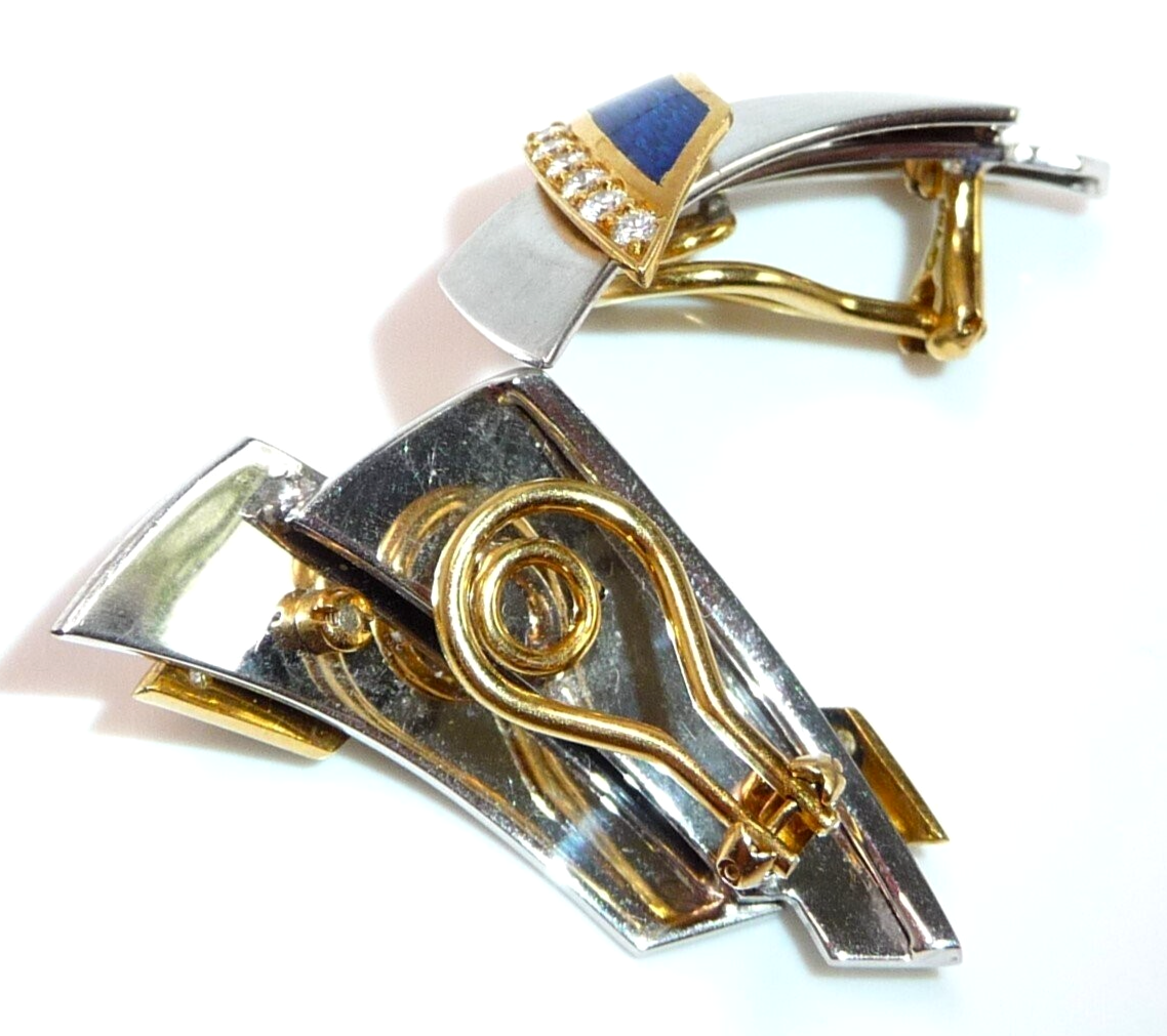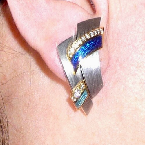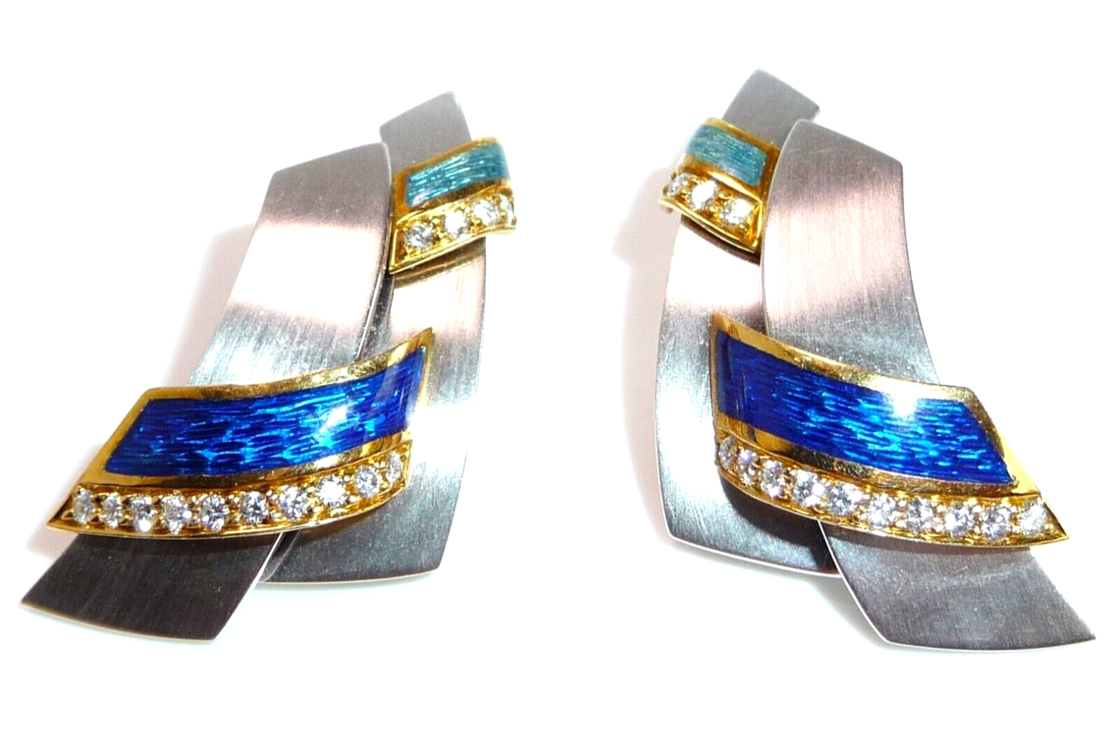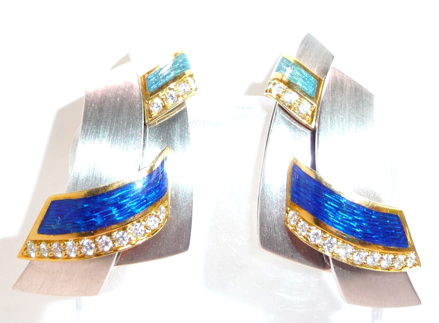 Ohrringe in 750/ 18 K Gold. Die Ohrringe sind Goldschmiede-Arbeiten von Hand mit einem sehr komplexen formalen Aufbau aus unterschiedlichen Elementen. Zwei flache, edle mattierten Weißgold-Bögen schwingen sich nach oben und verbreitern sich dabei. Quer über die beiden Weißgold-Bögen legen sich zwei Gelbgold-Elemente. Die beiden Elemente sind veredelt mit einer Guilloche-Emaille in noblem Königs-Blau und Türkis. Unter der transparenten Emaille schimmert der strukturierte Untergrund hindurch. Über der Emaille ist jeweils ein Diamant-Bogen von insgesamt 28 Diamanten im Brillantschliff. Die Diamanten haben zusammen 0.56 ct. mit Farbe F-G und Reinheit VVS-VS. Die Quer-Elemente sind sorgsam verschraubt mit den Weißgold-Bögen Hervorragende Goldschmiede-Kunst in höchster Perfektion.