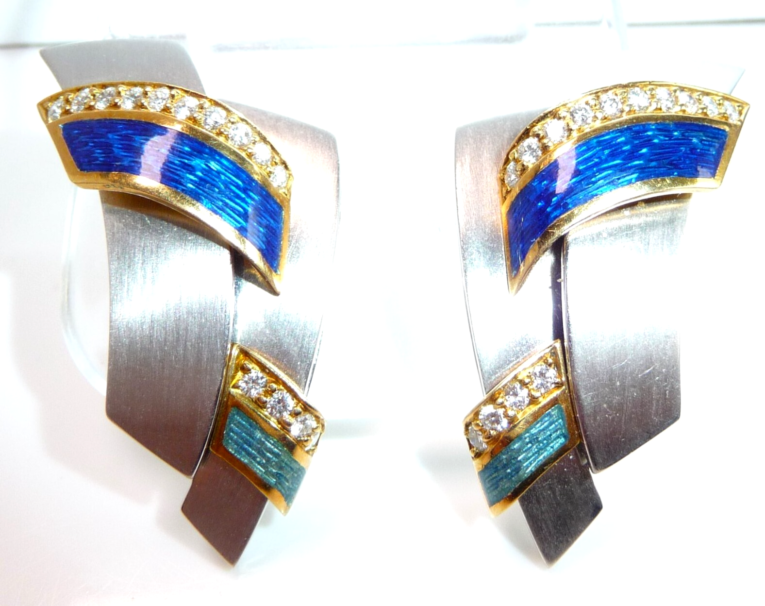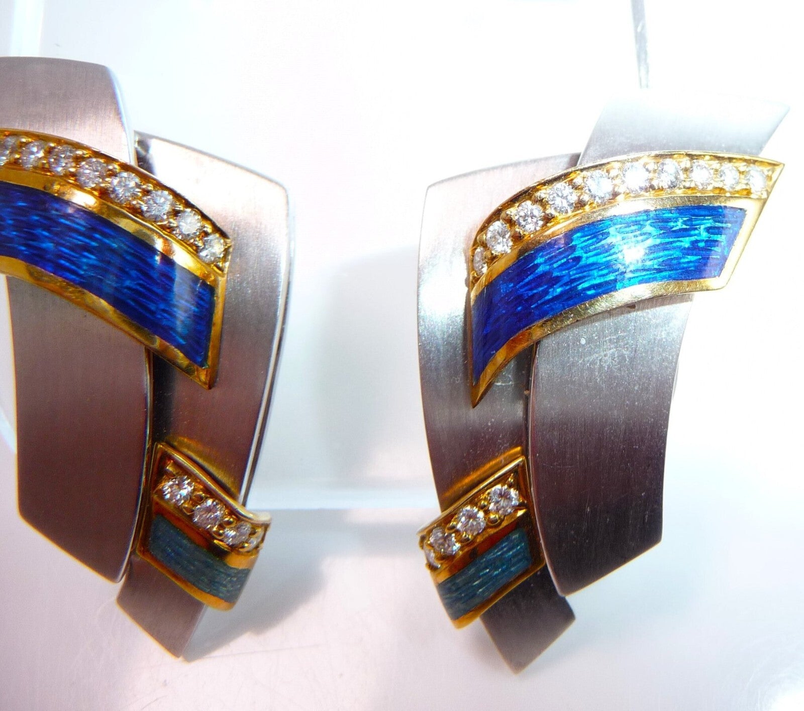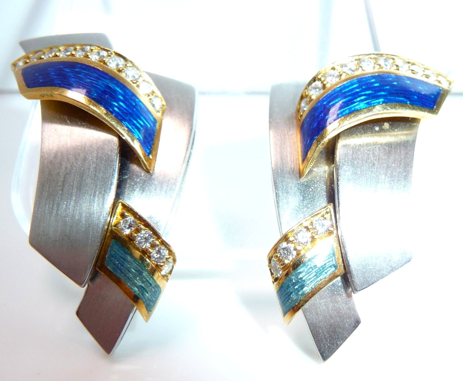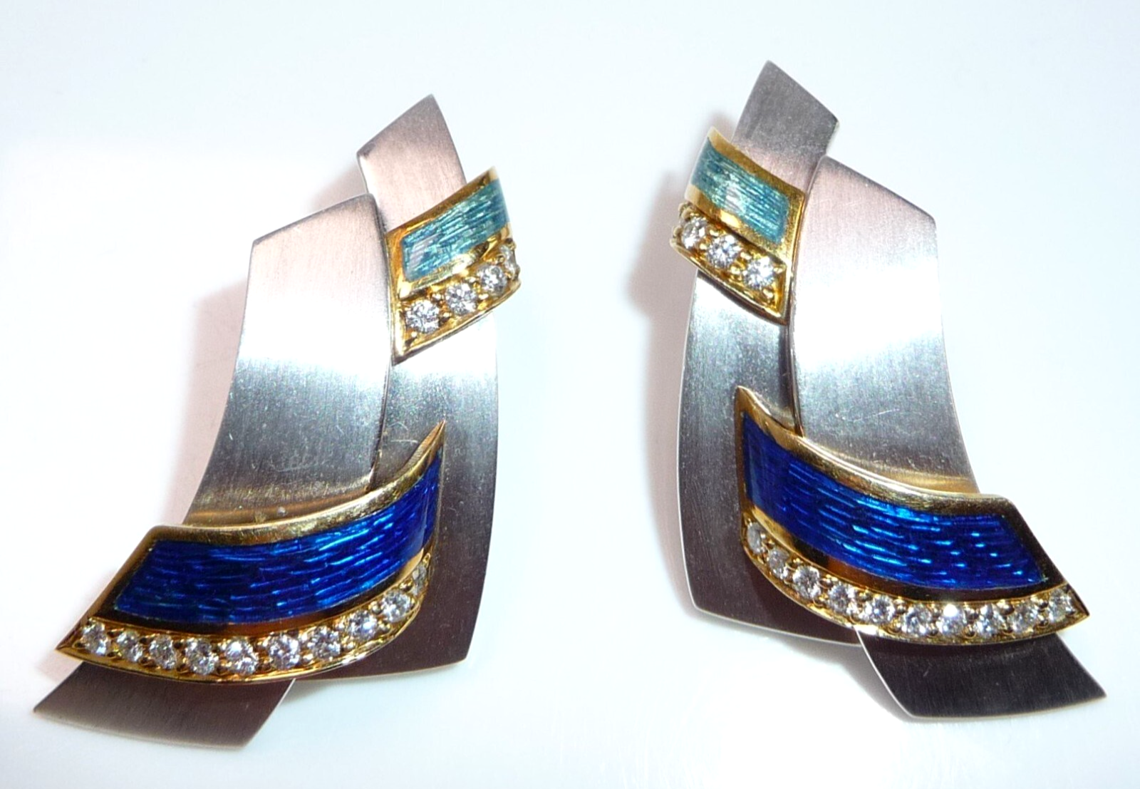 Ohrringe 750 Gold Guilloche-Emaille 0.56ct. Diamanten 34,2 mm 19,2 g Unikate