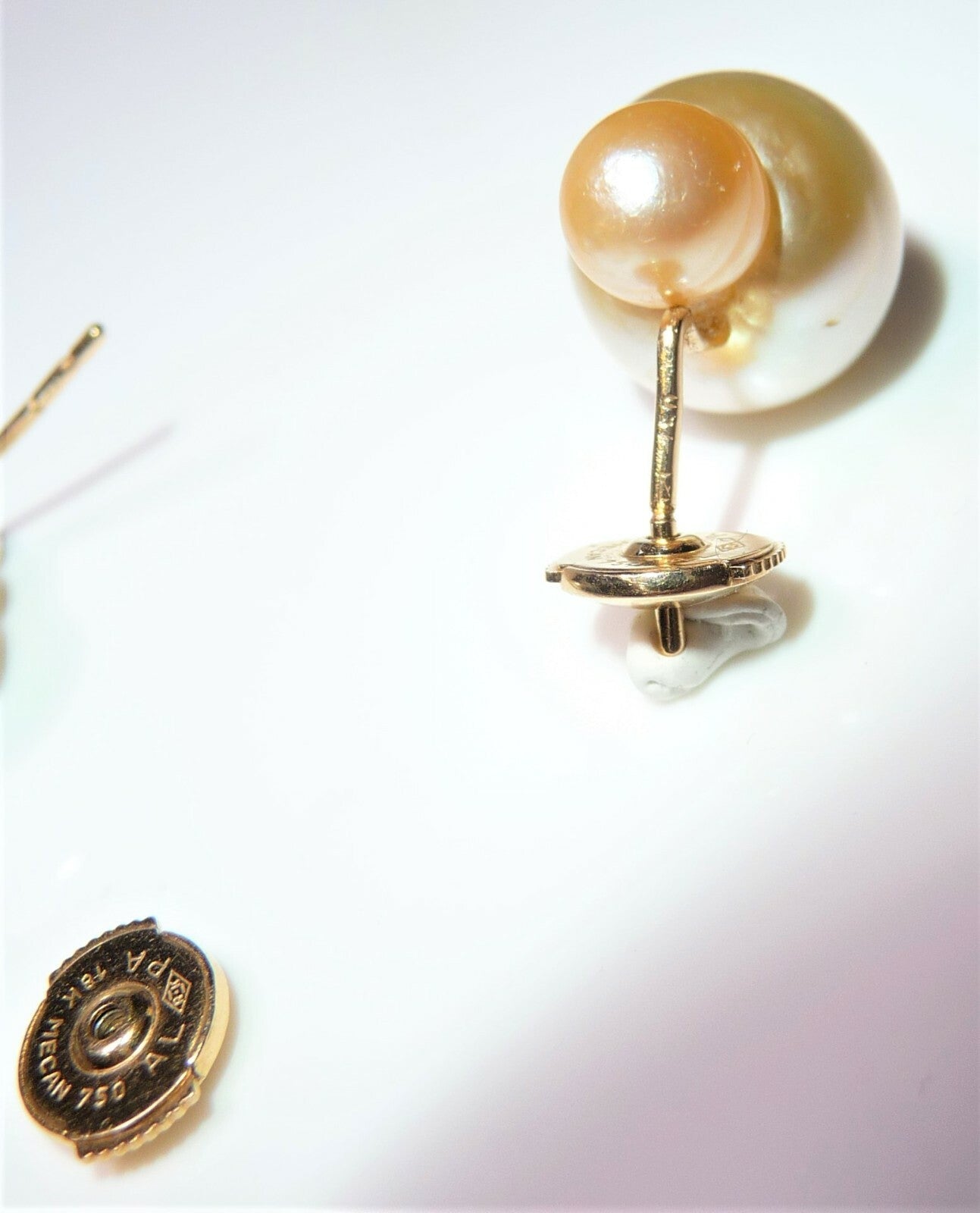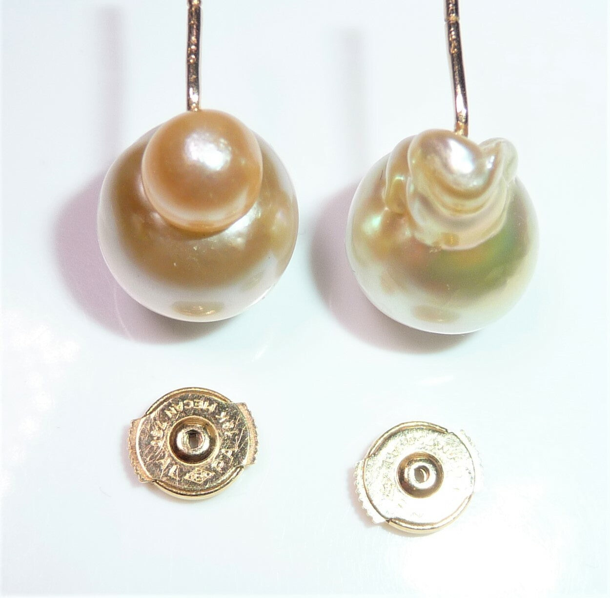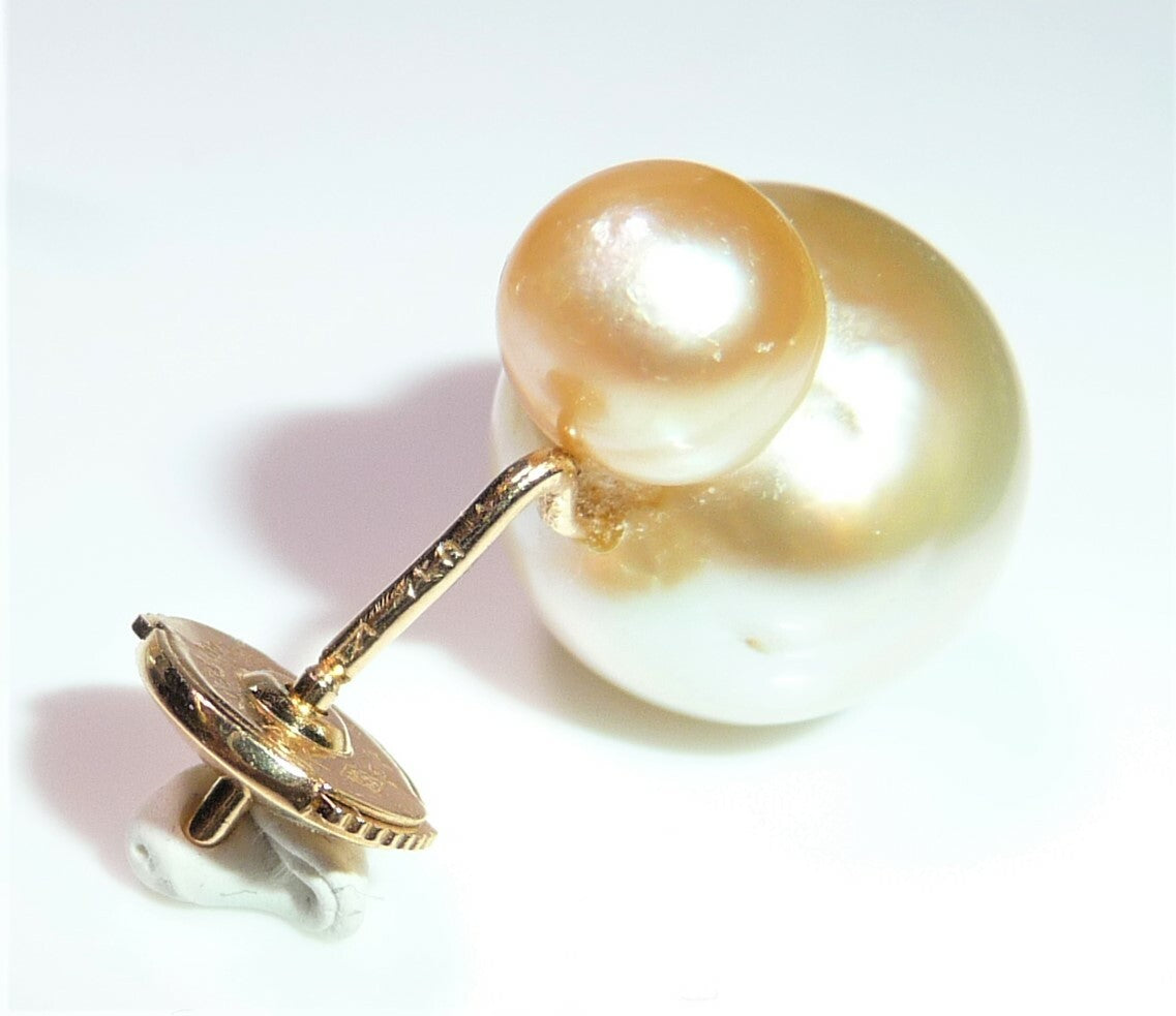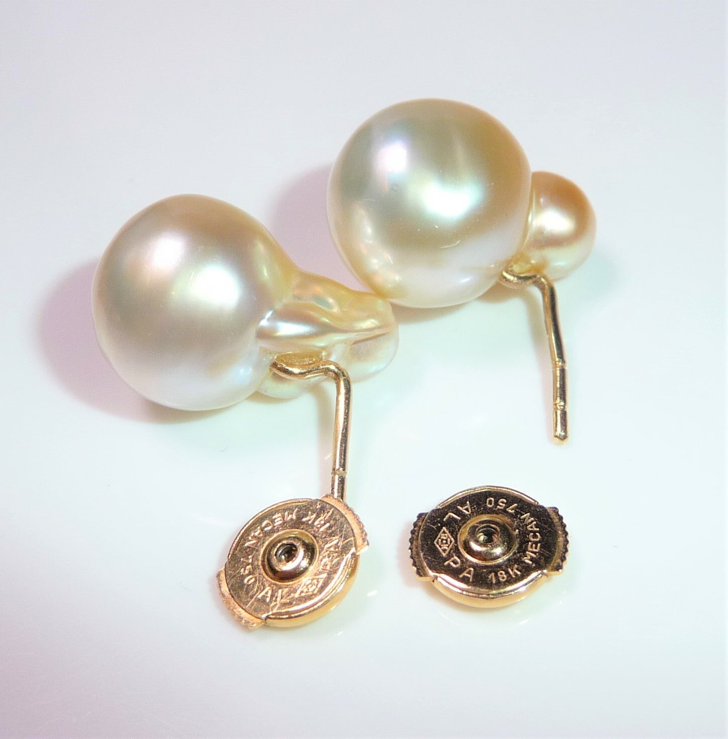 Ohrringe in 18 K / 750 Gelbgold. Die Ohrringe bestehen aus doppelt gewachsenen, kultivierten Südsee-Perlen. Hinter der kleineren oberen Perle wurde der 18 karätige Gold-Stift angebracht. Die dickere Südsee-Perle ist also unten am Ohr. Hochwertige Patent-Stopper bilden den Sicherheits-Verschluss.