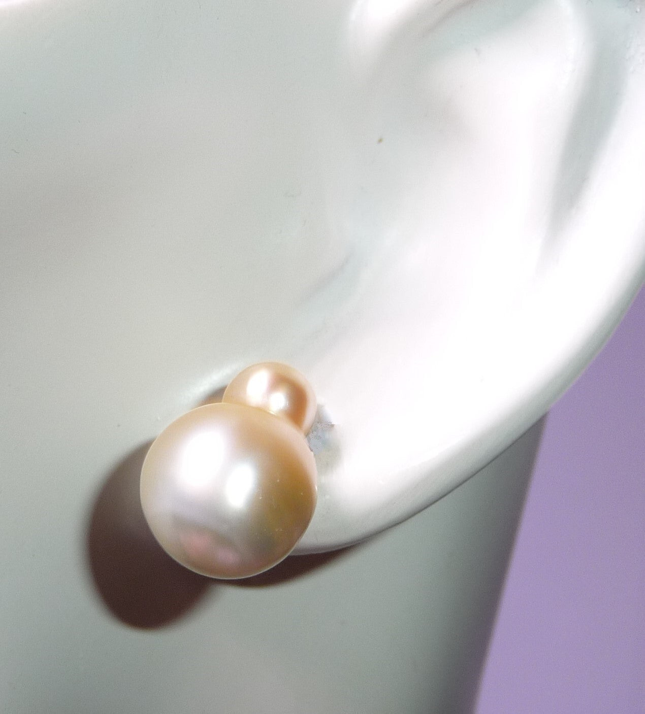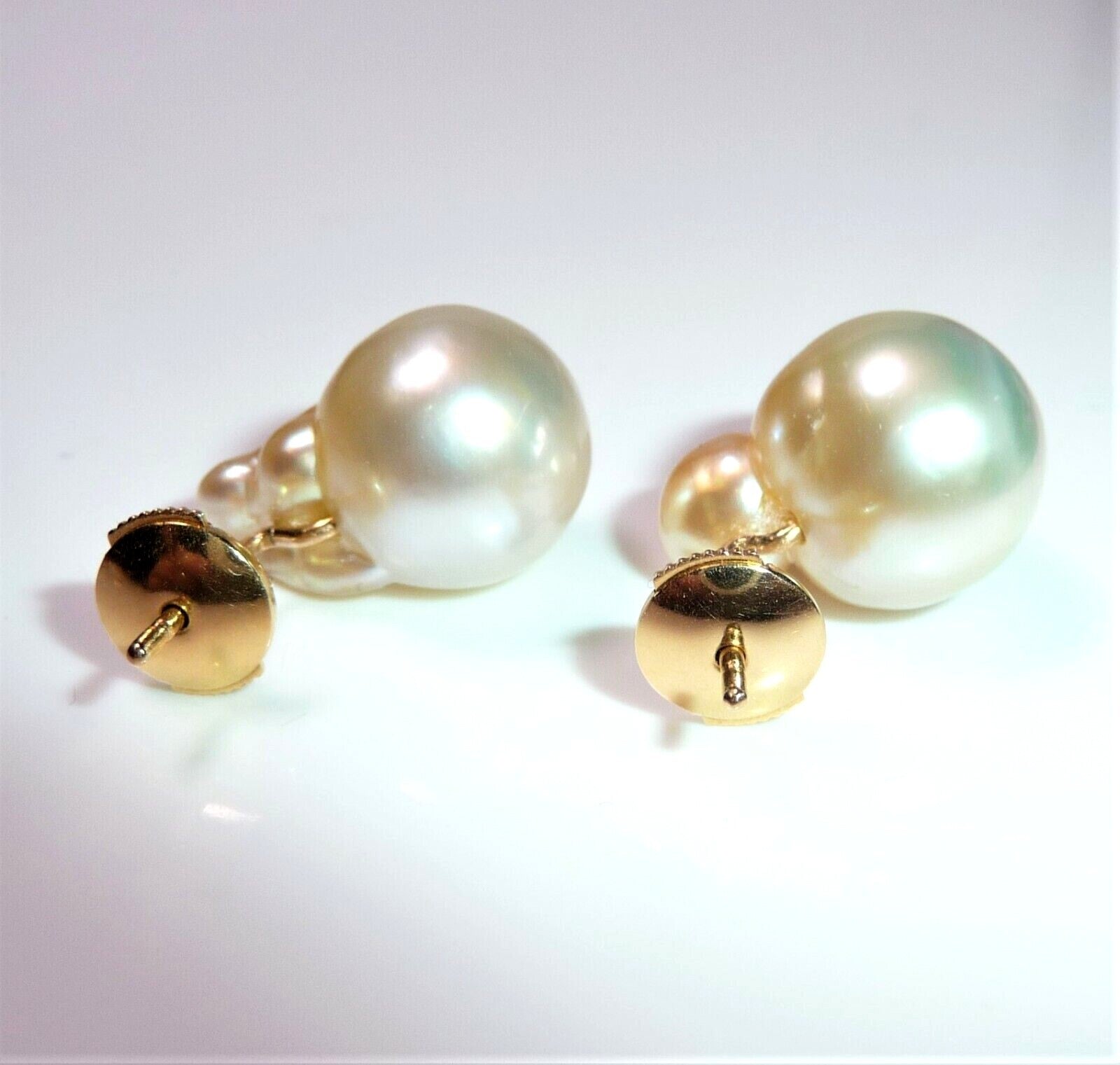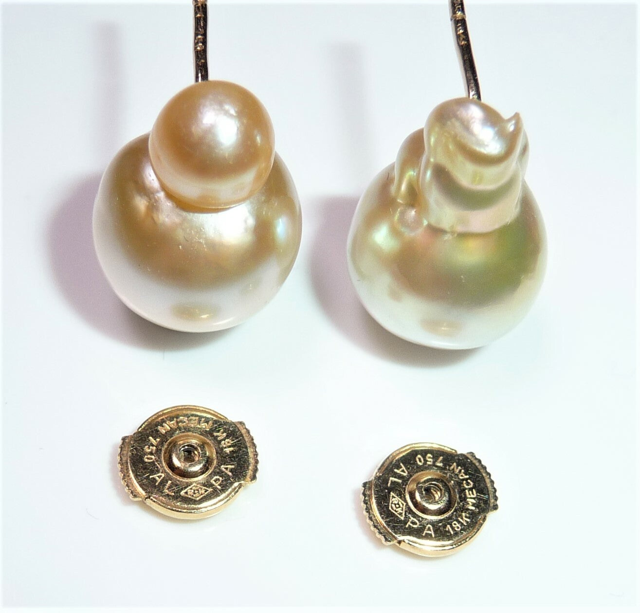 Ohrringe in 18 K / 750 Gelbgold. Die Ohrringe bestehen aus doppelt gewachsenen, kultivierten Südsee-Perlen. Hinter der kleineren oberen Perle wurde der 18 karätige Gold-Stift angebracht. Die dickere Südsee-Perle ist also unten am Ohr. Hochwertige Patent-Stopper bilden den Sicherheits-Verschluss.