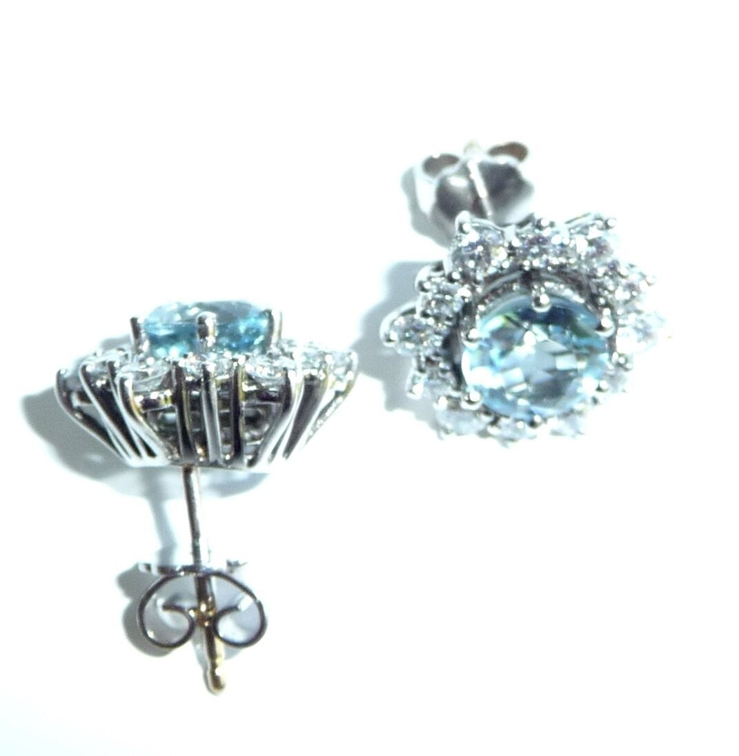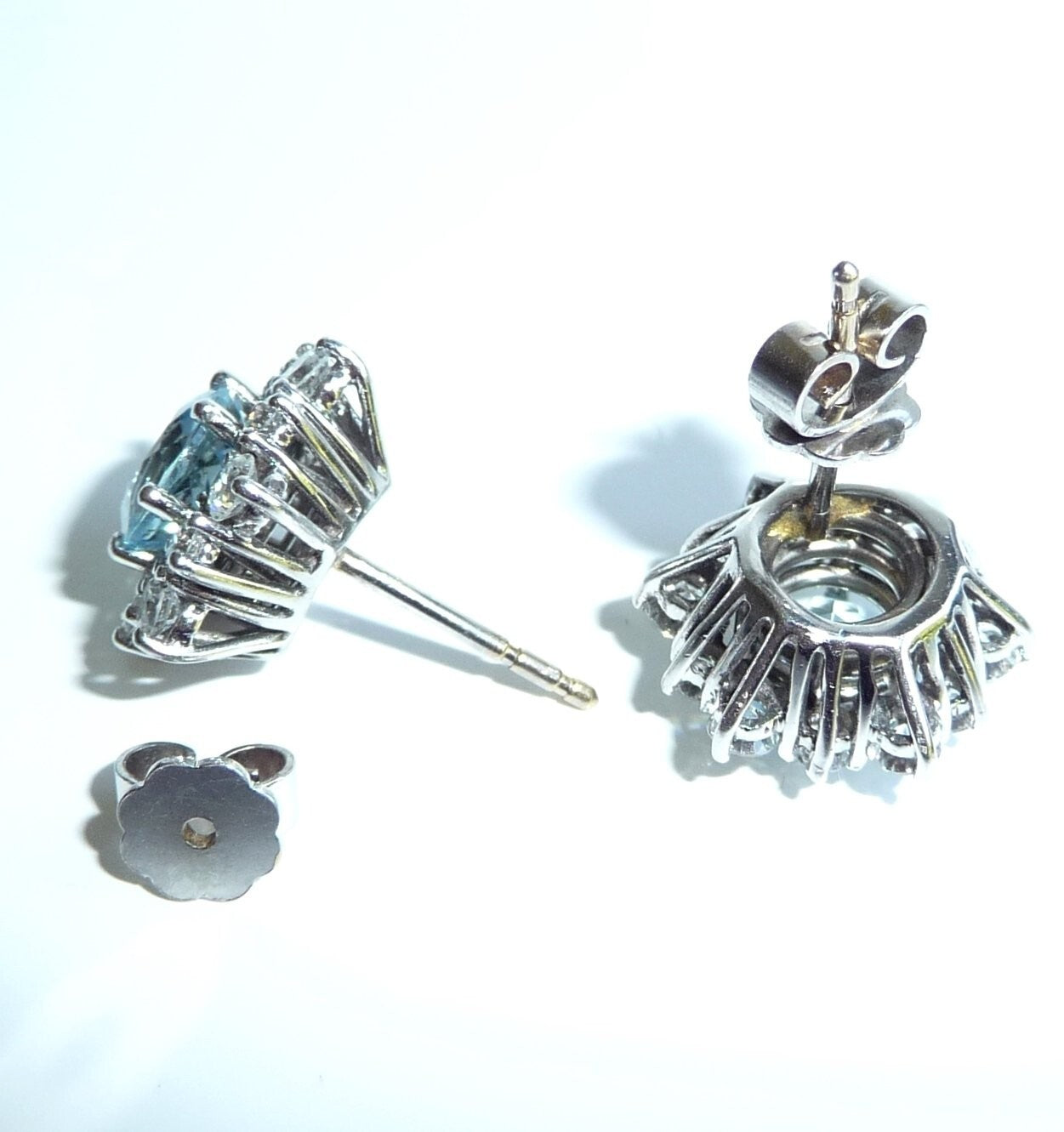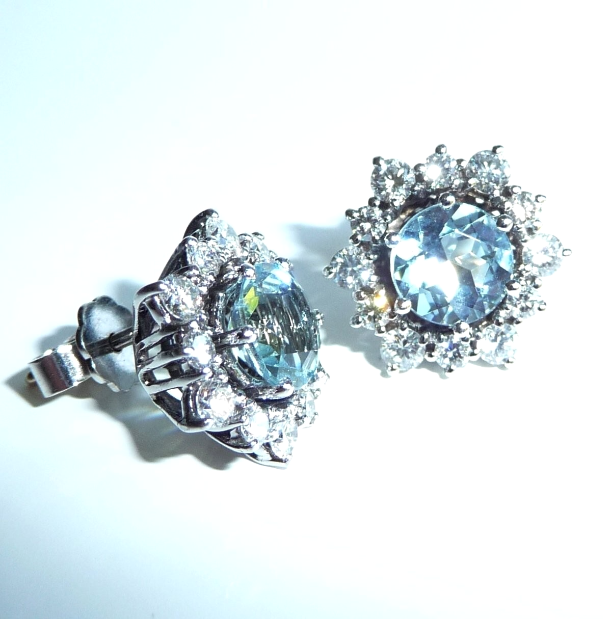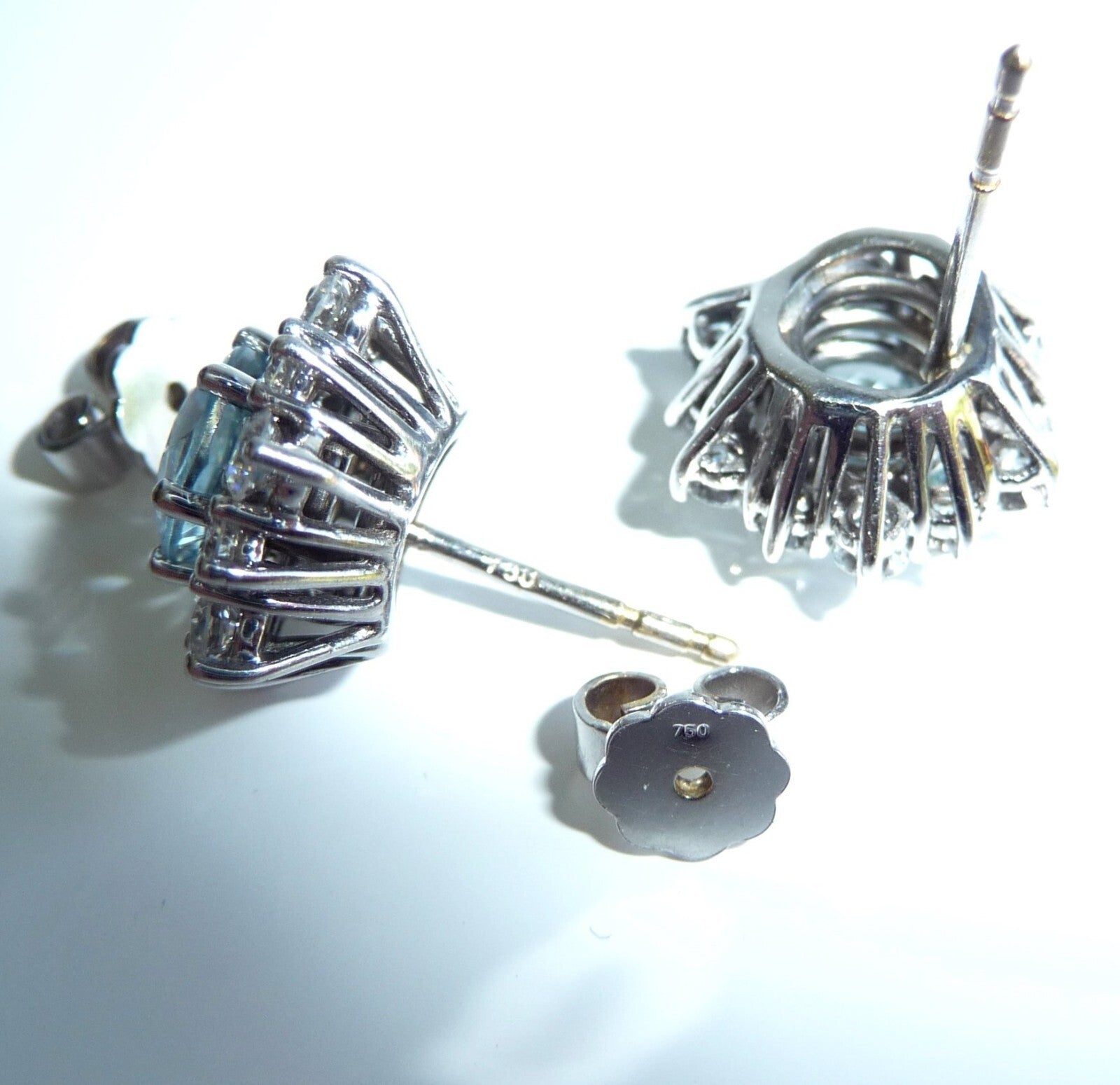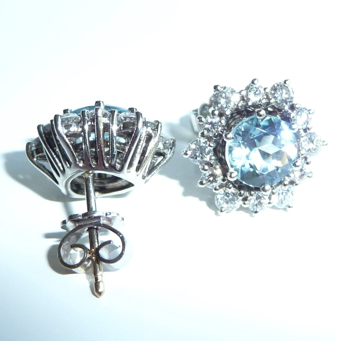 Ohrringe in 18 K / 750 Weißgold. Die sind wie eine Blüte gestaltet. Im Zentrum ist ein kreisrunder Aquamarin von jeweils 1.00 ct. mit einem Durchmesser von 7,1 mm und einer Tiefe von 4,2 mm. Die beiden augenreinen Aquamarine werden um rundet von insgesamt 24 Diamanten im Brillantschliff von total ca. 1.20 ct. mit Farbe H-G und Reinheit VS. Jeweils ein größerer Diamant von 2,7 mm ist im Wechsel mit einem Diamant von 2,2 mm im Kreis arrangiert.