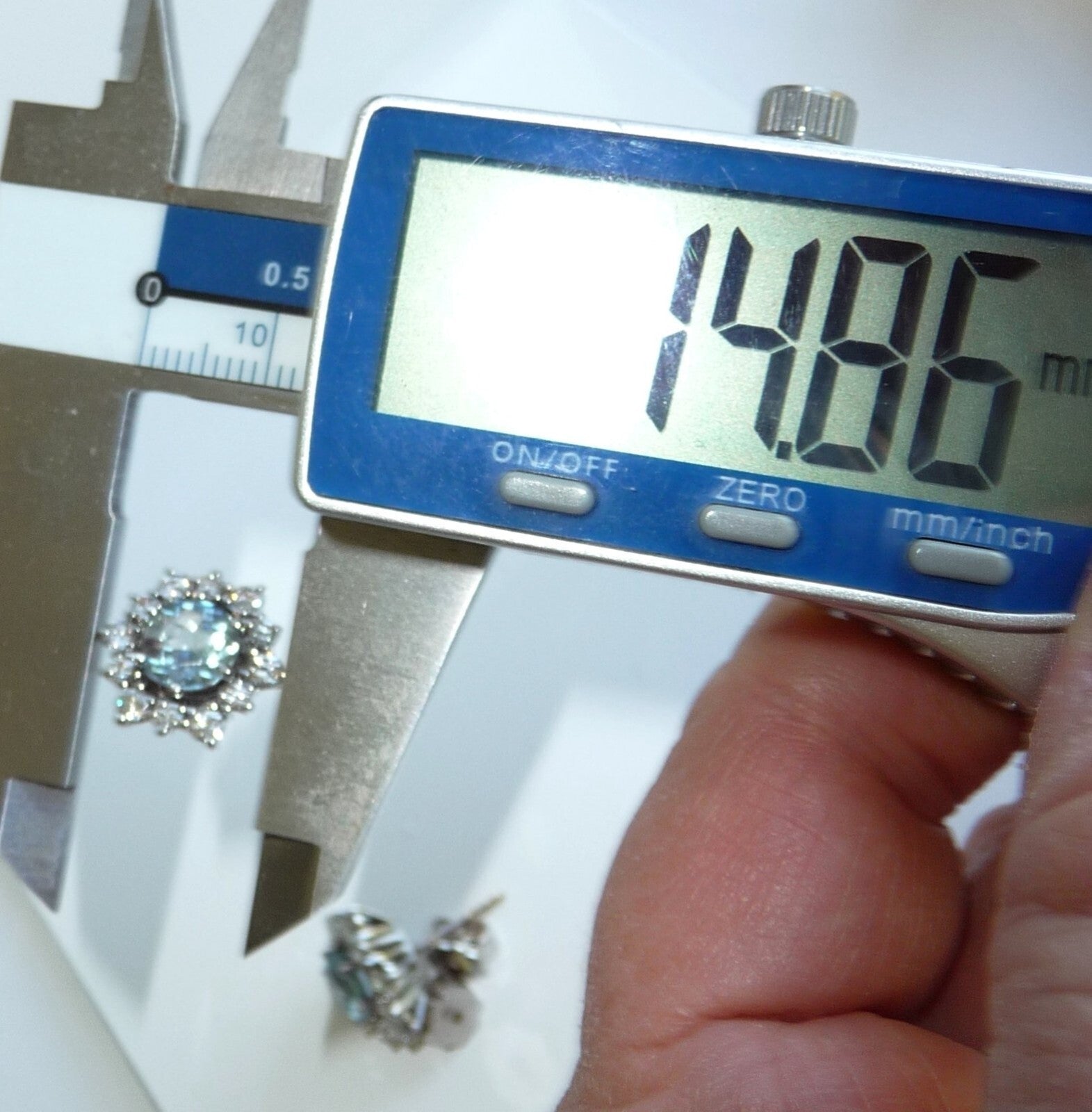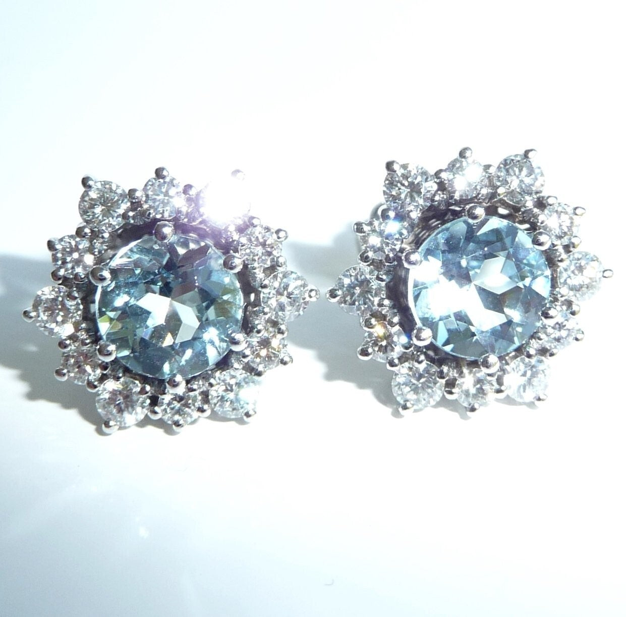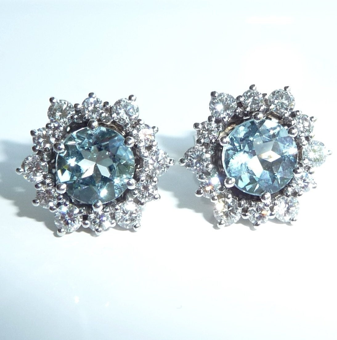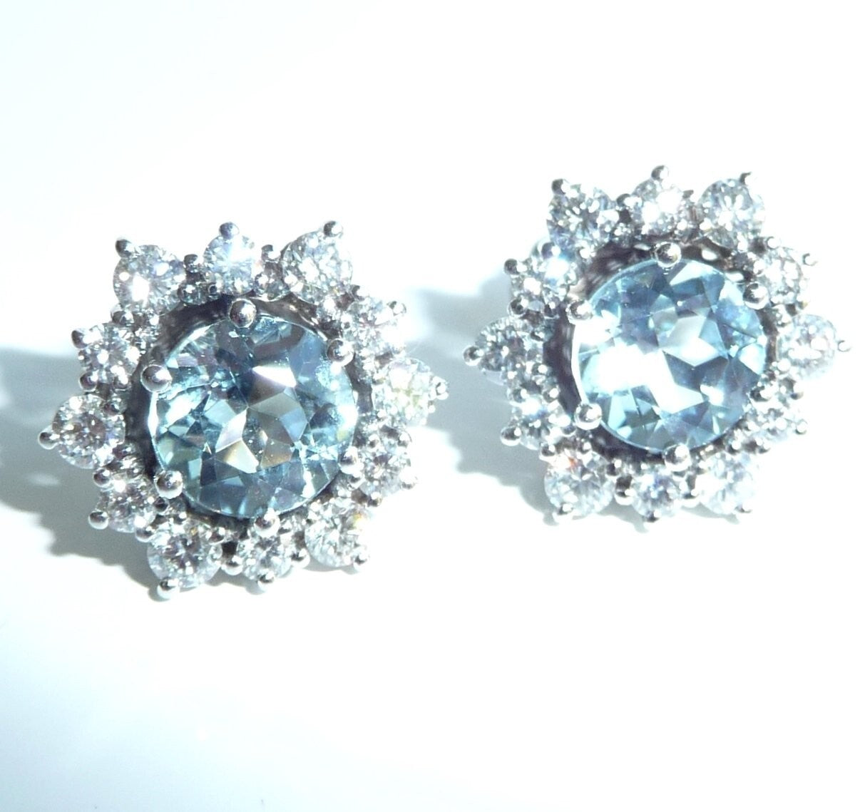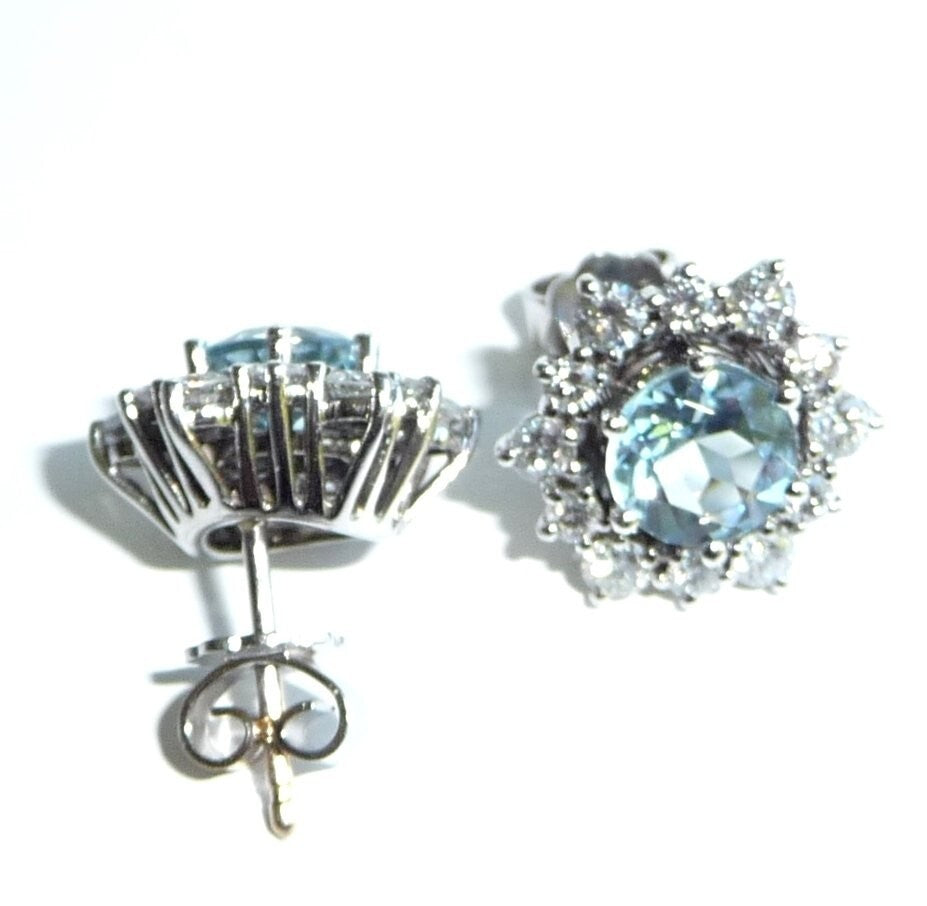Ohrringe in 18 K / 750 Weißgold. Die sind wie eine Blüte gestaltet. Im Zentrum ist ein kreisrunder Aquamarin von jeweils 1.00 ct. mit einem Durchmesser von 7,1 mm und einer Tiefe von 4,2 mm. Die beiden augenreinen Aquamarine werden um rundet von insgesamt 24 Diamanten im Brillantschliff von total ca. 1.20 ct. mit Farbe H-G und Reinheit VS. Jeweils ein größerer Diamant von 2,7 mm ist im Wechsel mit einem Diamant von 2,2 mm im Kreis arrangiert.