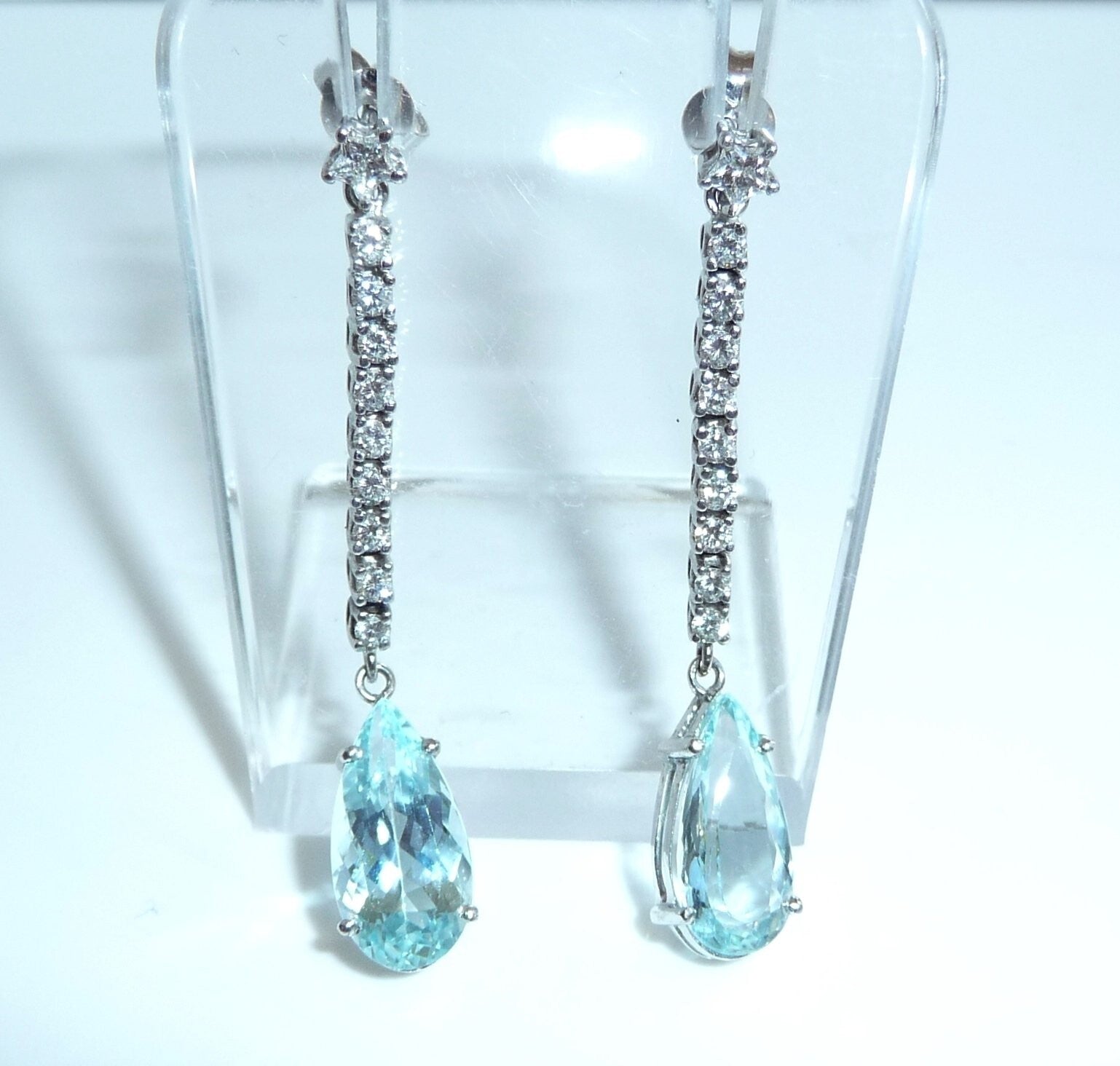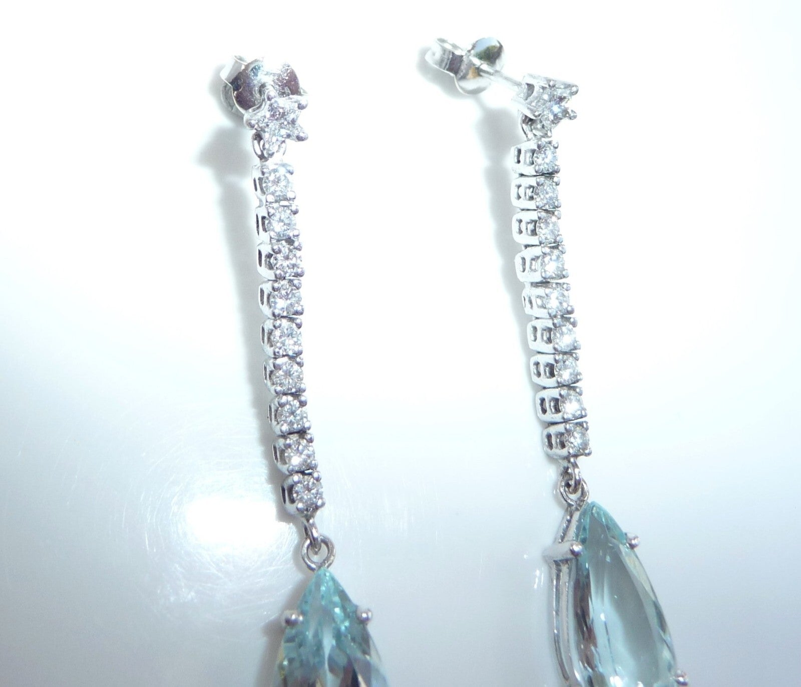 Ganz unten ist jeweils ein Aquamarin im Tropfen-Schliff /Pear Cut eingefasst. Zusammen haben die beiden geprüften Aquamarine ca. 5.00 ct.