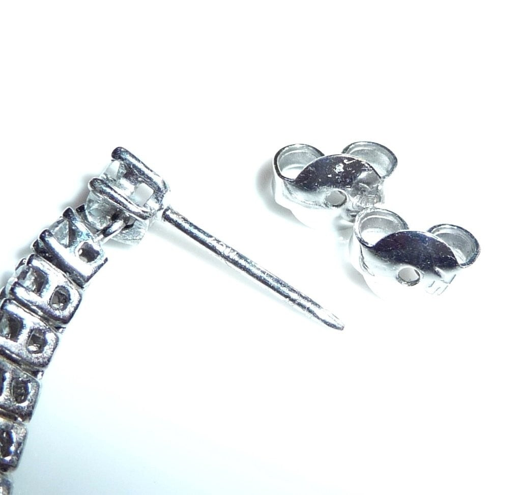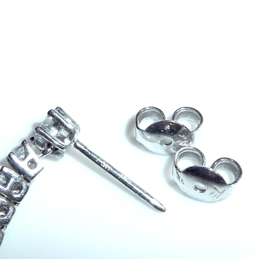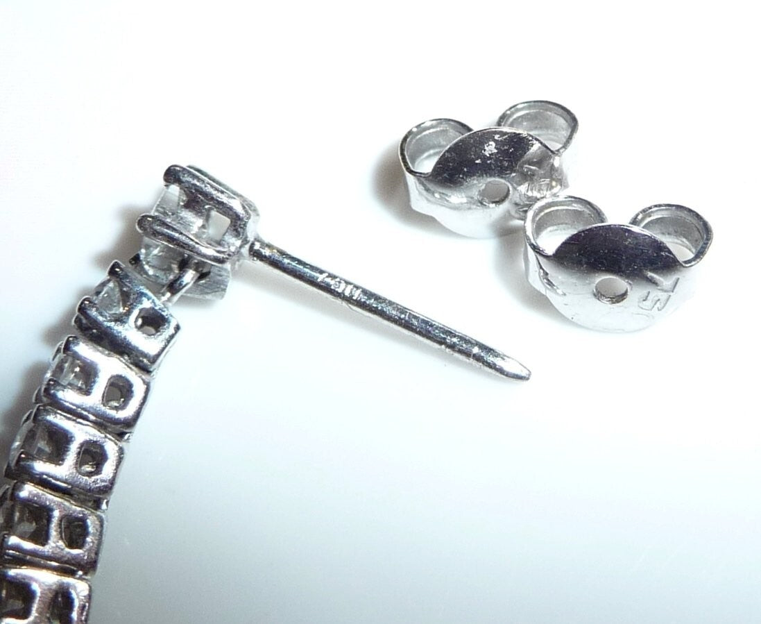 Ohrringe in 18 kt. / 750 Weißgold. Die Ohrringe sind als lange, sehr bewegliche Ohrhänger gearbeitet. Im oberen Bereich ist eine bewegliche Diamant-Kette mit jeweils 9 Diamanten im Brillantschliff. Zu oberst ist ein weiterer Diamant, der in sehr seltenem Sternschliff geschliffen ist. Die beiden Diamant-Sterne haben zusammen 0.20 ct. und 18 Diamanten im Brillantschliff haben zusammen ca. 0.55 ct. (G/VS-SI).