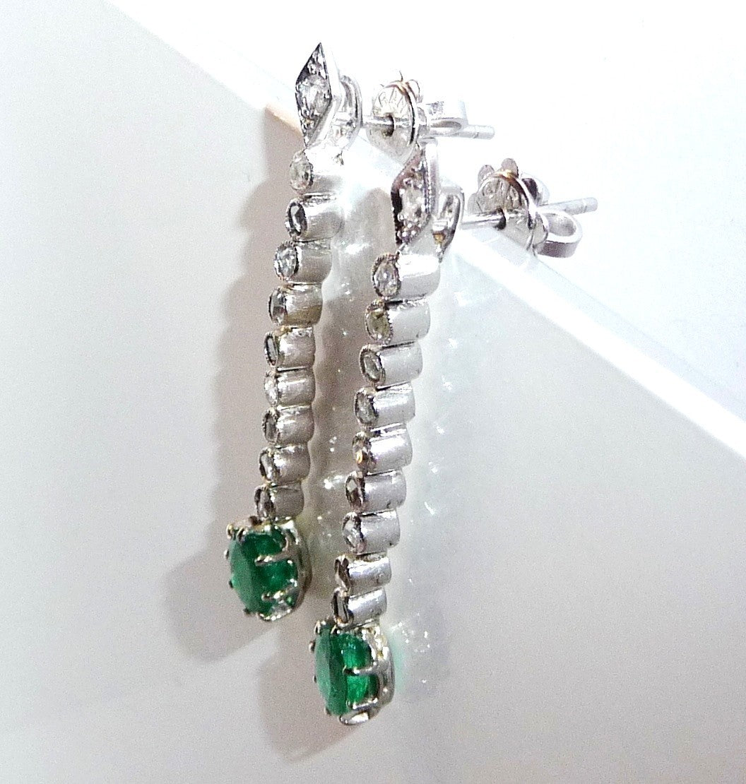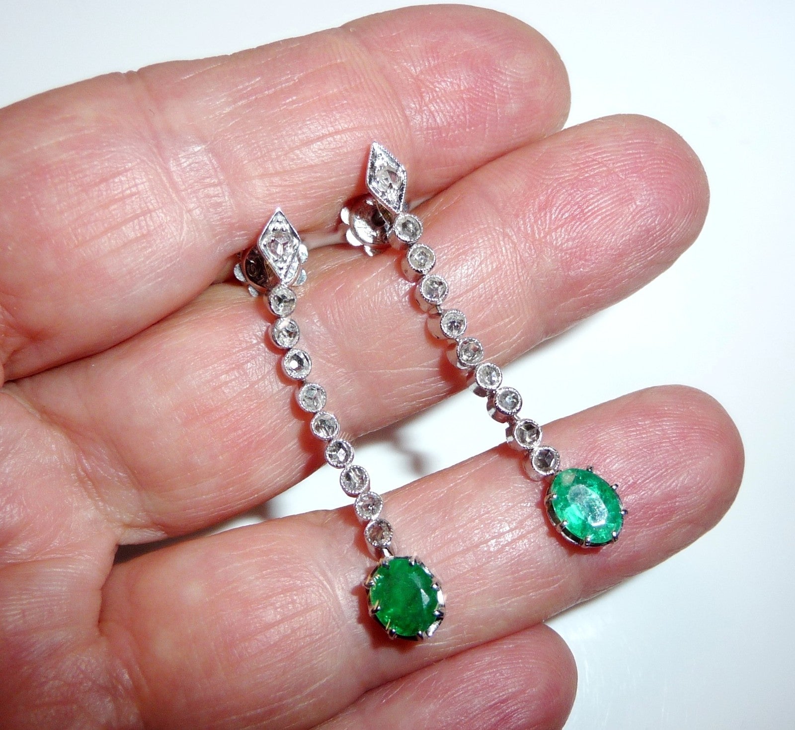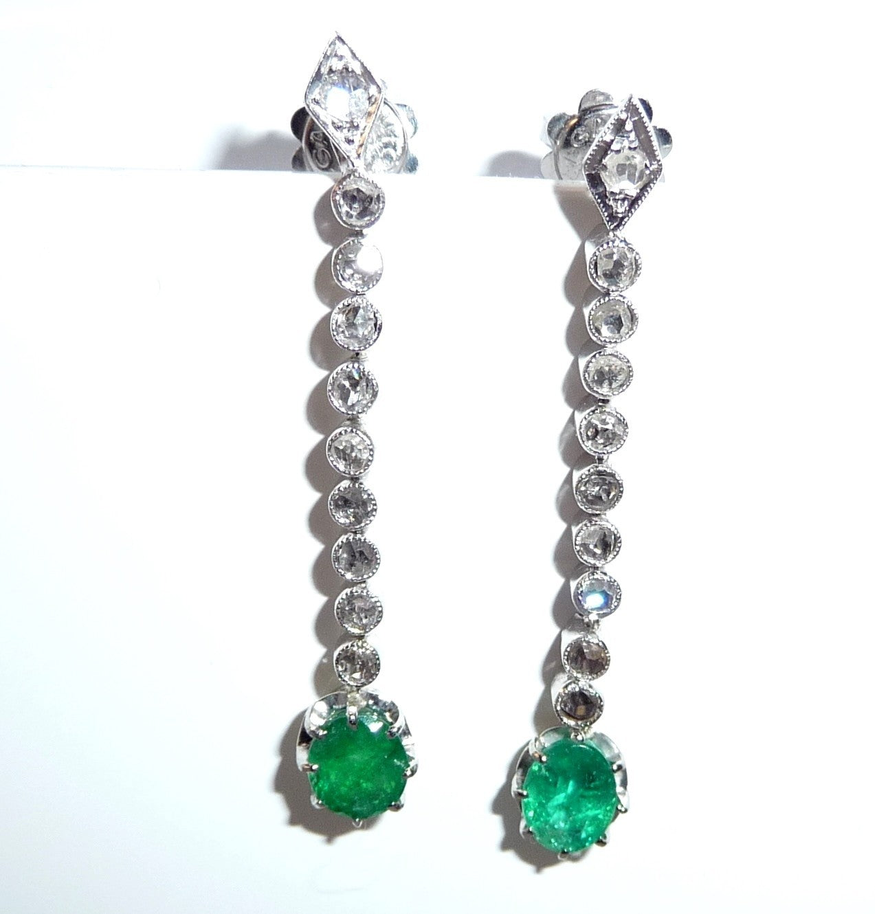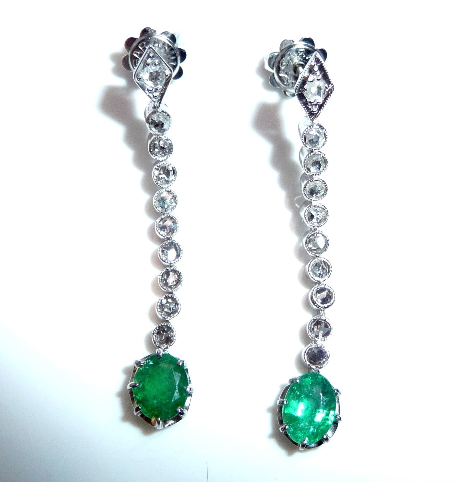 Antike Ohrringe in 750 / 18 K Weißgold. Die Ohrringe bestehen aus einer langen beweglichen Diamant-Kette, bei der jeder Diamant einzeln in einer Zargenfassung eingefasst ist. Am Ende der Diamantkette ist jeweils ein wunderschöner Smaragd in einem tiefen Grün eingefasst. Die beiden Smaragde sind oval geschliffen und haben zusammen etwa 1.20 ct. Das oberste Element ist Rauten-förmig (Rhombus).