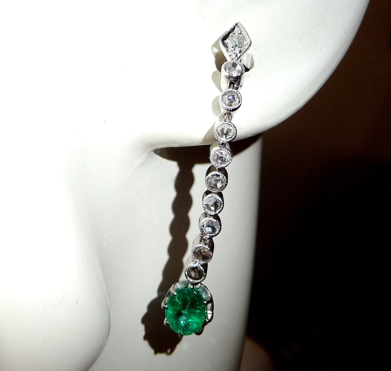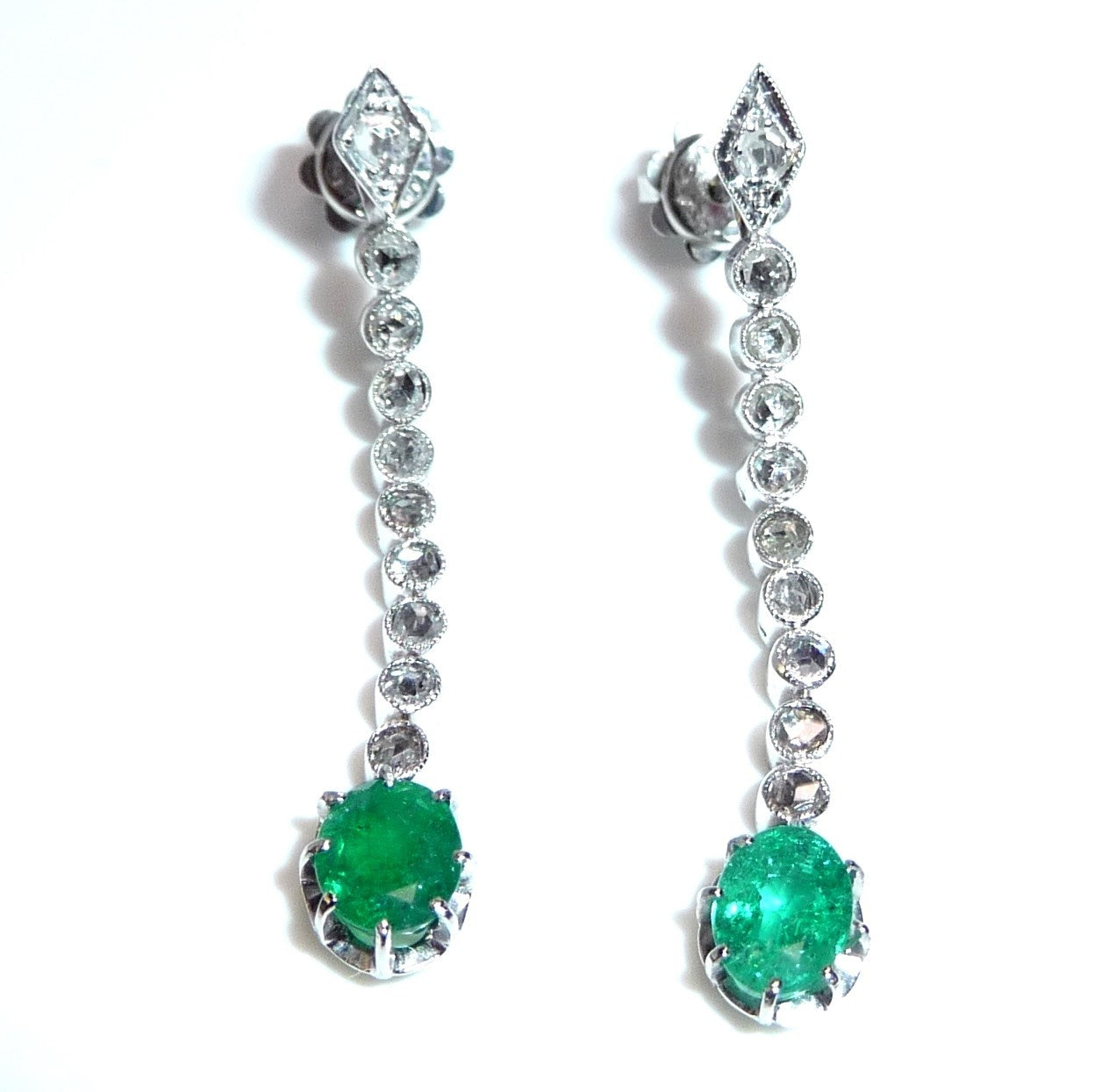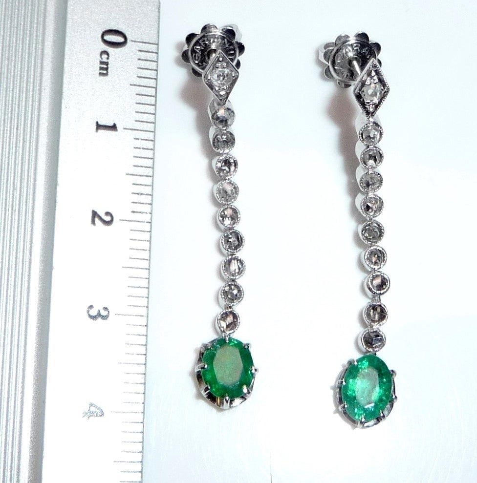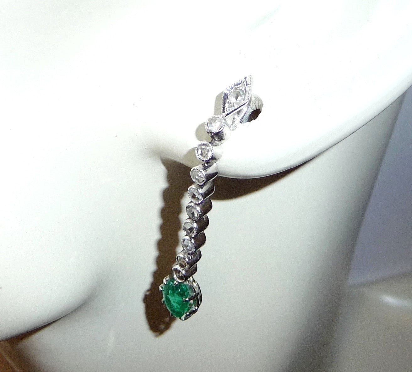 Antike Ohrringe in 750 / 18 K Weißgold. Die Ohrringe bestehen aus einer langen beweglichen Diamant-Kette, bei der jeder Diamant einzeln in einer Zargenfassung eingefasst ist. Am Ende der Diamantkette ist jeweils ein wunderschöner Smaragd in einem tiefen Grün eingefasst. Die beiden Smaragde sind oval geschliffen und haben zusammen etwa 1.20 ct. Das oberste Element ist Rauten-förmig (Rhombus).