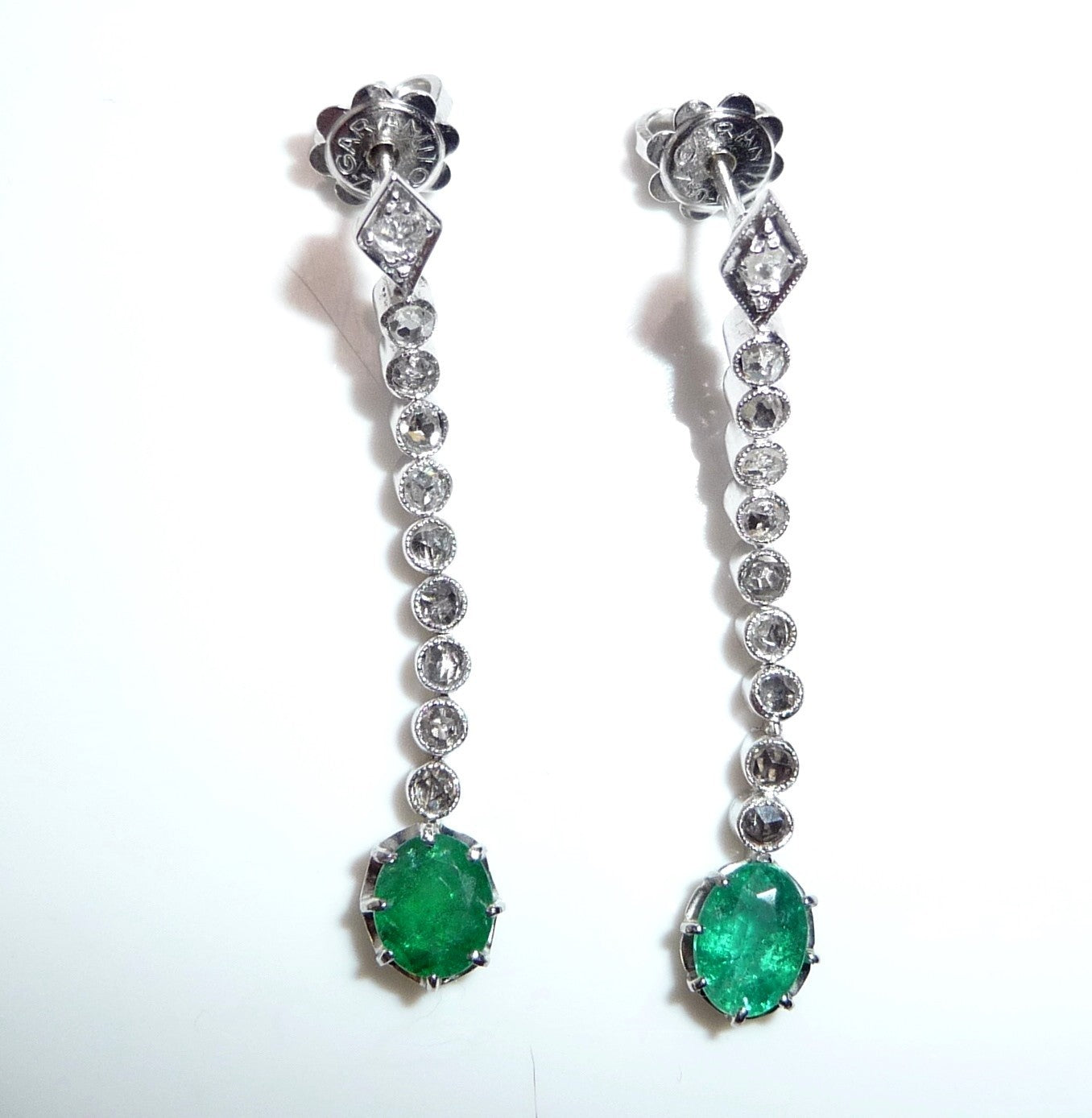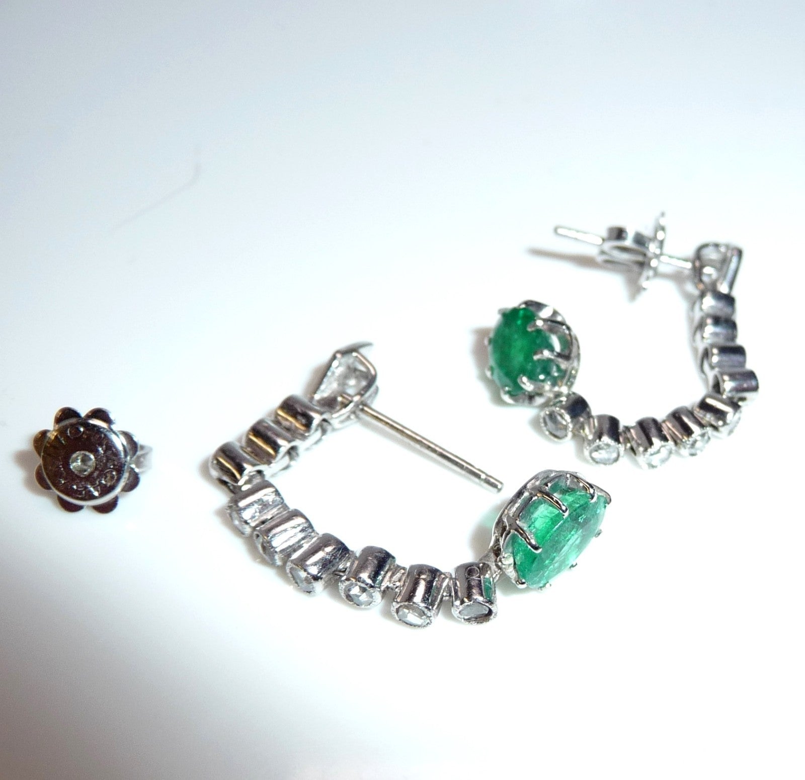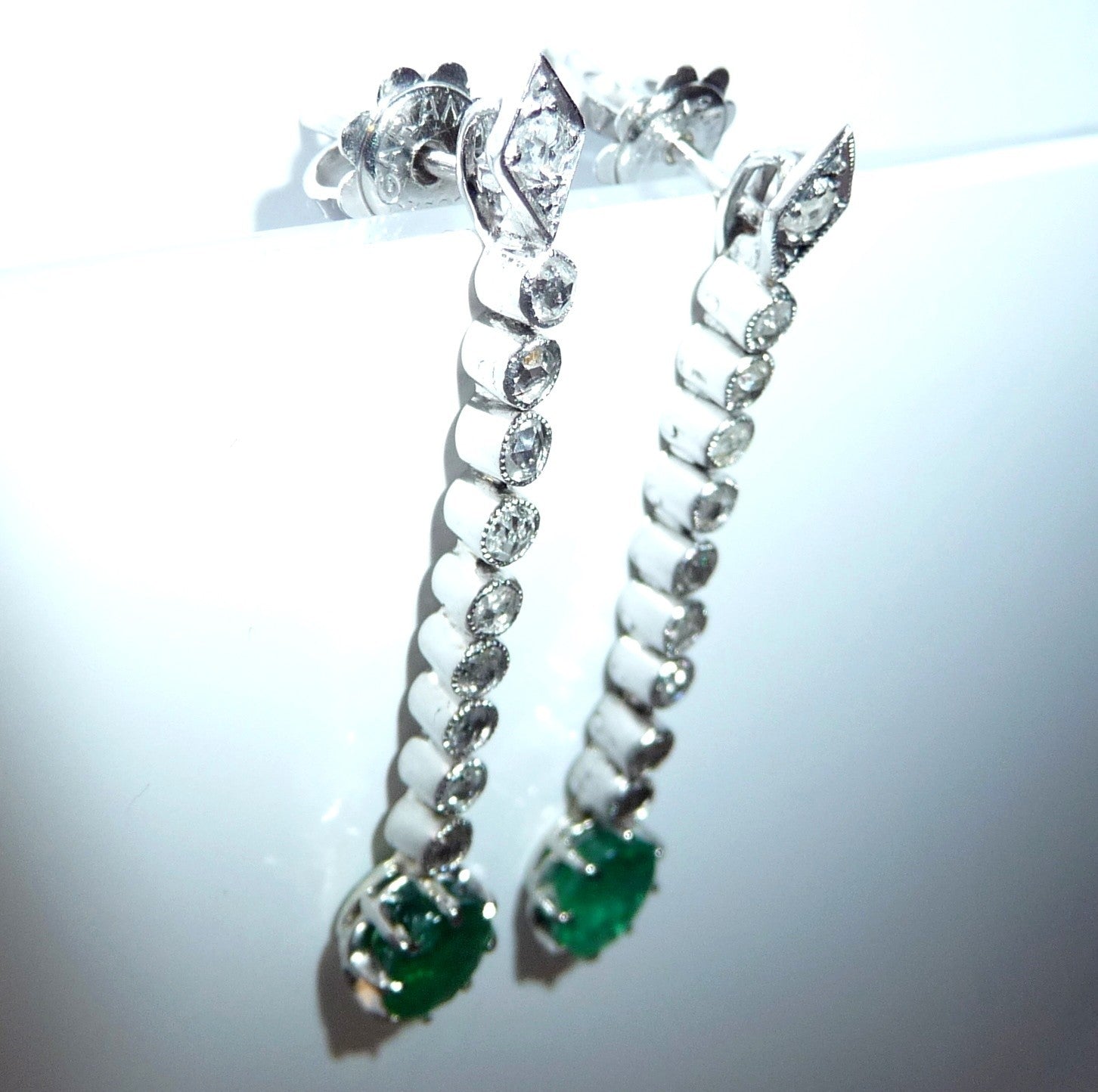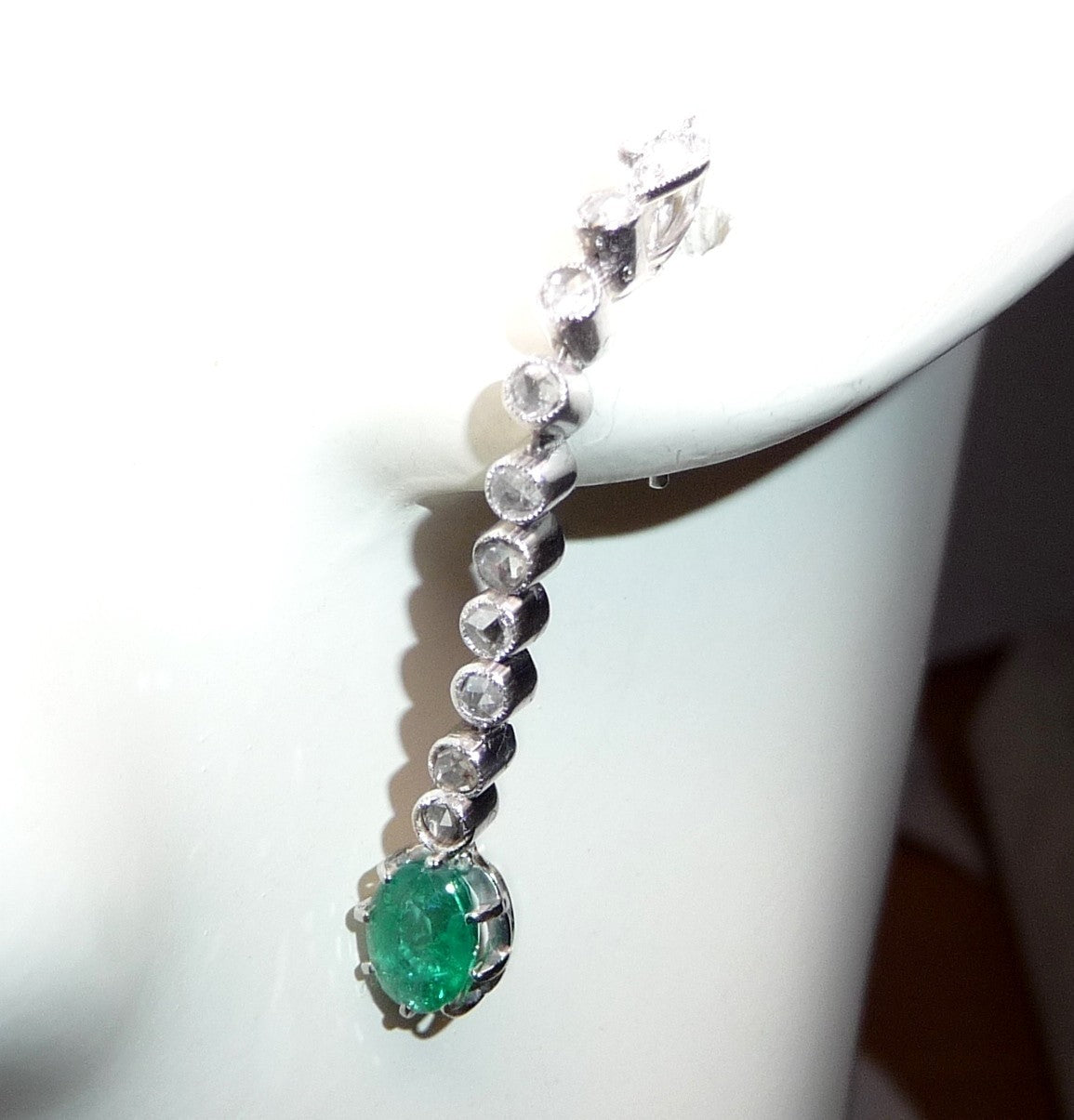 Antike Ohrringe in 750 / 18 K Weißgold. Die Ohrringe bestehen aus einer langen beweglichen Diamant-Kette, bei der jeder Diamant einzeln in einer Zargenfassung eingefasst ist. Am Ende der Diamantkette ist jeweils ein wunderschöner Smaragd in einem tiefen Grün eingefasst. Die beiden Smaragde sind oval geschliffen und haben zusammen etwa 1.20 ct. Das oberste Element ist Rauten-förmig (Rhombus).