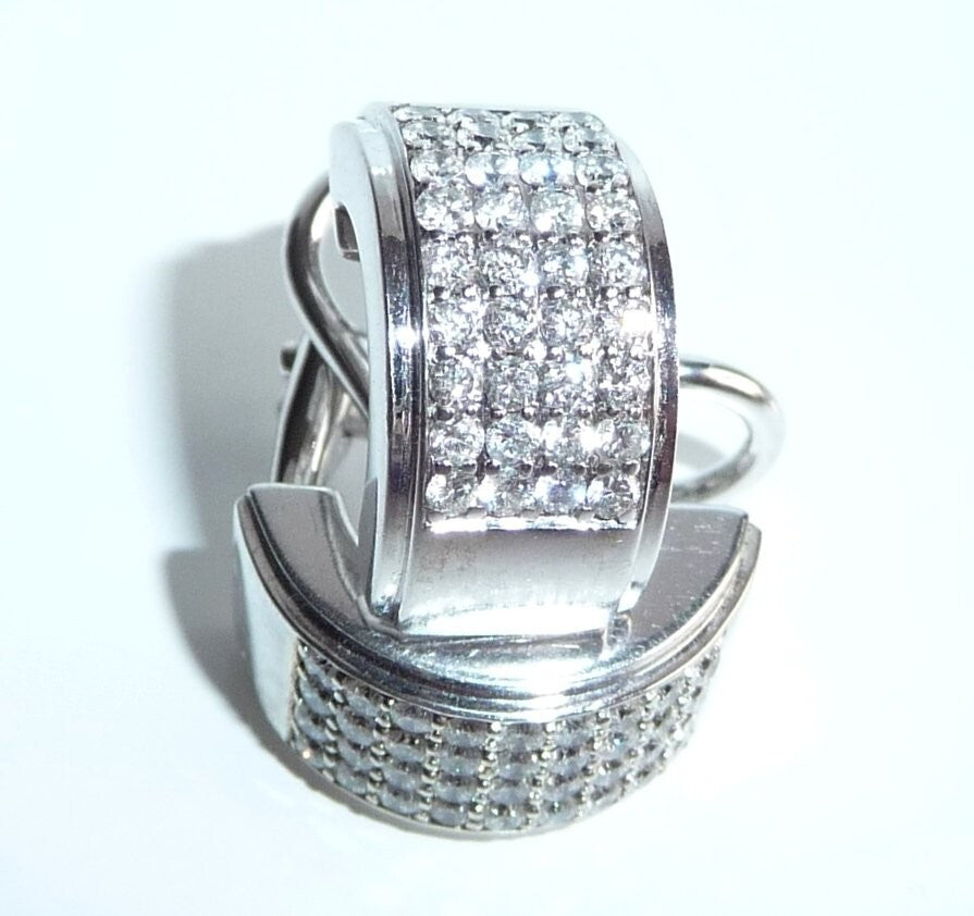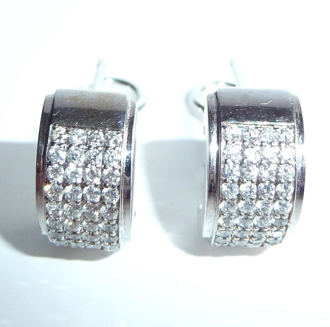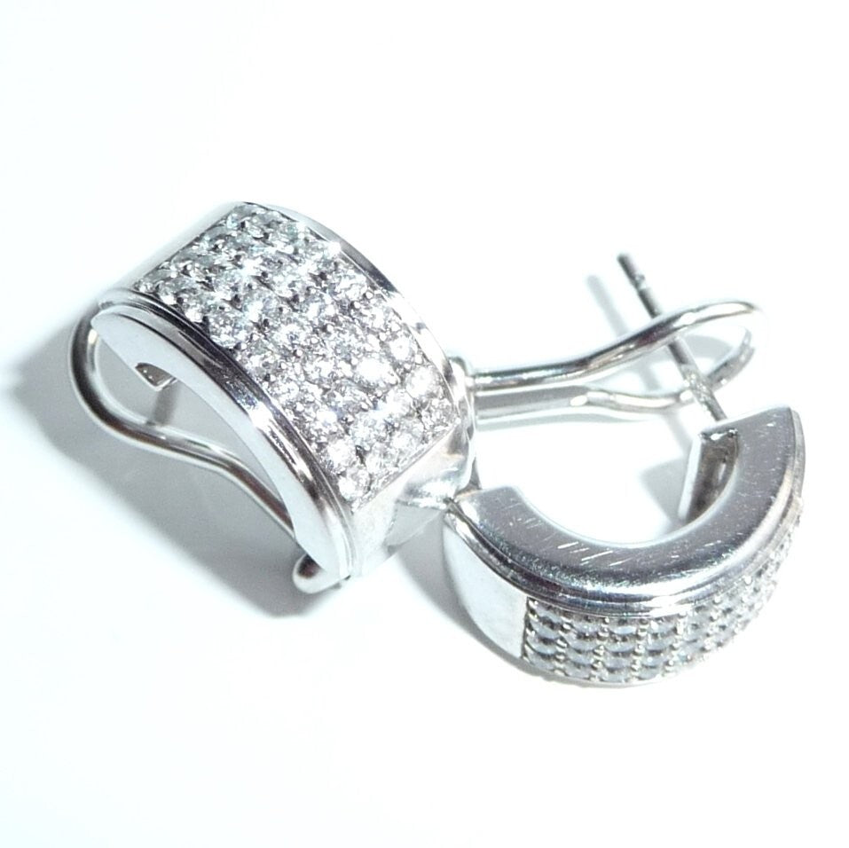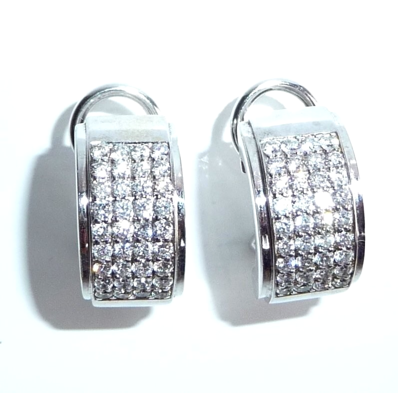Ohrringe in 585/ 14 Weißgold. Die breiten Ohrringe sind als Halb-Creolen gearbeitet. Die Rückseite ist mit einer glatten, auf Hochglanz polierten Rückwand ausgestattet, was die Ohrringe auch optisch schon sehr wertig macht. Auf der Vorderseite ist ein breites Feld von pavé gefasten Diamanten. Je Ohrringe geben 36 Diamanten im Brillant-Vollschliff ein imposantes Flächenfeuer an Brillanz. In 9 Reihen a 4 Diamanten sind die Diamanten komplett symmetrisch parallel angeordnet. Insgesamt haben die 72 Diamanten mindestens 1.0 ct.  mit Farbe F und Reinheit VS-VVS.