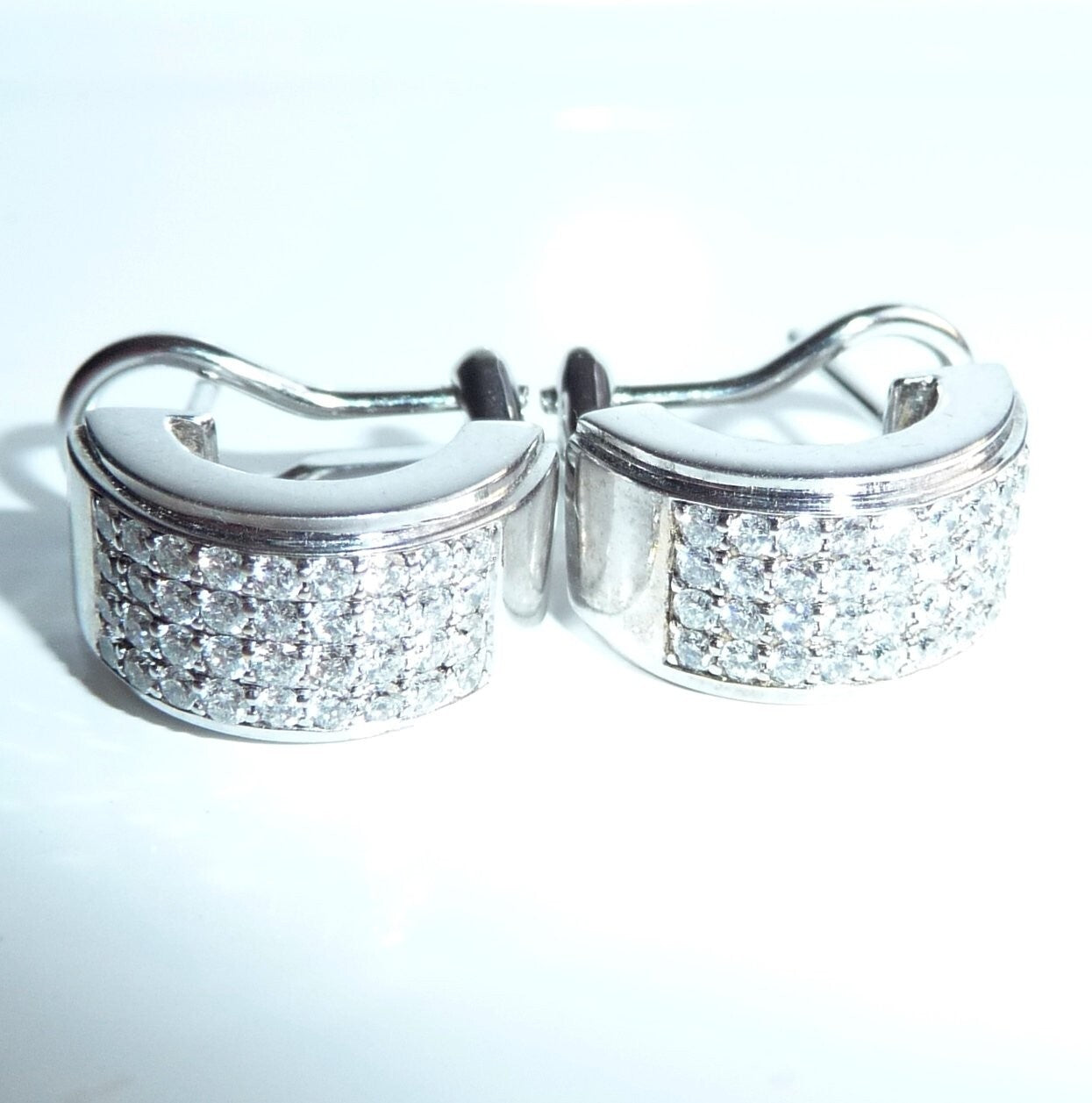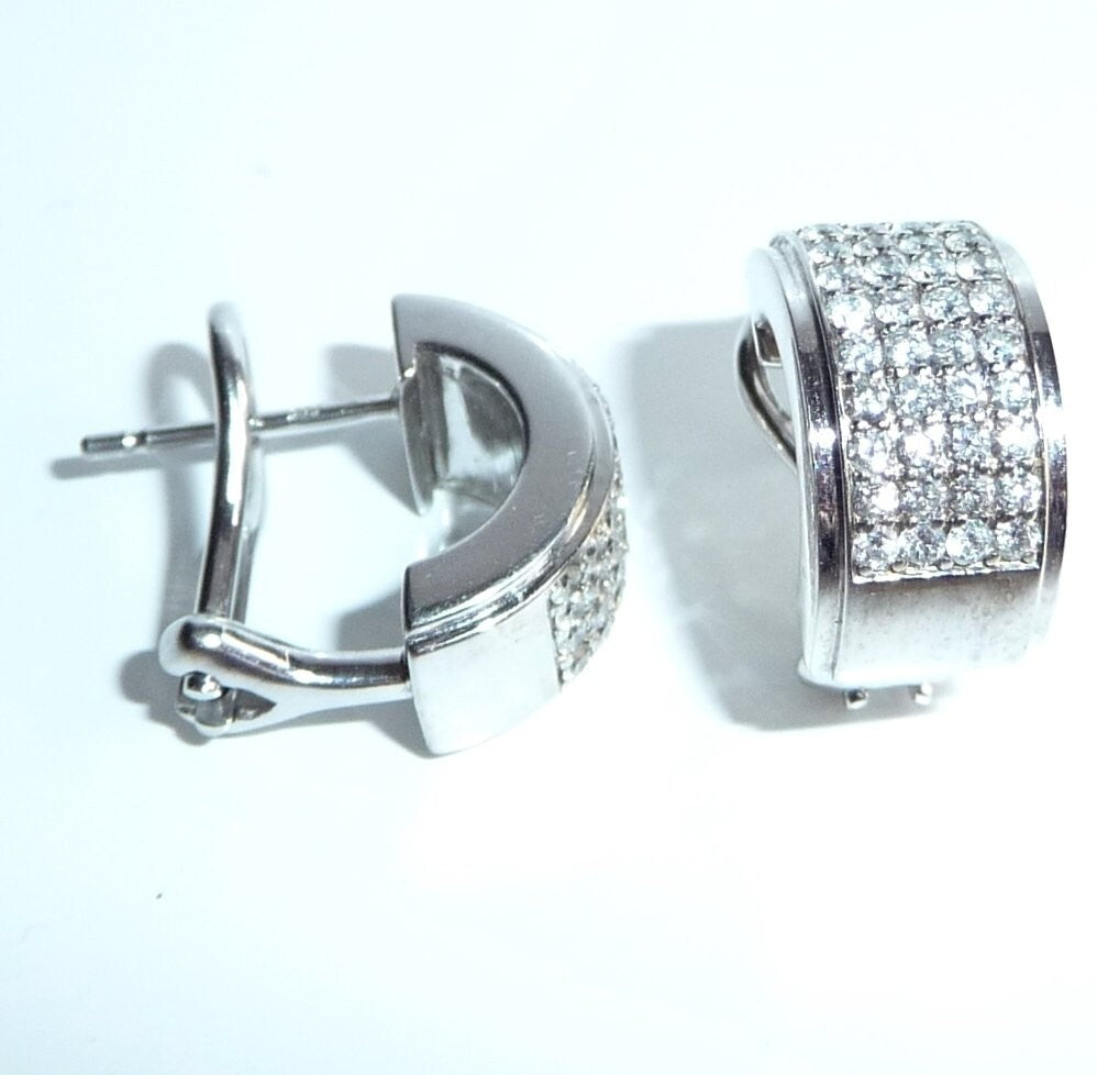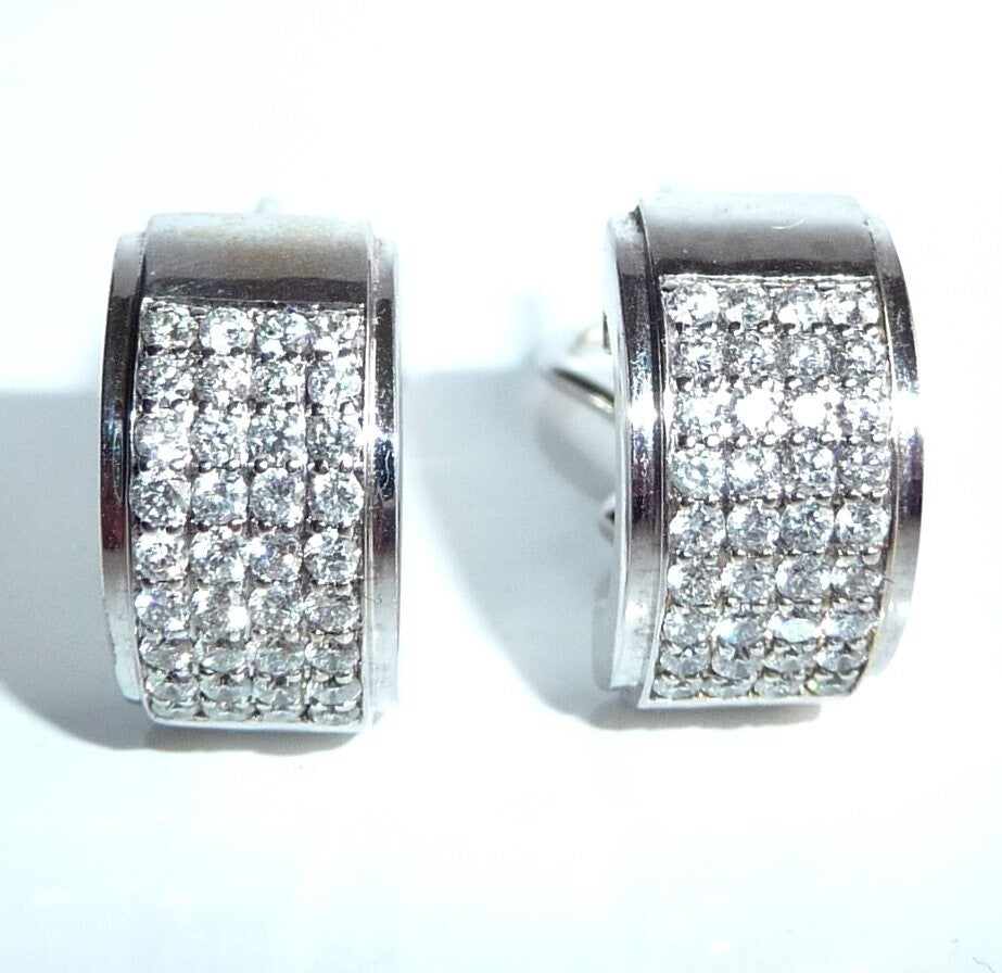 Ohrringe in 585/ 14 Weißgold. Die breiten Ohrringe sind als Halb-Creolen gearbeitet. Die Rückseite ist mit einer glatten, auf Hochglanz polierten Rückwand ausgestattet, was die Ohrringe auch optisch schon sehr wertig macht. Auf der Vorderseite ist ein breites Feld von pavé gefasten Diamanten. Je Ohrringe geben 36 Diamanten im Brillant-Vollschliff ein imposantes Flächenfeuer an Brillanz. In 9 Reihen a 4 Diamanten sind die Diamanten komplett symmetrisch parallel angeordnet. Insgesamt haben die 72 Diamanten mindestens 1.0 ct.  mit Farbe F und Reinheit VS-VVS.