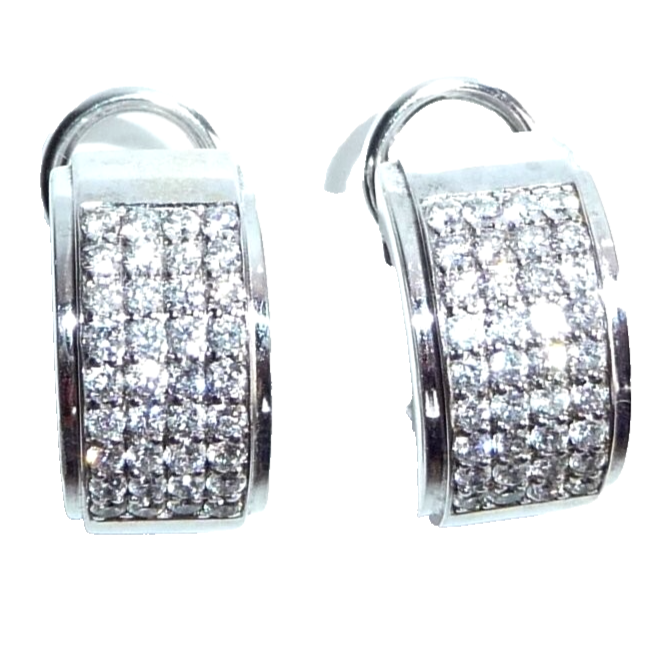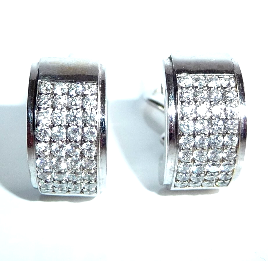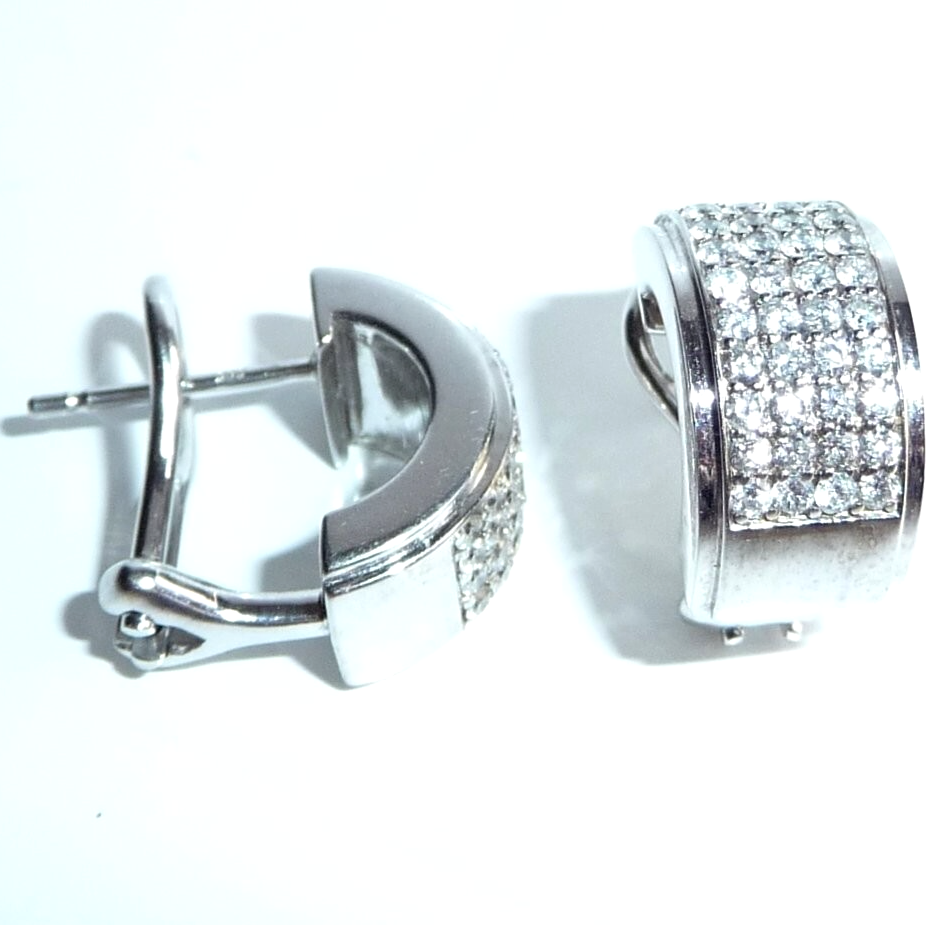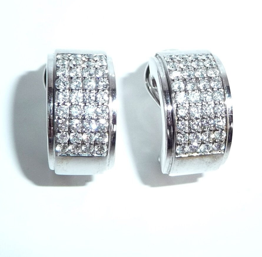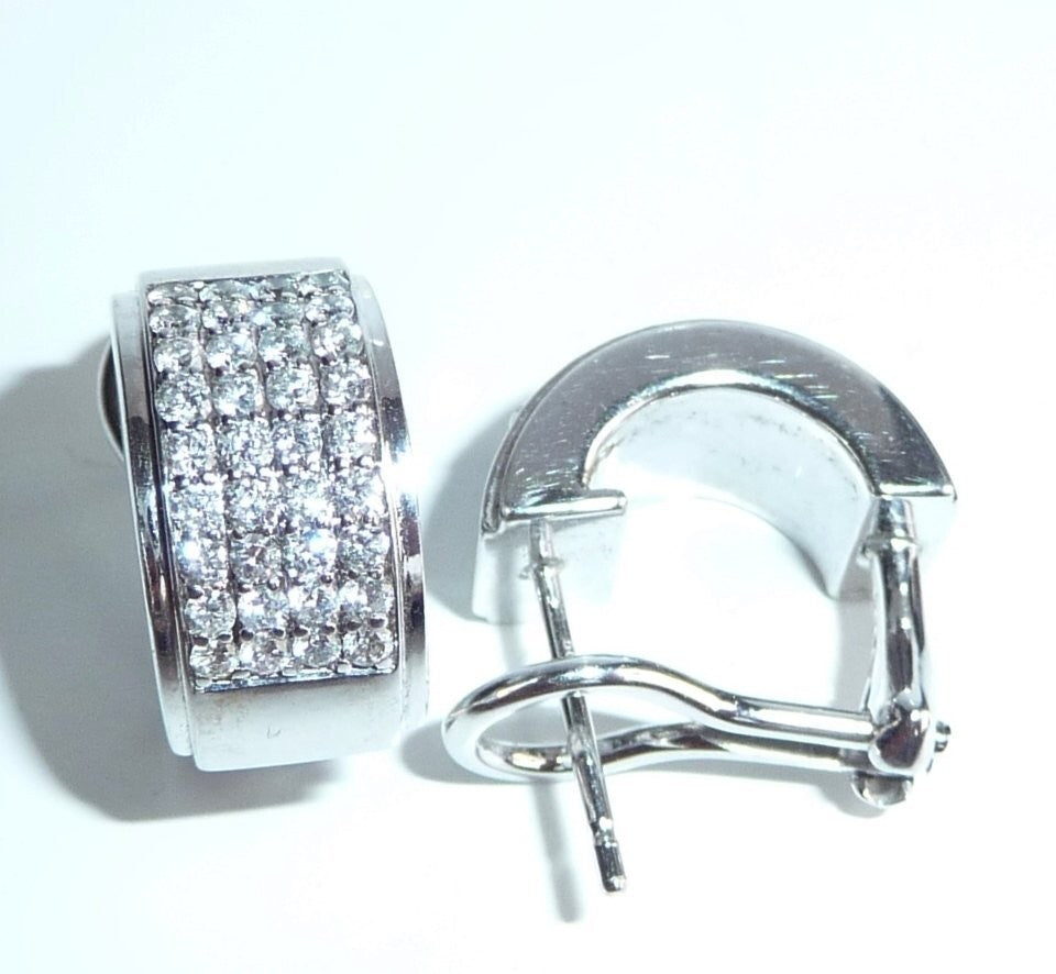 Ohrringe in 585/ 14 Weißgold. Die breiten Ohrringe sind als Halb-Creolen gearbeitet. Die Rückseite ist mit einer glatten, auf Hochglanz polierten Rückwand ausgestattet, was die Ohrringe auch optisch schon sehr wertig macht. Auf der Vorderseite ist ein breites Feld von pavé gefasten Diamanten. Je Ohrringe geben 36 Diamanten im Brillant-Vollschliff ein imposantes Flächenfeuer an Brillanz. In 9 Reihen a 4 Diamanten sind die Diamanten komplett symmetrisch parallel angeordnet. Insgesamt haben die 72 Diamanten ca. 1.00 ct. mit sehr heller Farbe und guter Reinheit