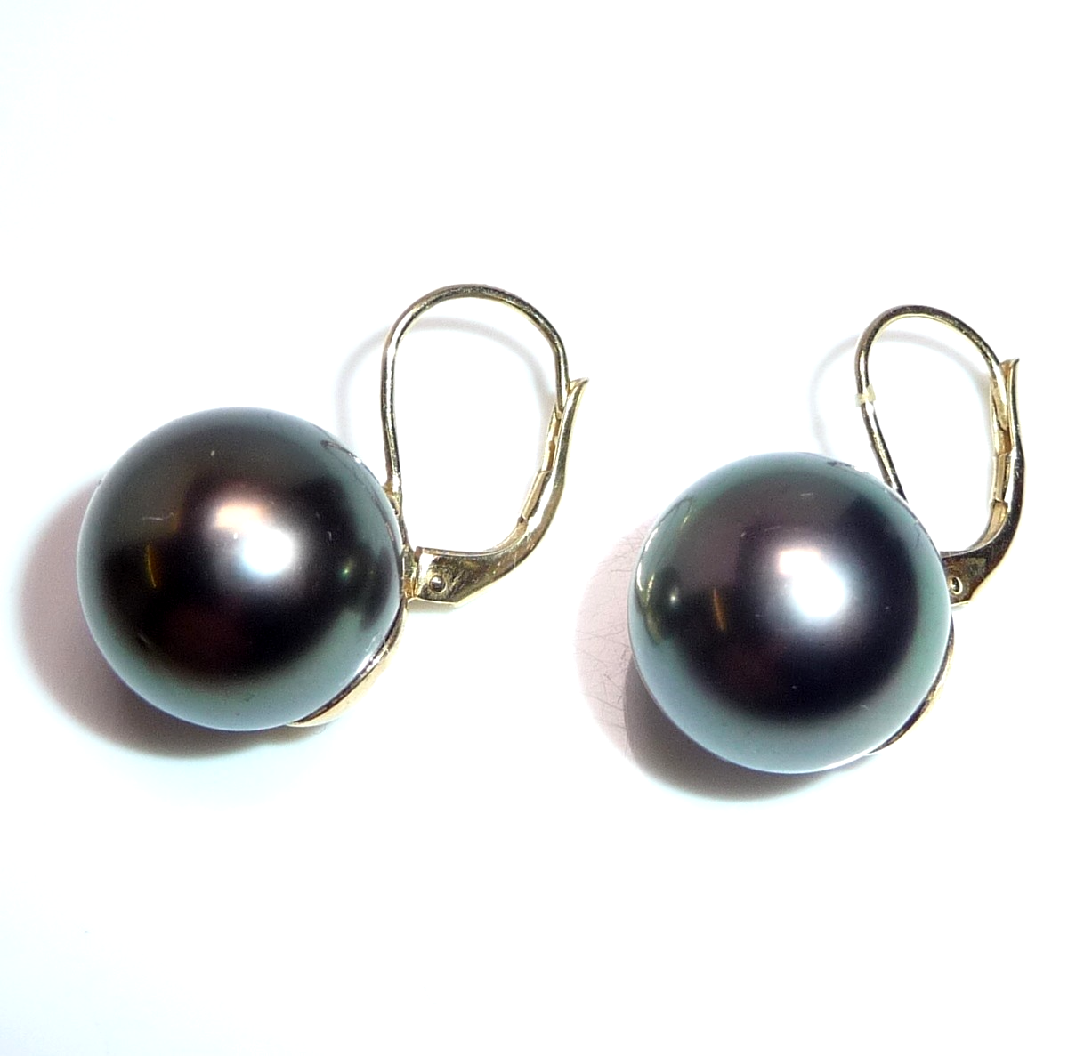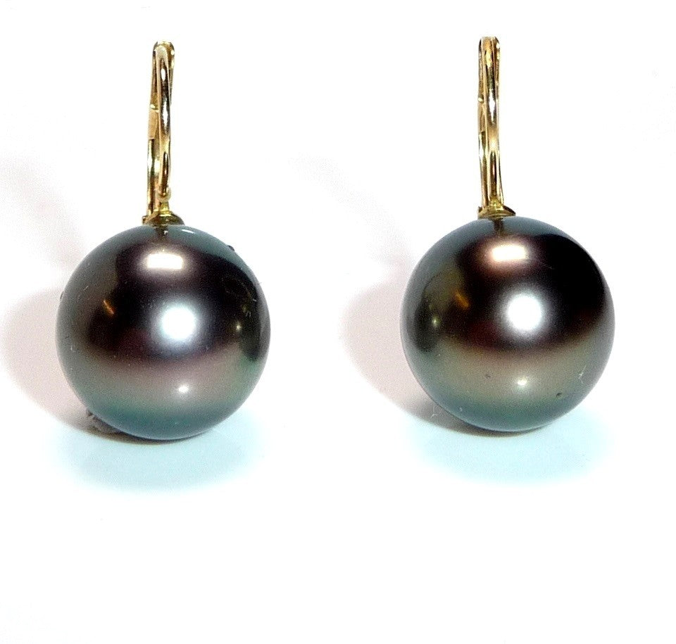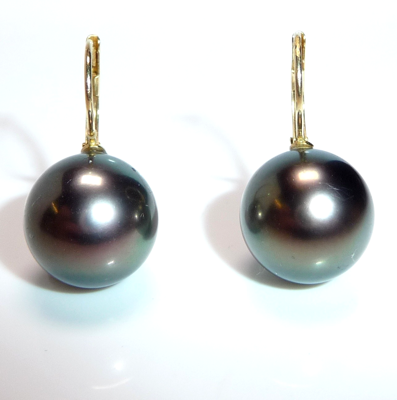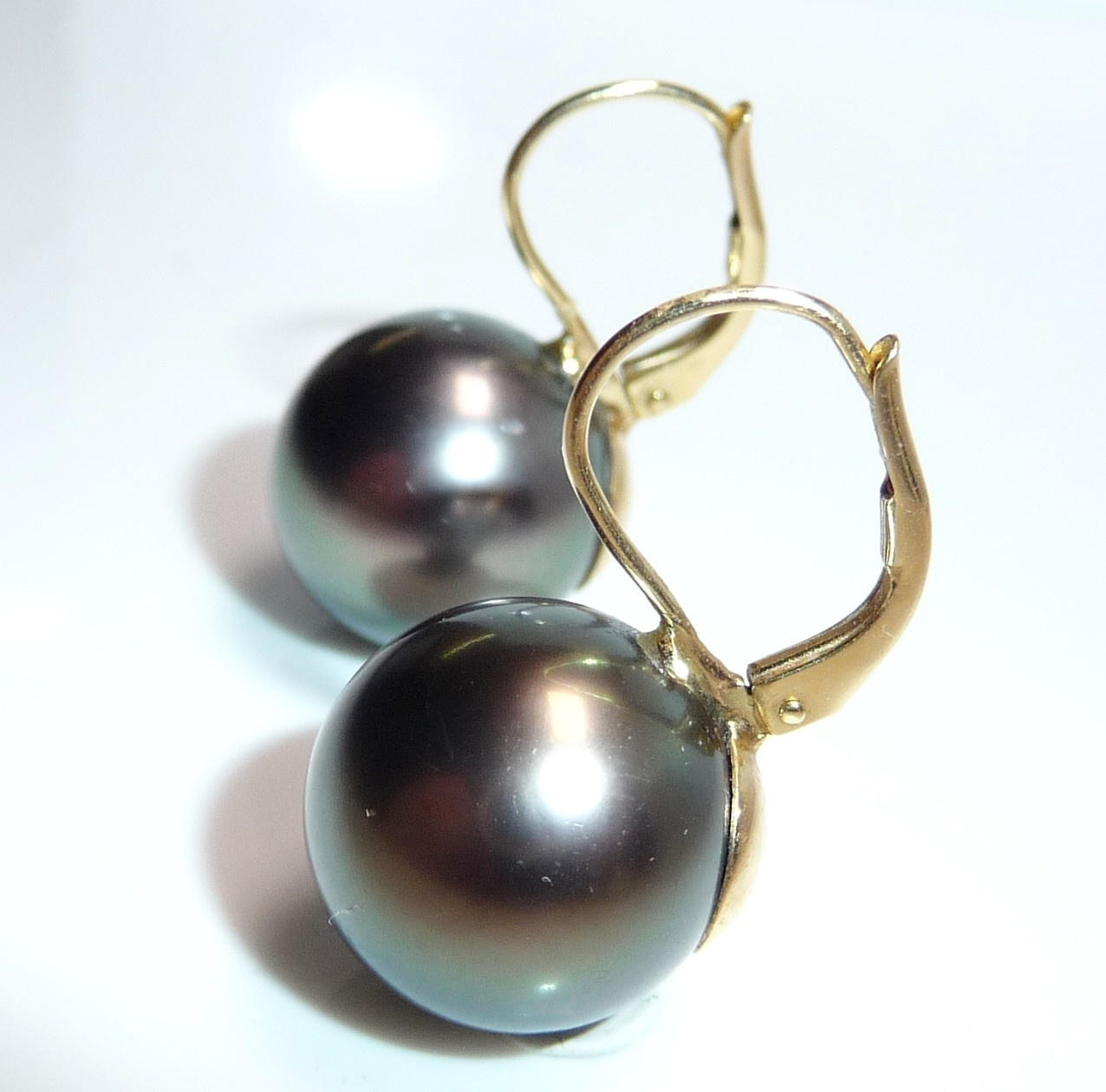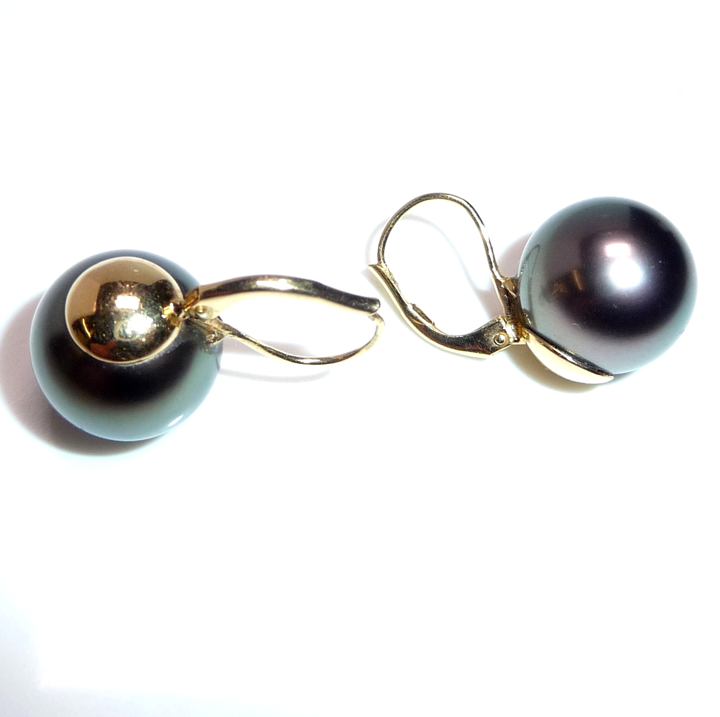 Ohrringe Ohrhänger 750 Gelbgold Tahiti Perlen 7,55g Perlen 12,7 mm anthrazit