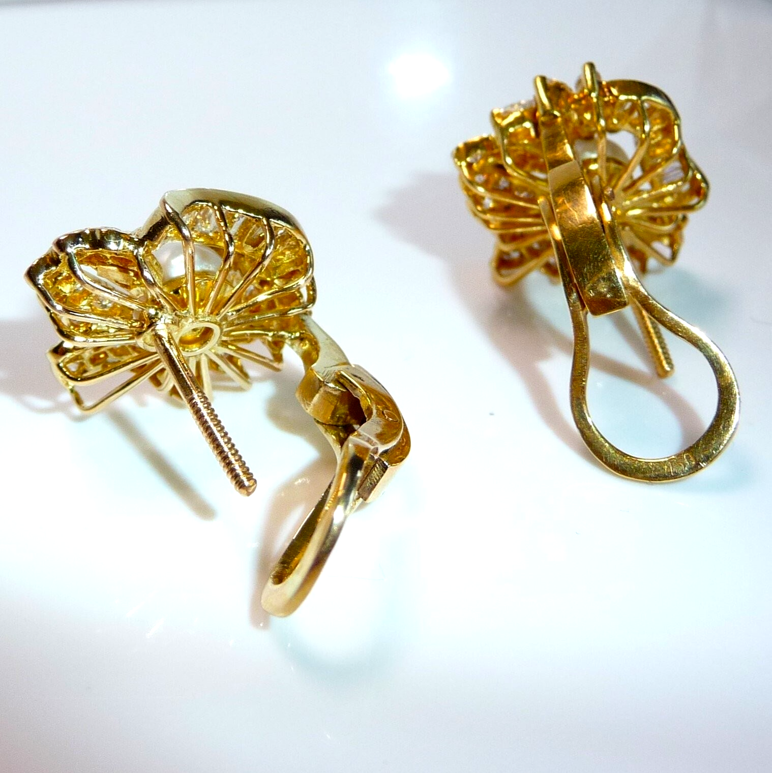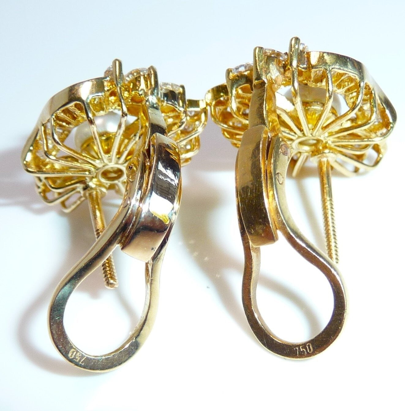 Ohrringe in 750/ 18 K Gelbgold. Die Ohrringe sind Goldschmiede-Arbeiten von Hand mit einem sehr komplexen formalen Aufbau aus unterschiedlichen Elementen. Insgesamt sehen die Ohrringe aus, wie Blüten. Jeder Ohrringe hat 48 Diamanten eingefasst. Insgesamt haben die 98 Diamanten etwa 2.60 ct. mit Farbe G-F und Reinheit im Durchschnitt SI2-VS.