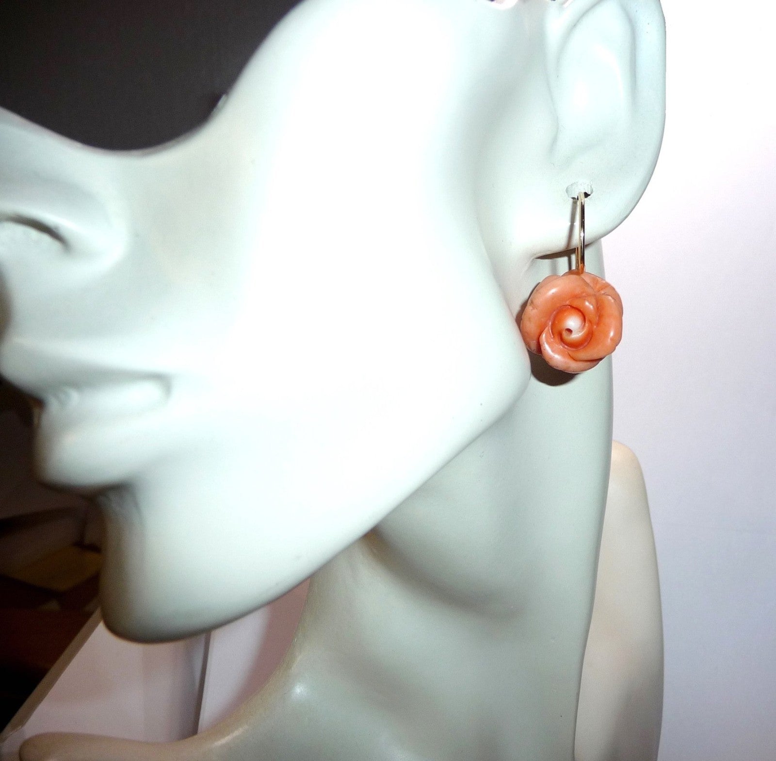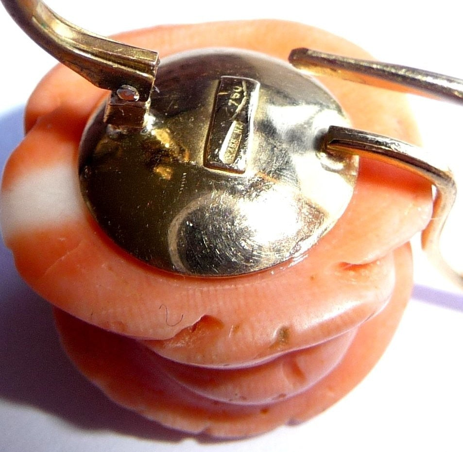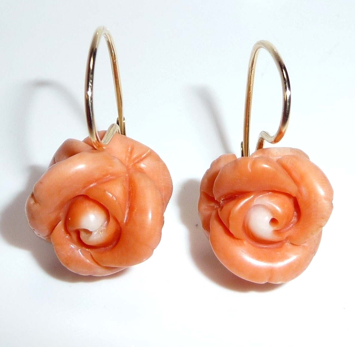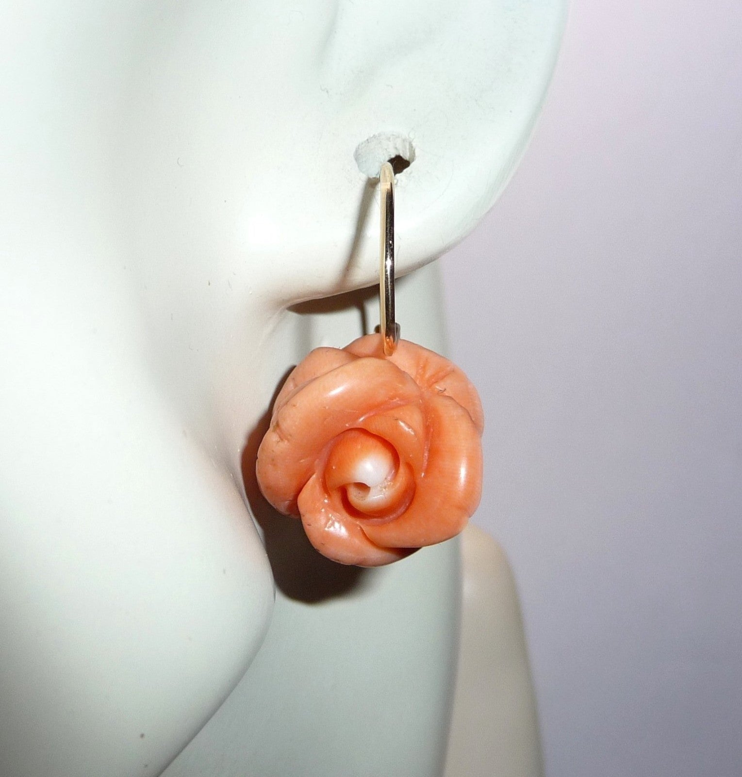 Die Ohr-Brisuren sind von Hand geformt und schön groß, so dass die Korallen-Rosen optimal unter dem Ohrläppchen hängen. Italienische Meisterarbeit.