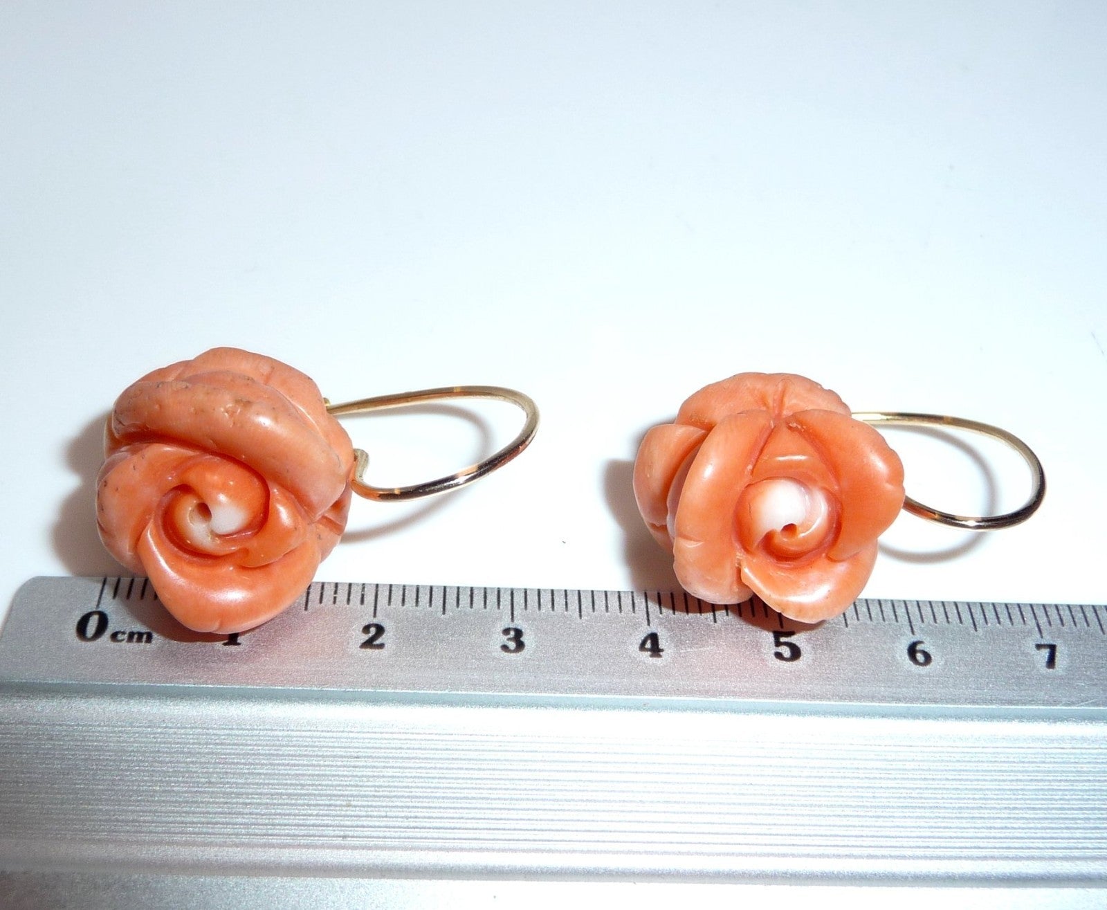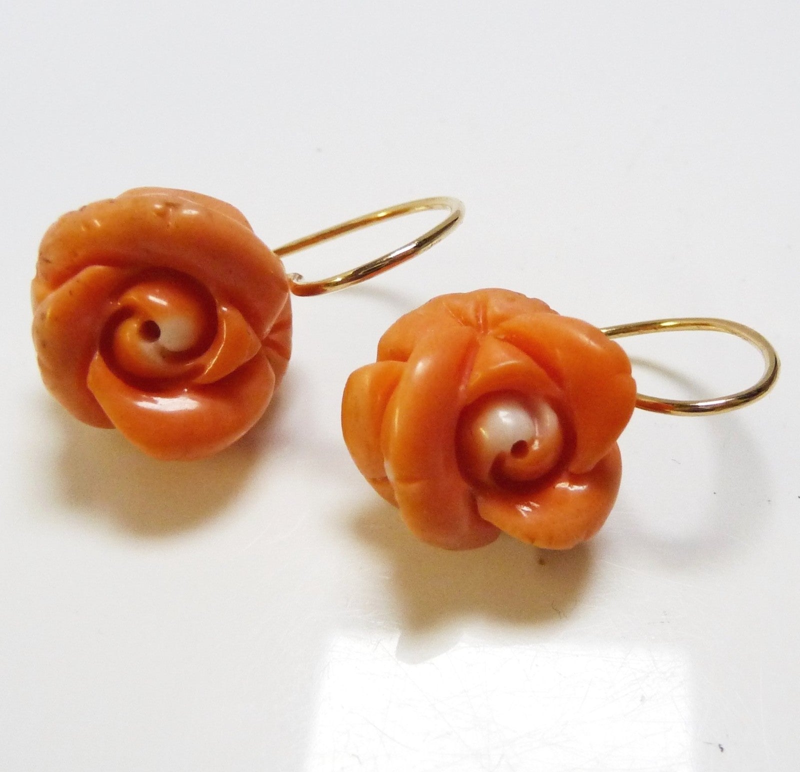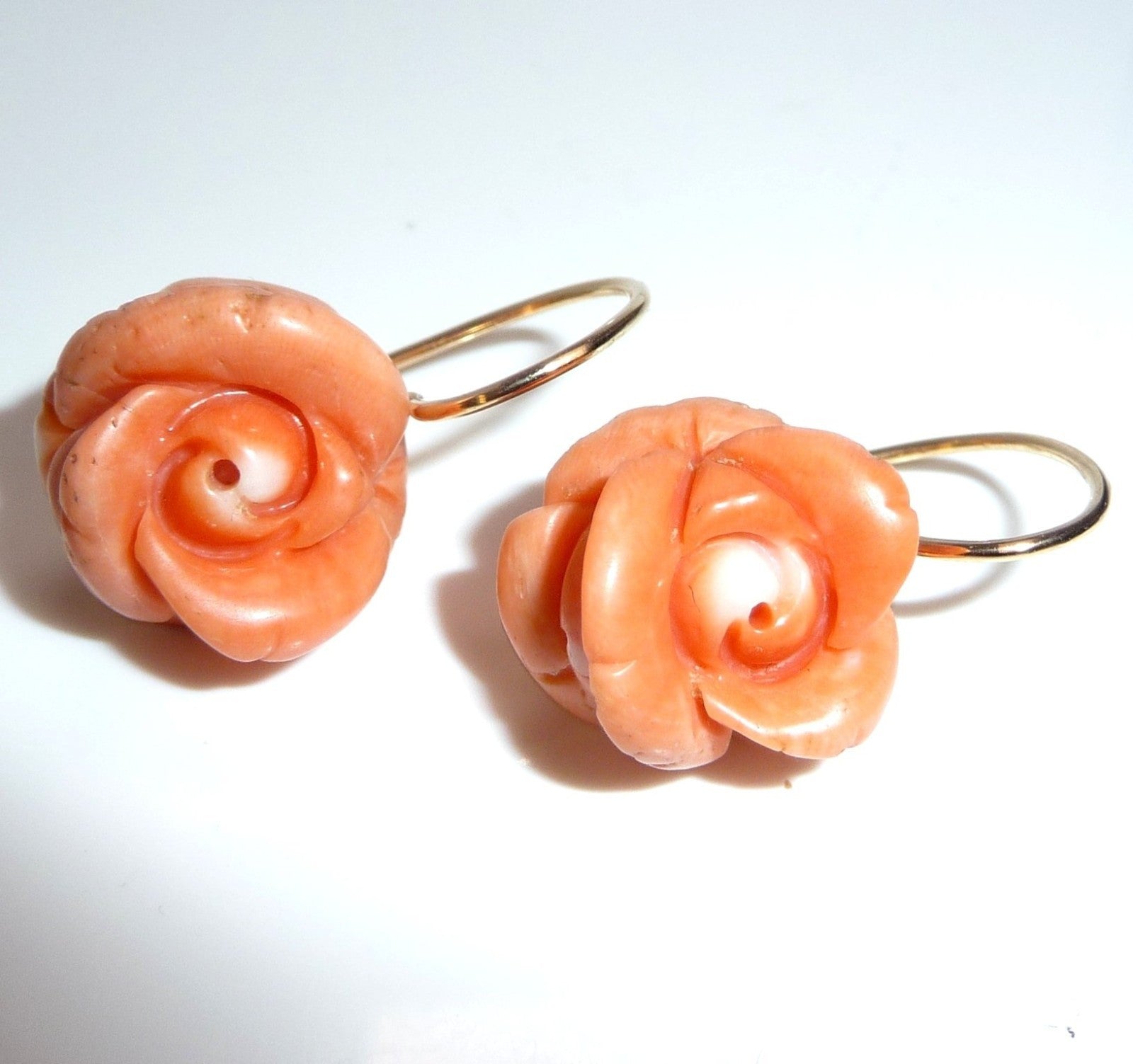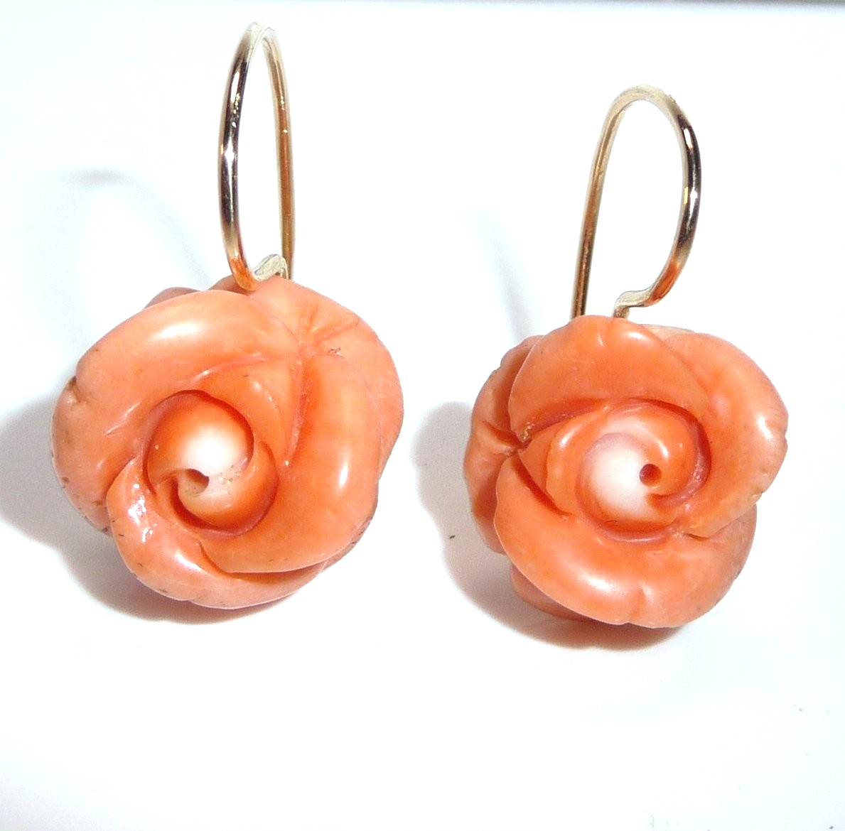 Die Ohr-Brisuren sind von Hand geformt und schön groß, so dass die Korallen-Rosen optimal unter dem Ohrläppchen hängen. Italienische Meisterarbeit.