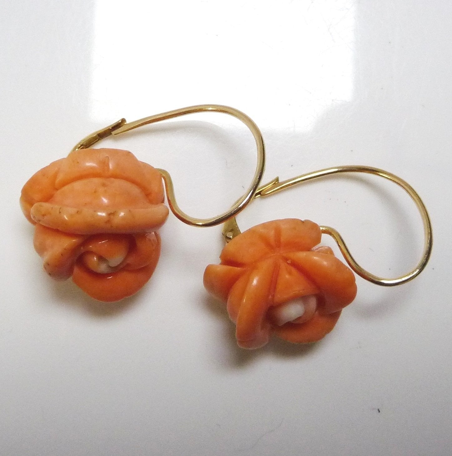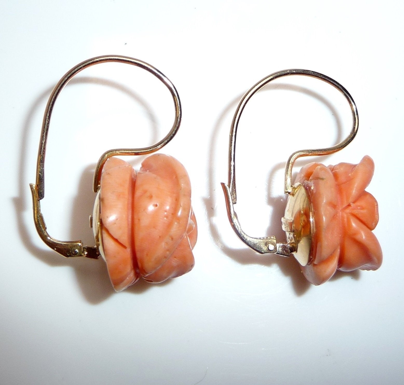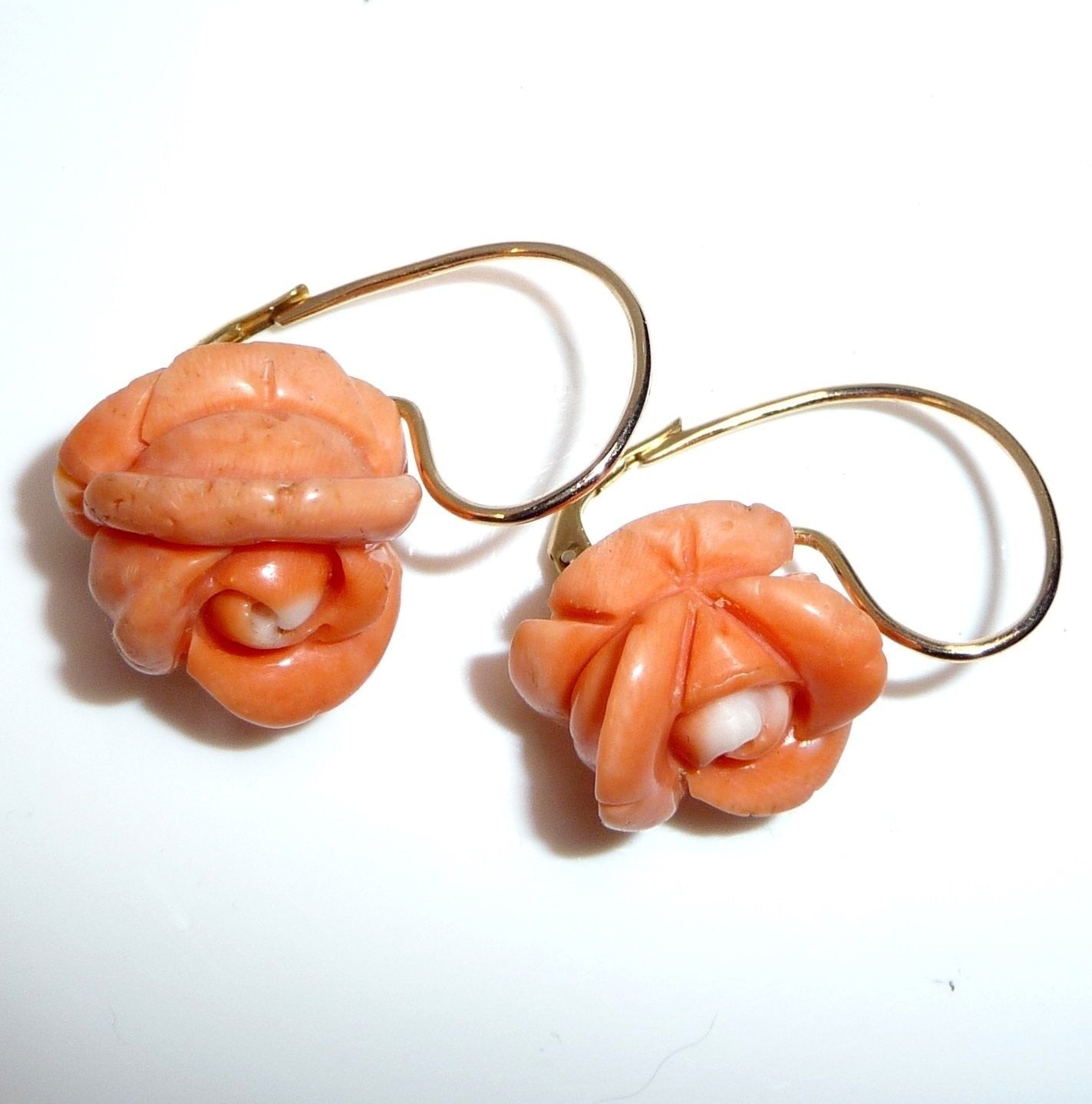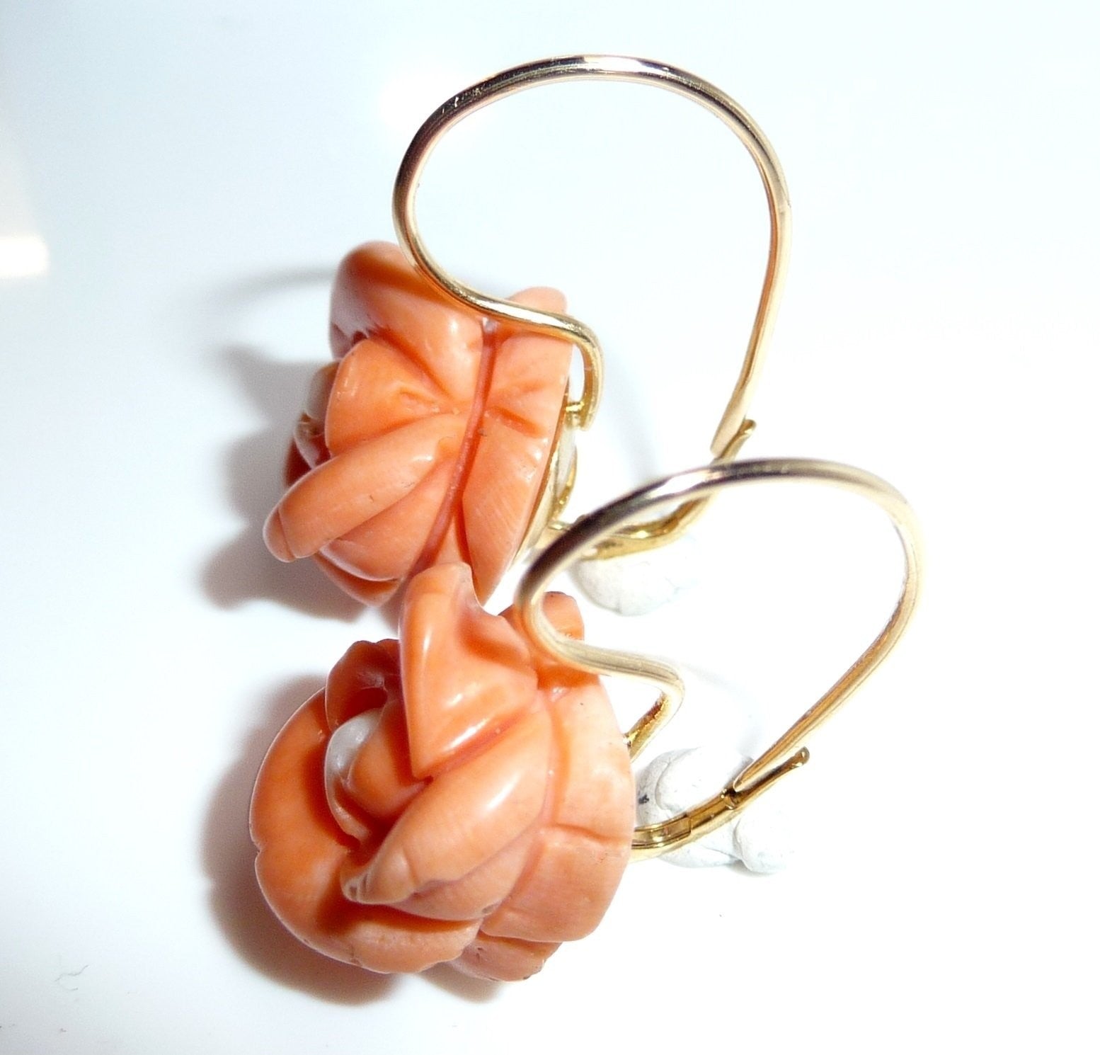 Die Ohr-Brisuren sind von Hand geformt und schön groß, so dass die Korallen-Rosen optimal unter dem Ohrläppchen hängen. Italienische Meisterarbeit.