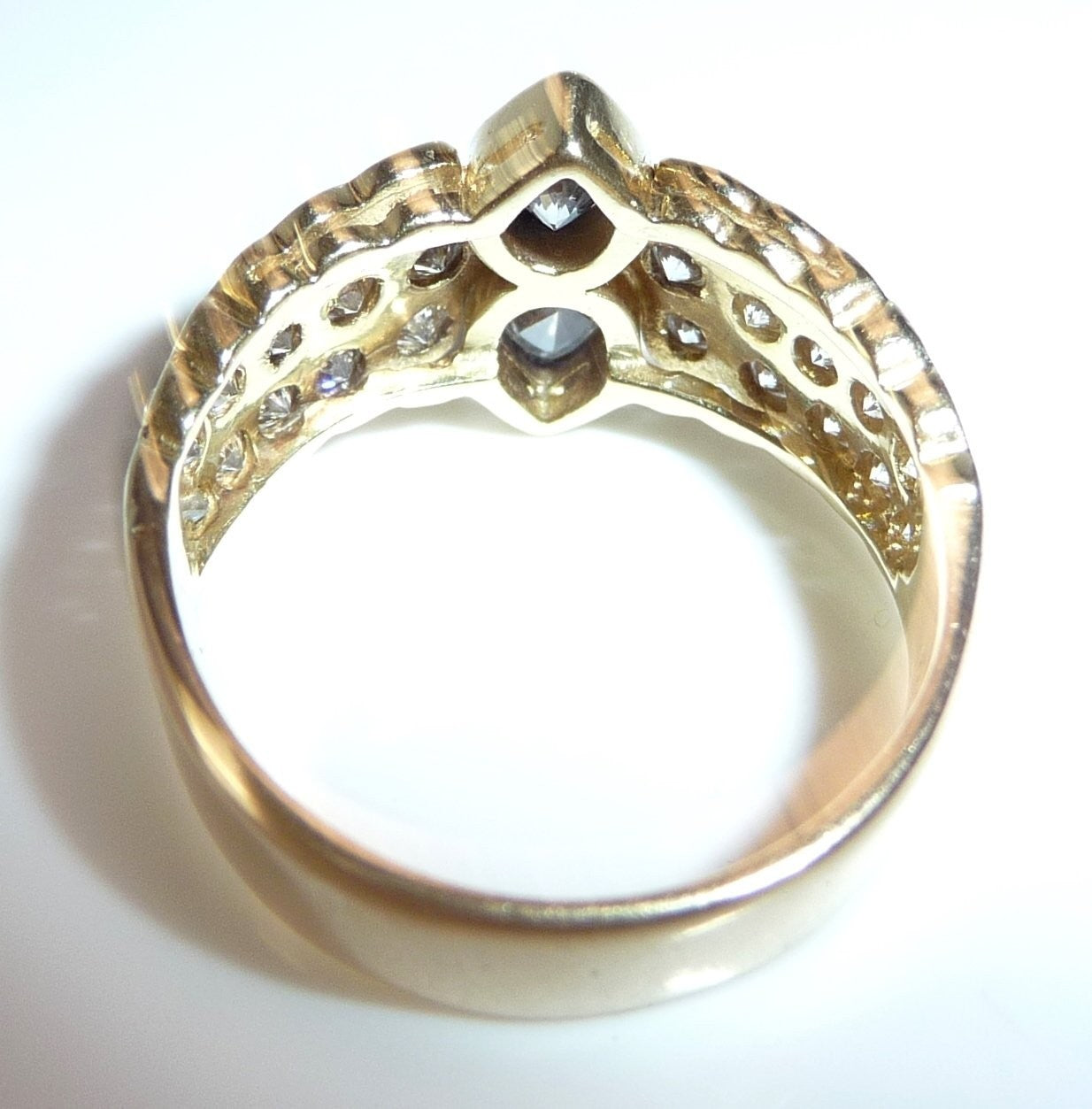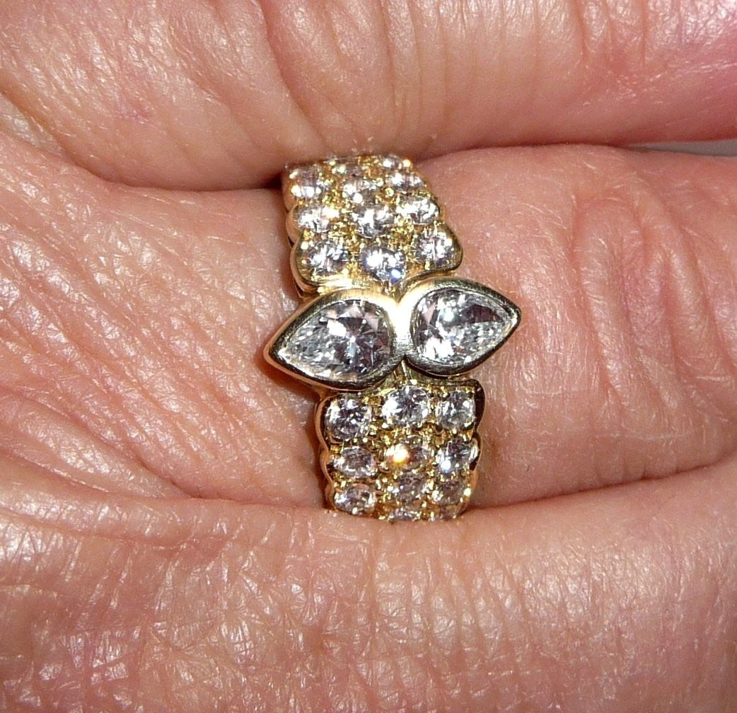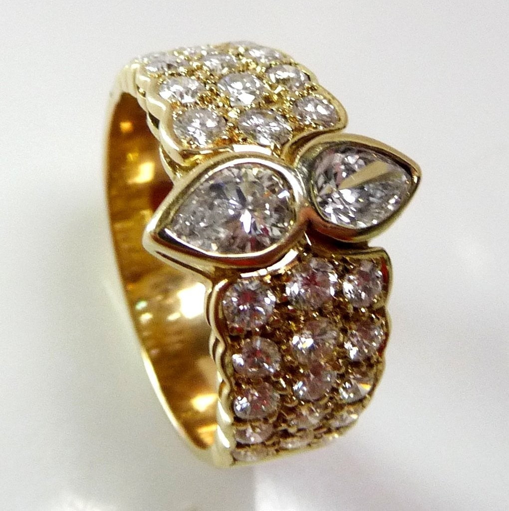 Ring in 585/ 14 K Gelbgold. Der breite Bandring ist besetzt mit insgesamt 32 Diamanten von total 1.80 ct.