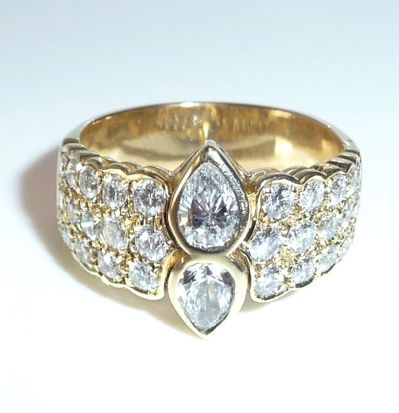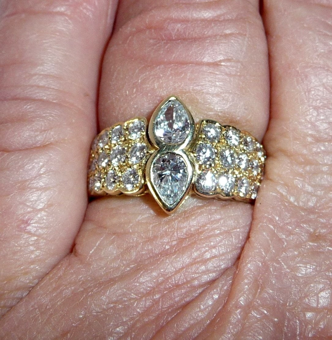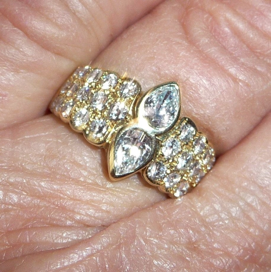 Im Zentrum begegnen sich zwei Diamanten im Tropfenschliff (Pear Cut). Die beiden Diamanten haben zusammen 0.52 ct. (G-F/VS). Auf breiter Fläche sind dann jeweils 3 Diamanten im Brillantschliff parallel angeordnet in 5 Reihen. Die Diamanten haben eine außerordentlich gute Qualität mit Farbe F und Reinheit VVS. Die Fläche funkelt bei jeder Bewegung.